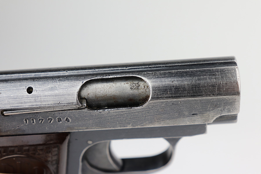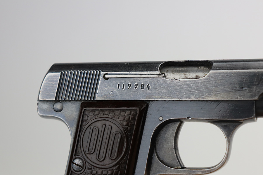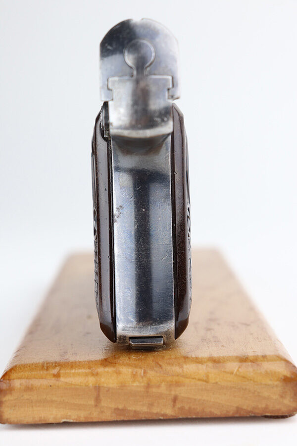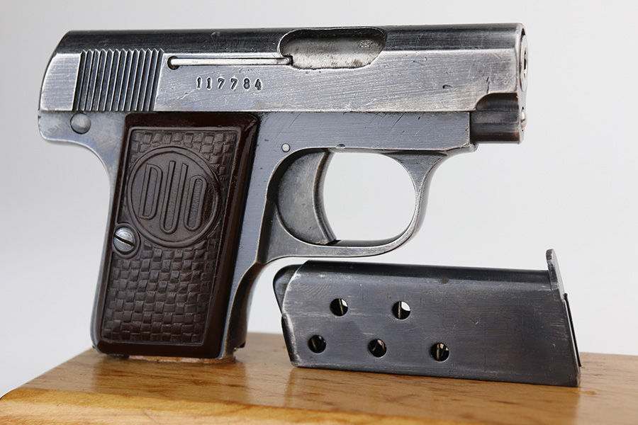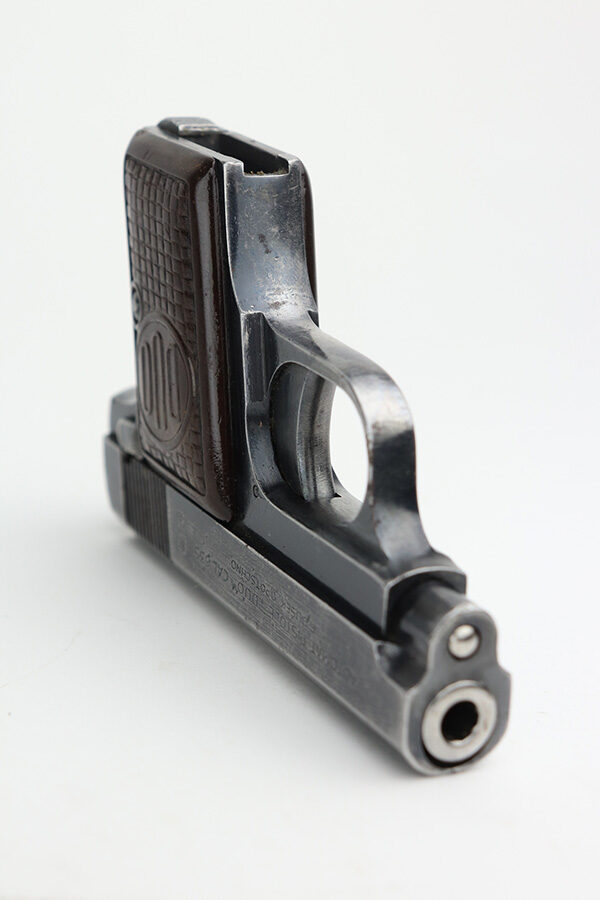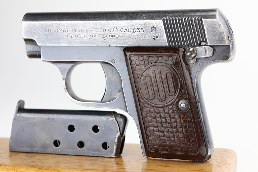 8/17/21 – This is a nice example of a Czech Duo Pocket Pistol manufactured in 1945. It is all matching and has the proper Czech lion proofs throughout. There is spotty wear and thinning on the whole slide and spotty wear on both straps. Small dots of oxidation here and there. Comes with excellent brown bakelite grips and a proper magazine. Excellent bore – shiny with strong rifling.