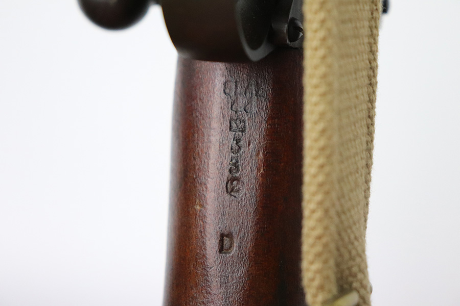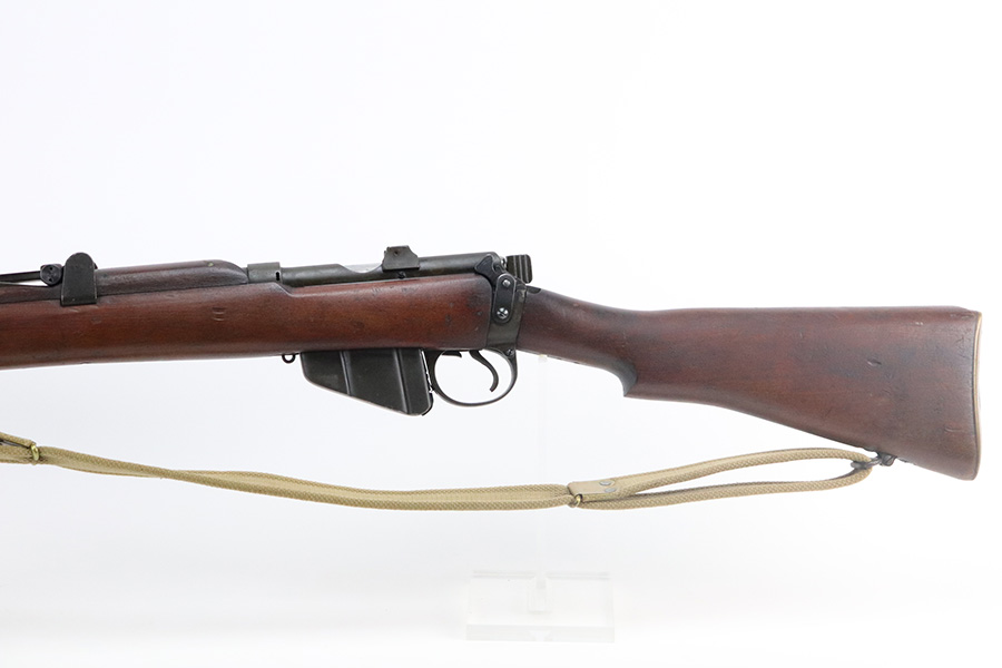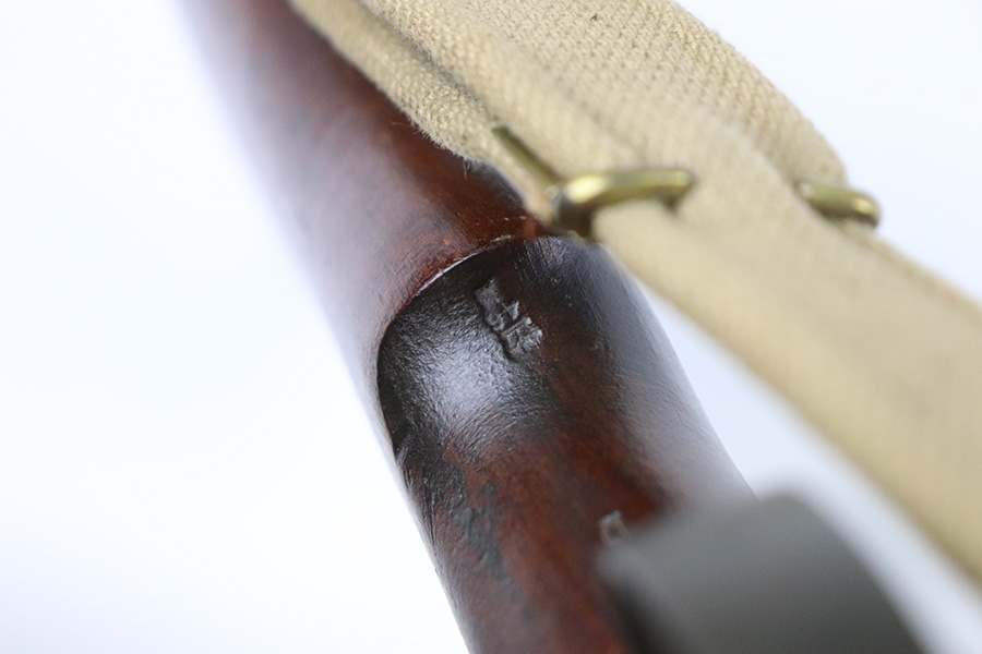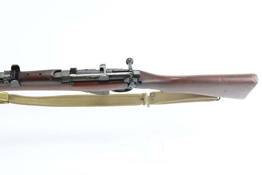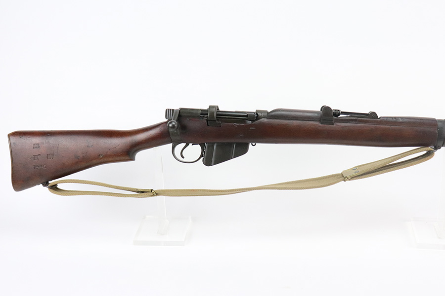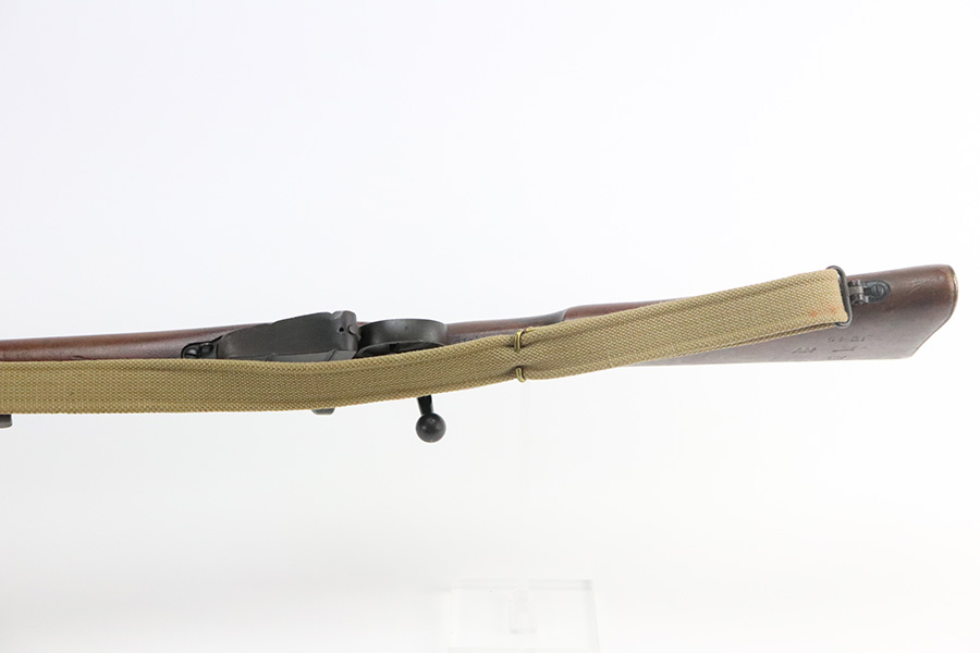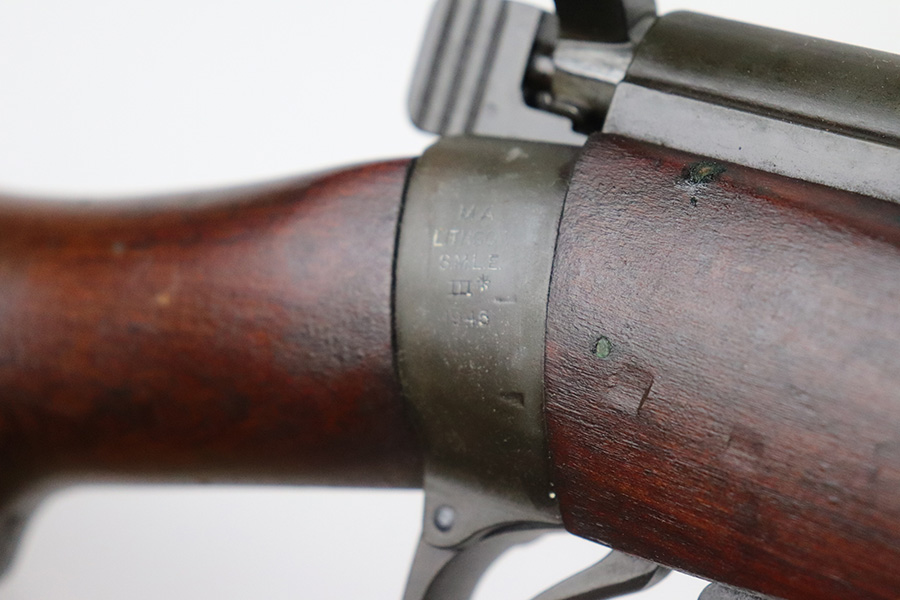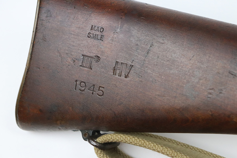7/23/21 – This is an original MA Lithgow S.M.L.E. III* that was made in 1945. It’s in very good condition, with all matching numbers throughout. Matching numbers on bolt handle, receiver, bayonet lug. Original finish shows some dulling/patina but no major areas of wear. Excellent stock with sharp markings, and reads ‘MAO SMLE III* HV 1945’ on right side. Includes canvas sling. Bore has pronounced rifling but is heavily frosted throughout.