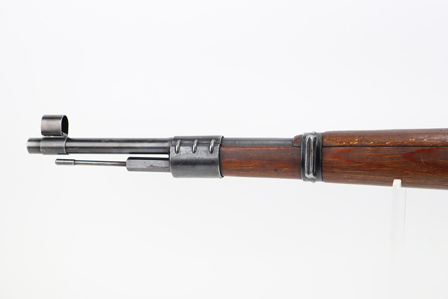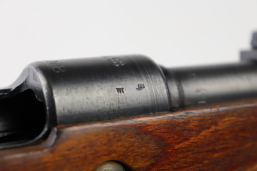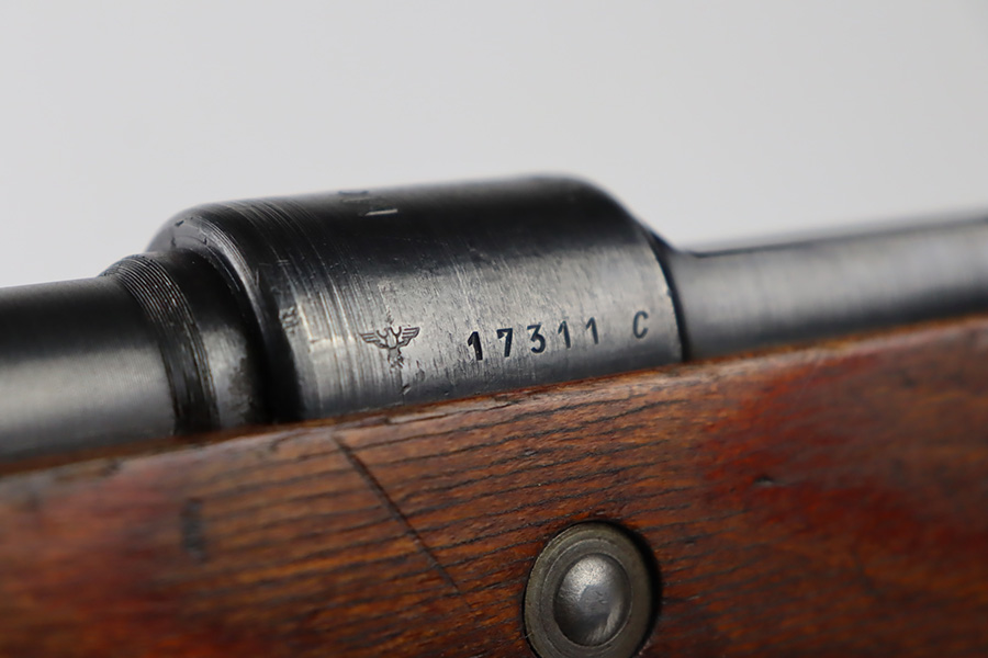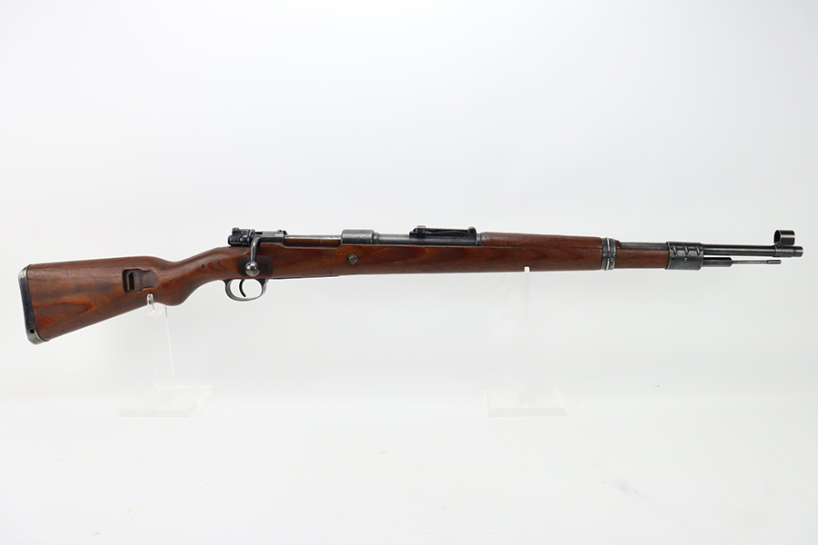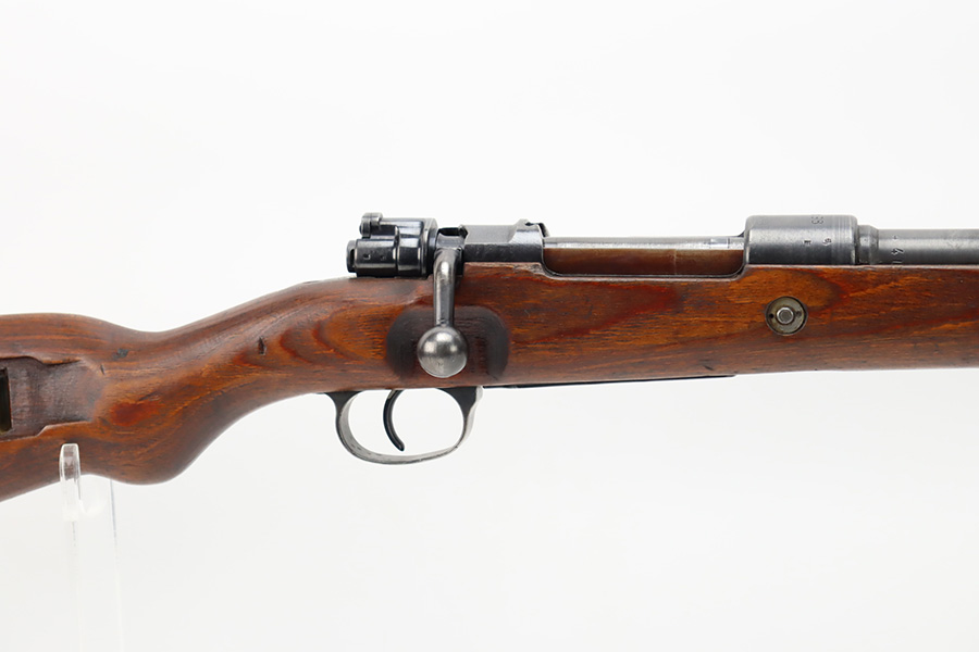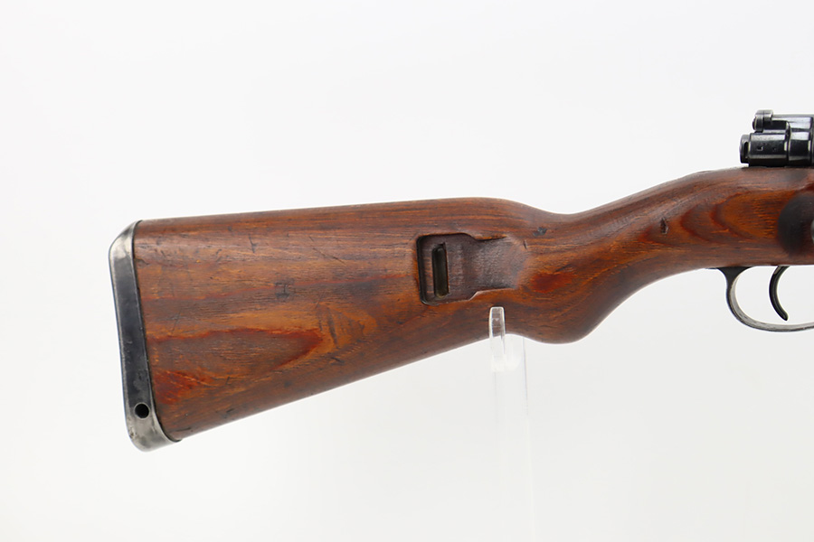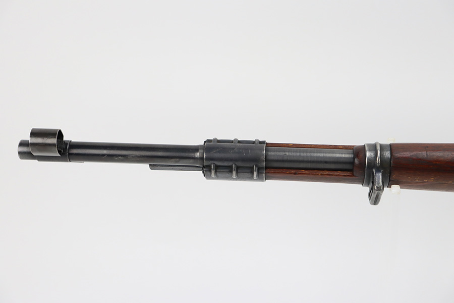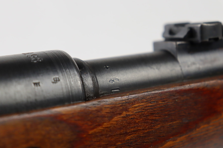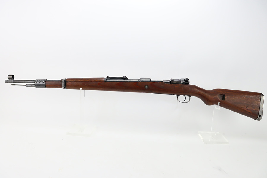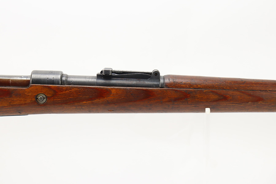 10/6/23 – This is a very nice example of a Mauser Kriegsmodell rifle assembled at the end of WW2, in 1945. This particular gun has a rare “svw MB” Mauser factory code. Many of these guns were assembled by the French after they took over the factory from the Germans at the end of WW2. This one was likely assembled by the French, because it has a French-style cleaning rod. It is mismatched, and some of the parts have been re-numbered. The bluing rates about 93% with general high edge wear and some light scratches here and there. Nice wood stock with the typical signs of wear. Mint bore.