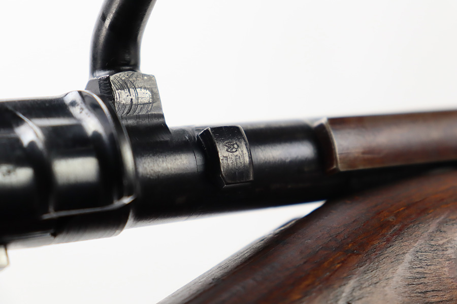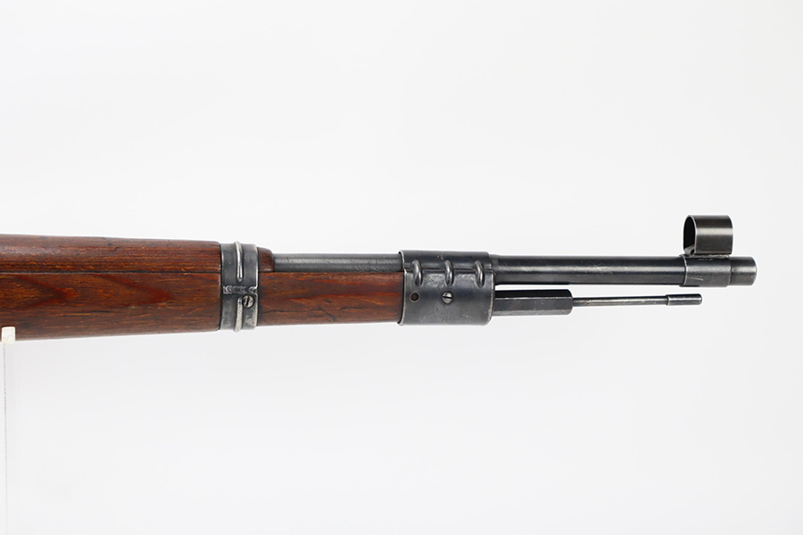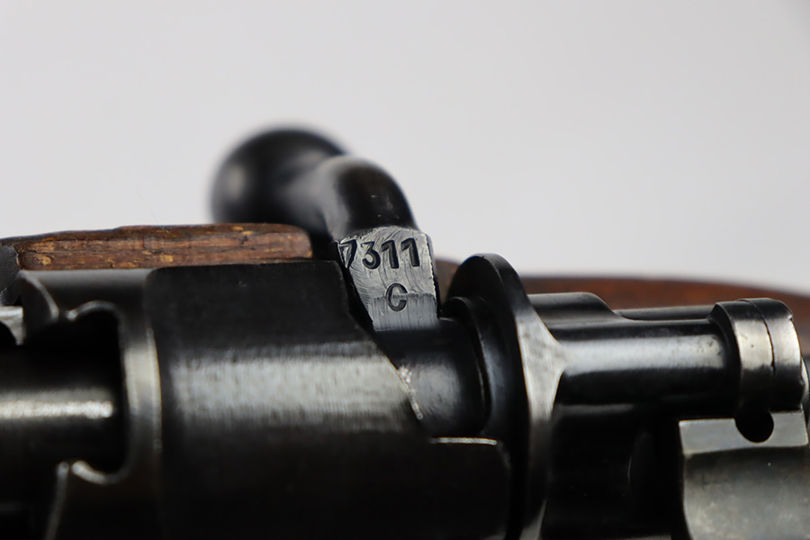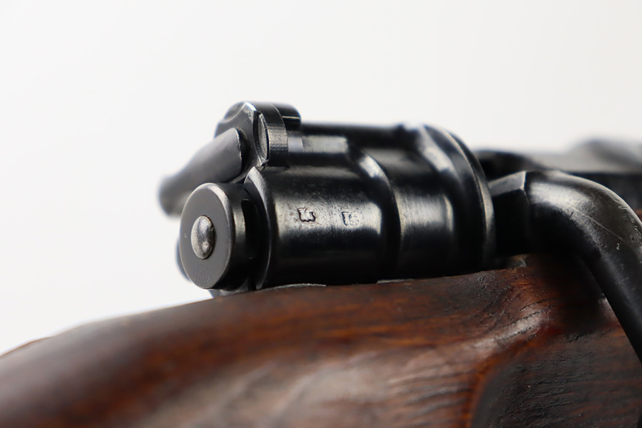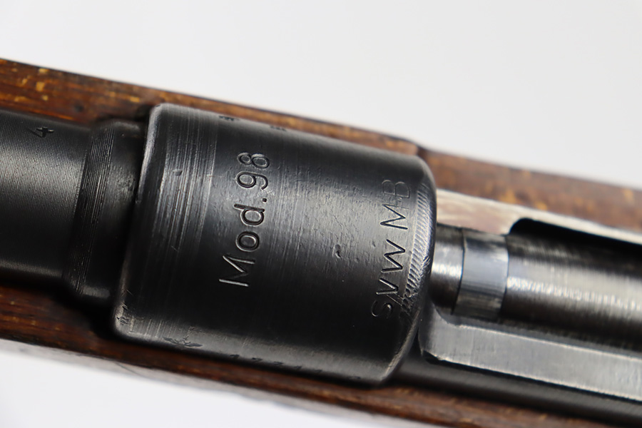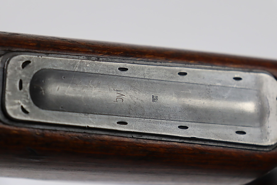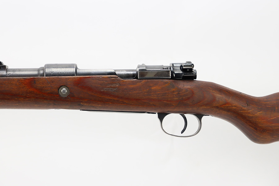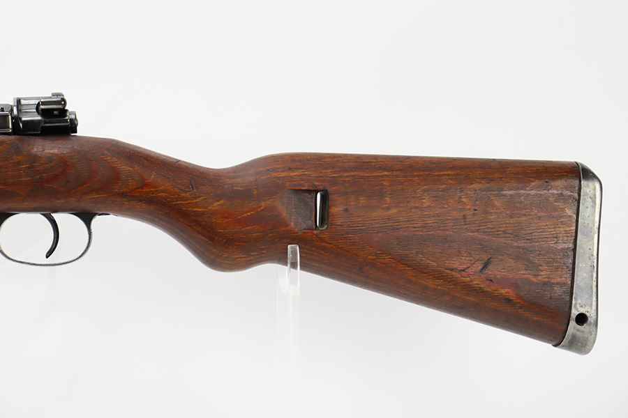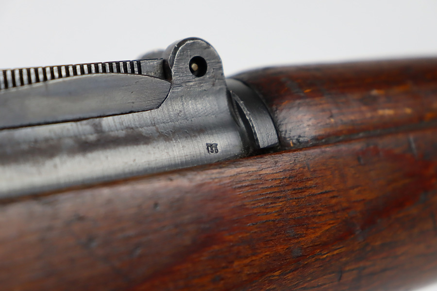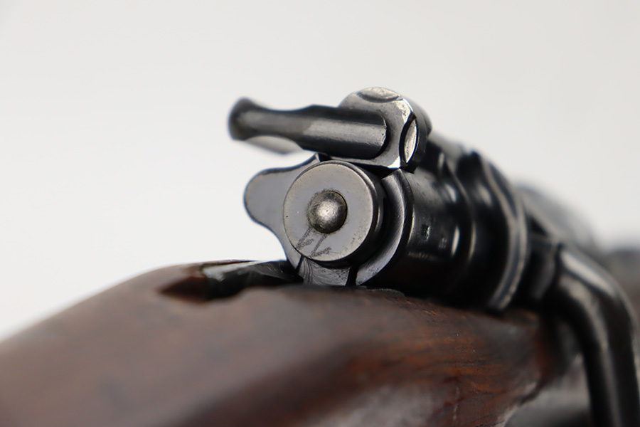 10/6/23 – This is a very nice example of a Mauser Kriegsmodell rifle assembled at the end of WW2, in 1945. This particular gun has a rare “svw MB” Mauser factory code. Many of these guns were assembled by the French after they took over the factory from the Germans at the end of WW2. This one was likely assembled by the French, because it has a French-style cleaning rod. It is mismatched, and some of the parts have been re-numbered. The bluing rates about 93% with general high edge wear and some light scratches here and there. Nice wood stock with the typical signs of wear. Mint bore.