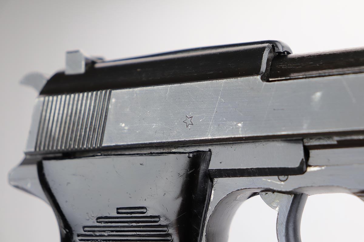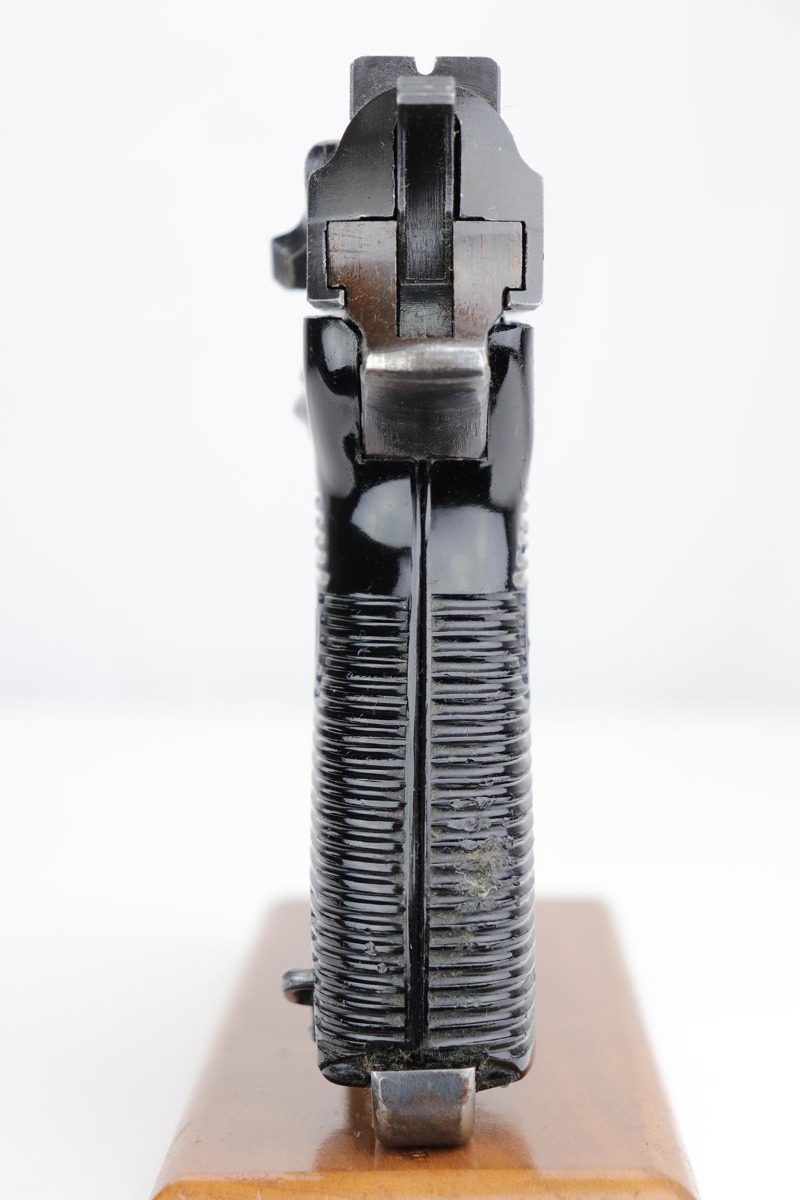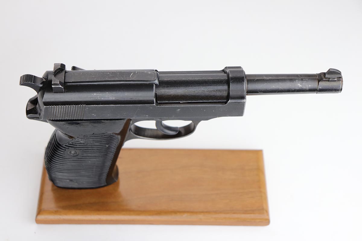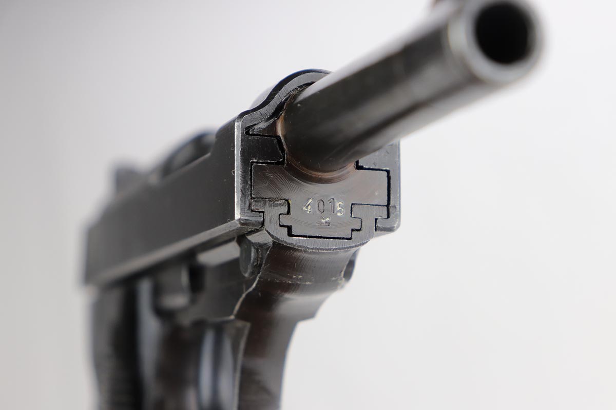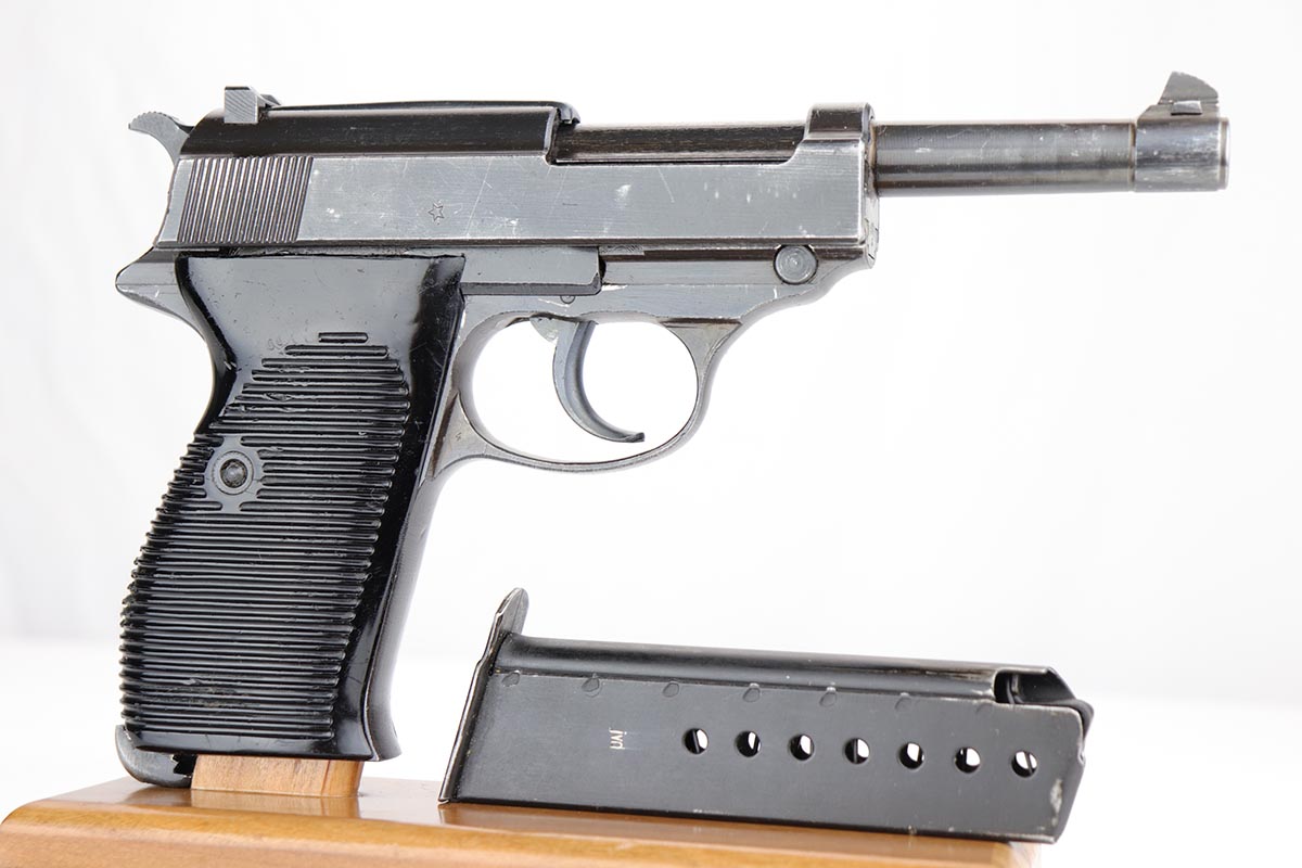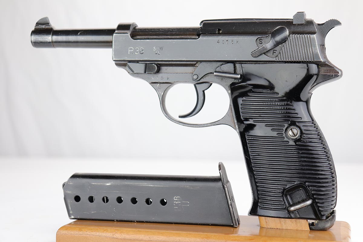 4/23/20 – This is an SVW 45 Mauser P.38, most likely made just before the end of the war. It was likely then finished by the French who took over the factory in May of 1945. You will notice the French star on the right side of slide. Overall, the gun is in excellent condition. The finish rates about 97%. Most of the wear is thinning on the high edges, around the muzzle, and some light scratches here and there. It comes with nice wartime Mauser grips – just a bit of scuffing on the back of the grips. It also comes with a JVD wartime magazine (1945). All matching parts including the barrel and locking block. Mechanically sound including the decocker. The bore is shiny and nice, 8/10. It is import marked under the slide, on the edge of the bottom rail.
