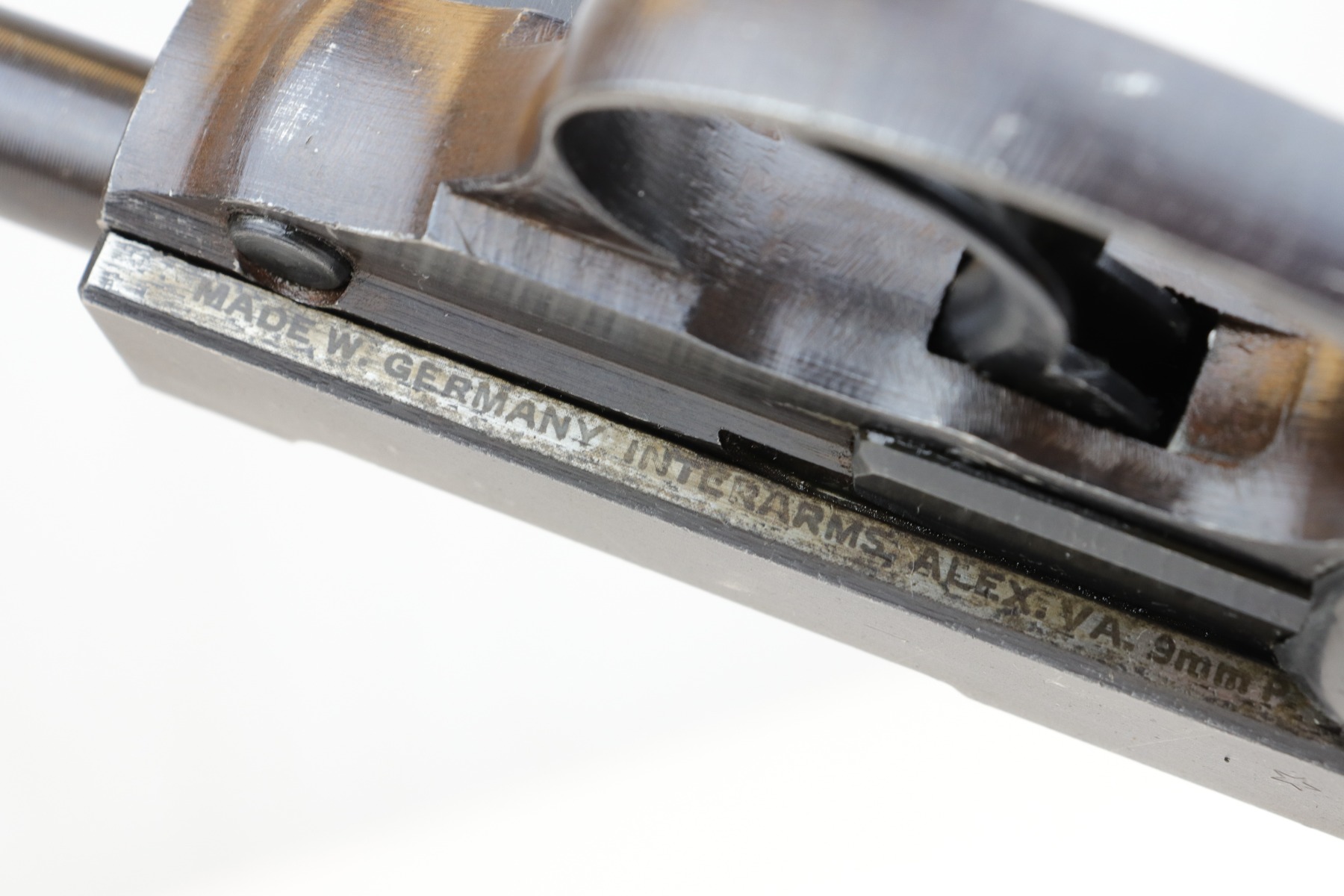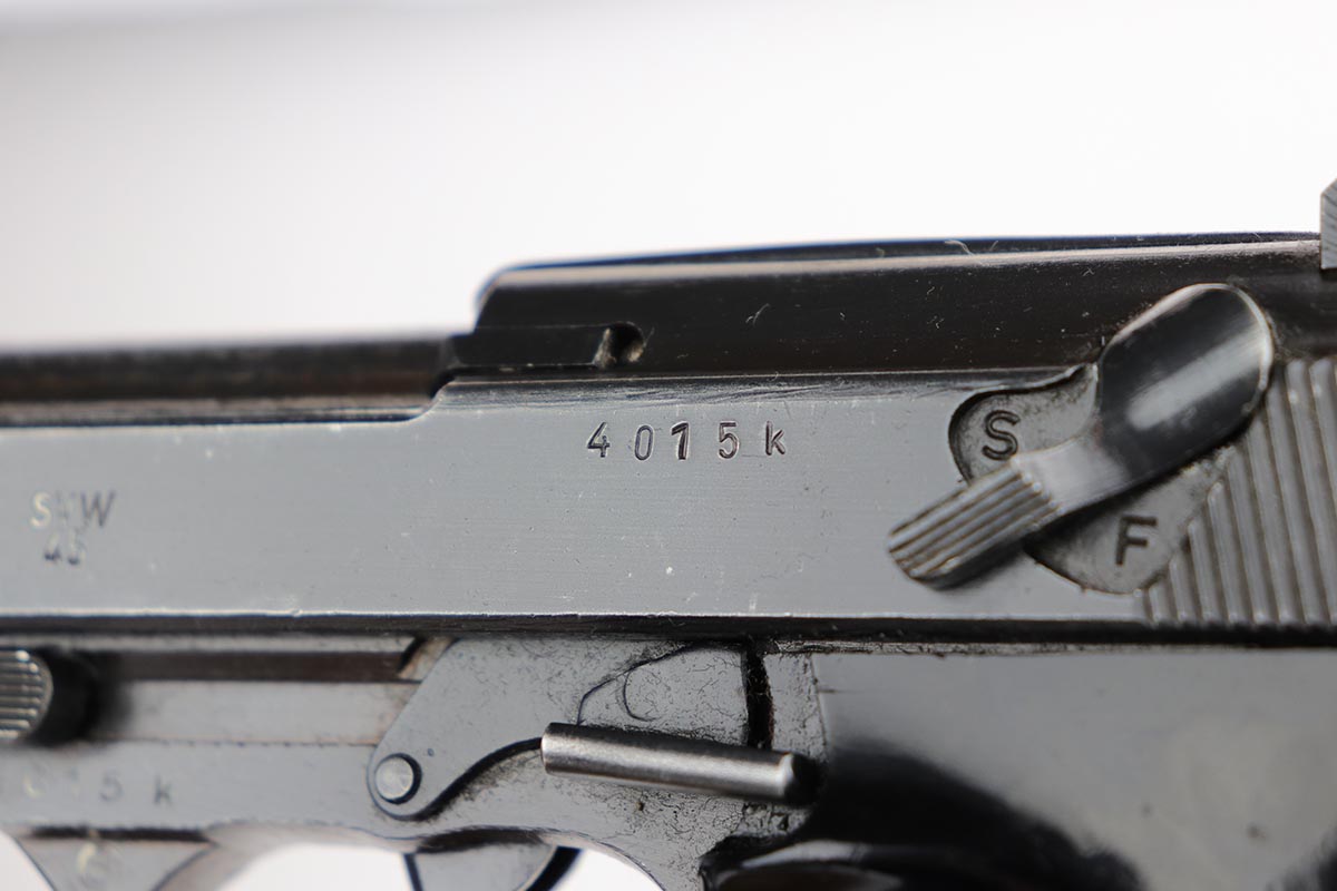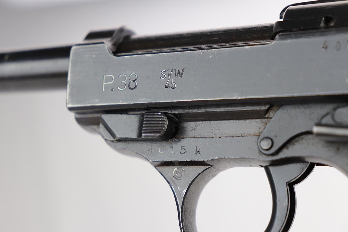 11/15/19 – This is an SVW 45 Mauser P.38, most likely made just before the end of the war. It was likely then finished by the French who took over the factory in May of 1945. You will notice the French star on the right side of slide. Overall, the gun is in excellent condition. The finish rates about 97%. Most of the wear is thinning on the high edges, around the muzzle, and some light scratches here and there. It comes with nice wartime Mauser grips – just a bit of scuffing on the back of the grips. It also comes with a JVD wartime magazine (1945). All matching parts including the barrel and locking block. Mechanically sound including the decocker. The bore is shiny and nice, 8/10. It is import marked under the slide, on the edge of the bottom rail.