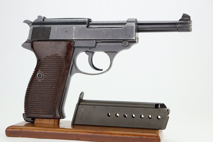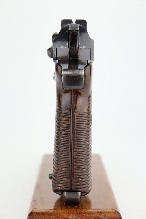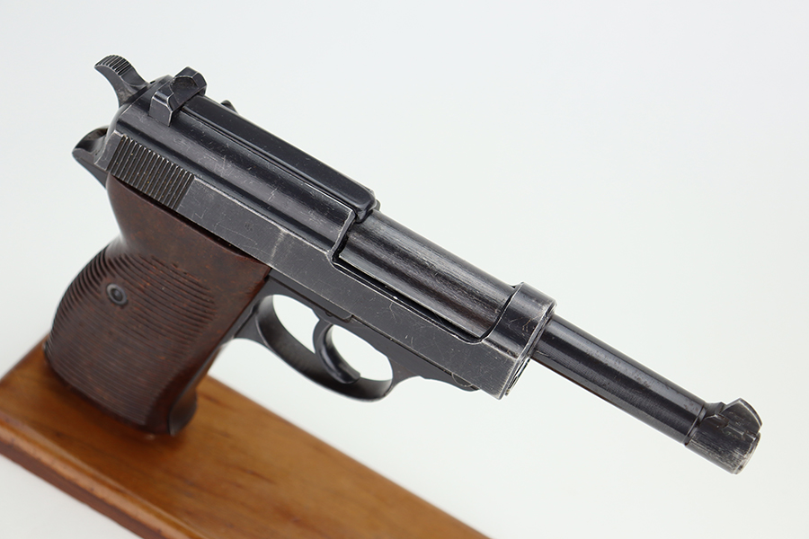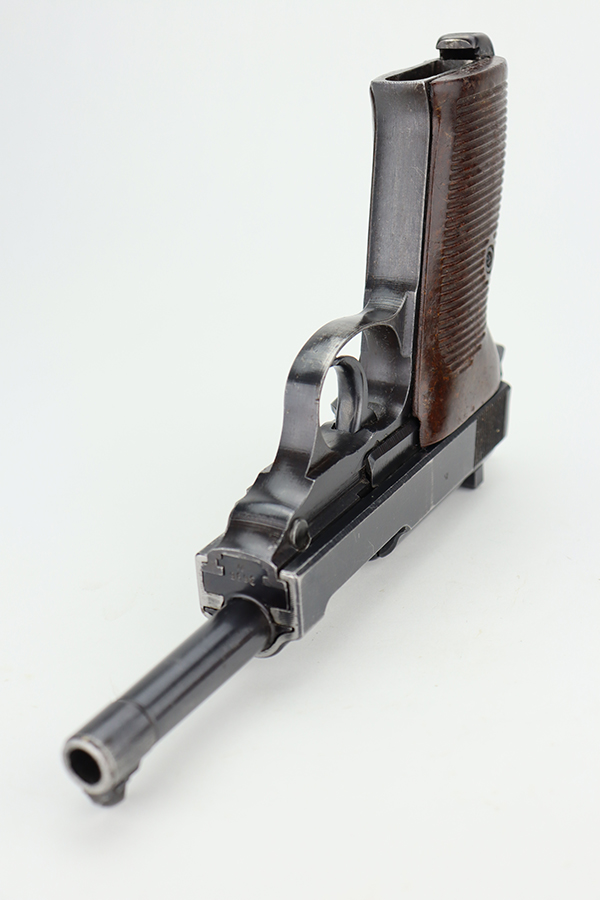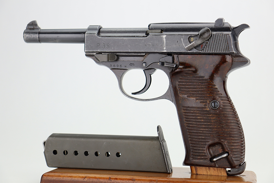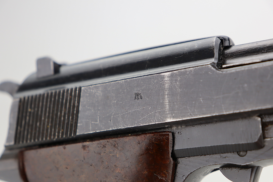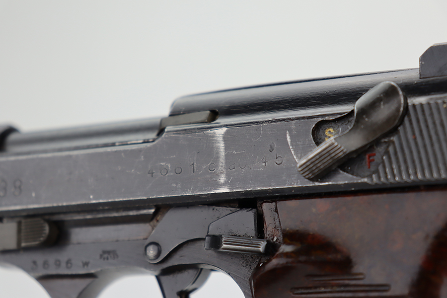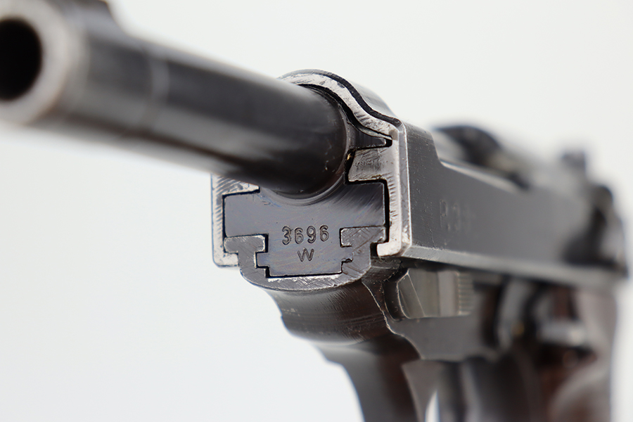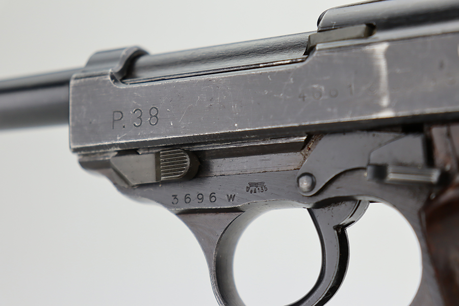 6/25/24 – This is a P.38 that has a Mauser-made frame and barrel and an AC 45 Walther slide. The barrel and frame are matching and have “Waffen 135” Mauser military acceptance proofs. The locking block is numbered “66w”. The gun’s bluing rates about 92-93% with general high edge wear, a light streak on the left side of the slide, and tiny surface scratches on both sides of the slide. Fitted with period-correct reddish bakelite grips and comes with a post-war P1 magazine. The bore has good rifling, but there are tiny pits throughout. De-cocker is not functional.