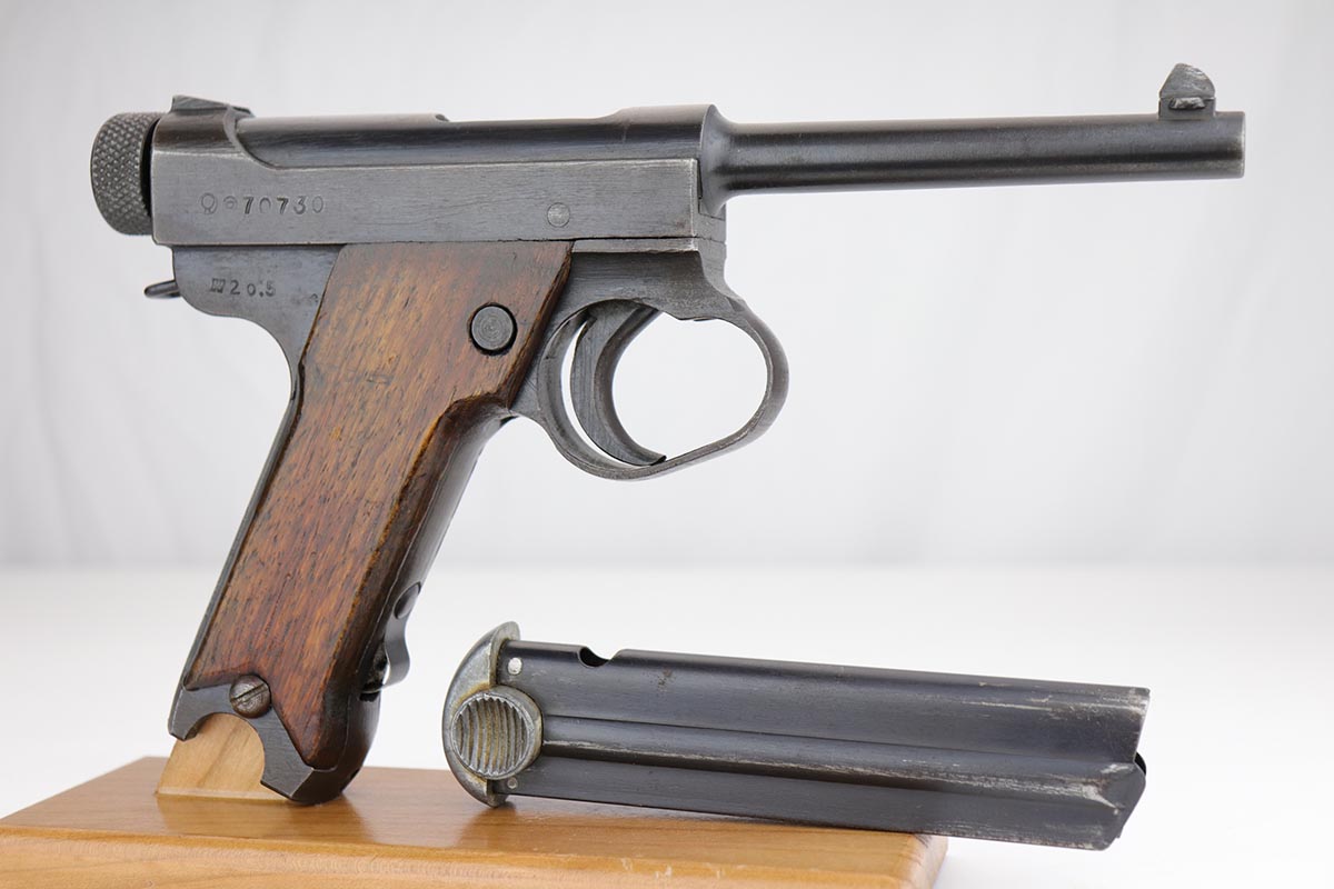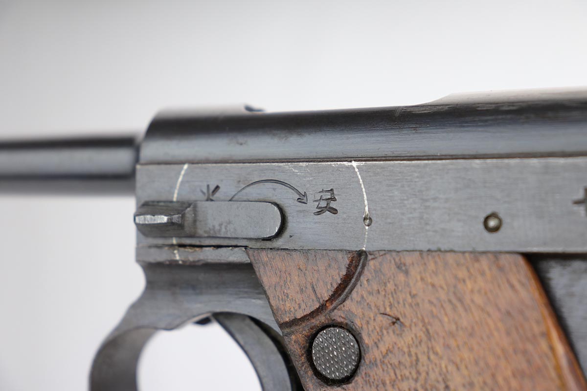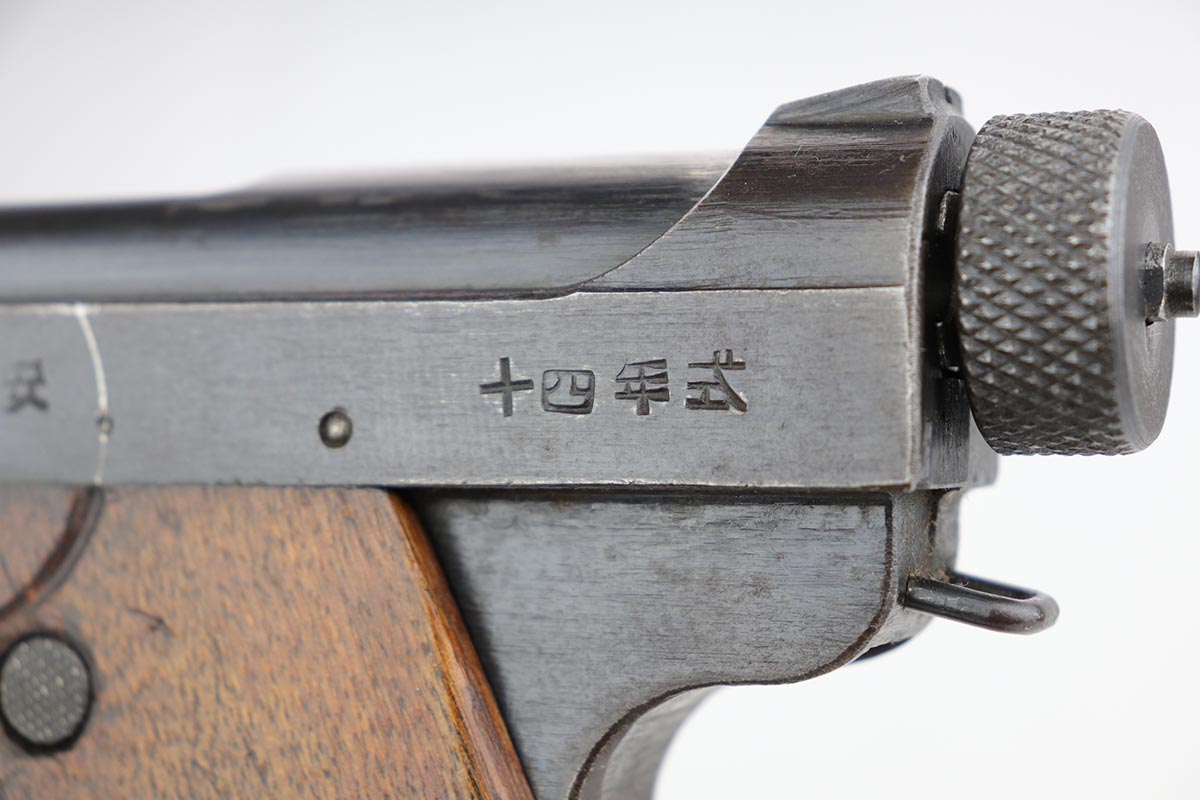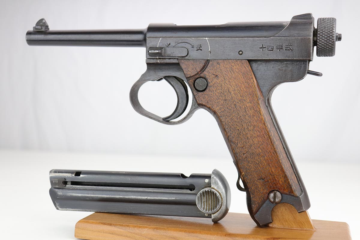 1/21/20 – This is an original WW2 Japanese Nambu Type 14, made in May of 1945. This pistol has retained ~95% of its original finish. There is just some light thinning on the straps. The grip panels appear to be period correct. One of the grip panels is matching and the other is not matching. The magazine does not match the gun. The bore is shiny with strong rifling. The gun is fully functional.