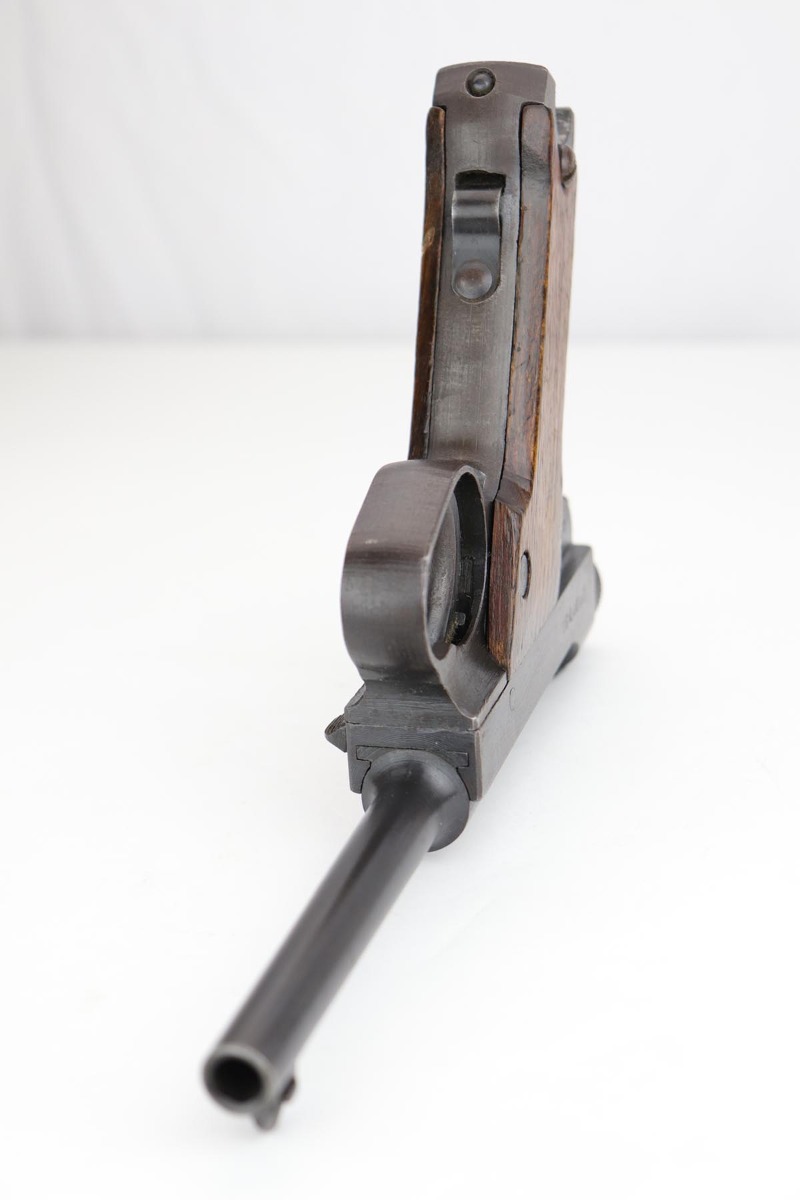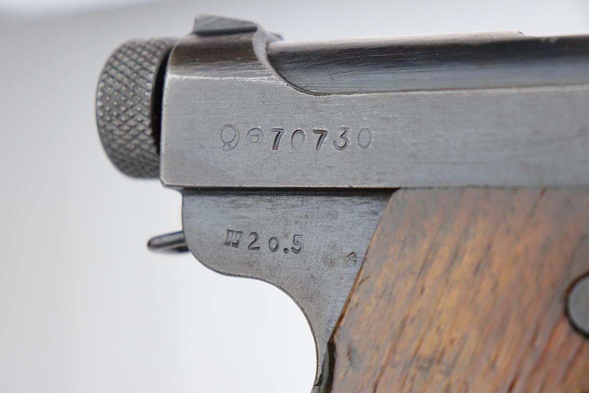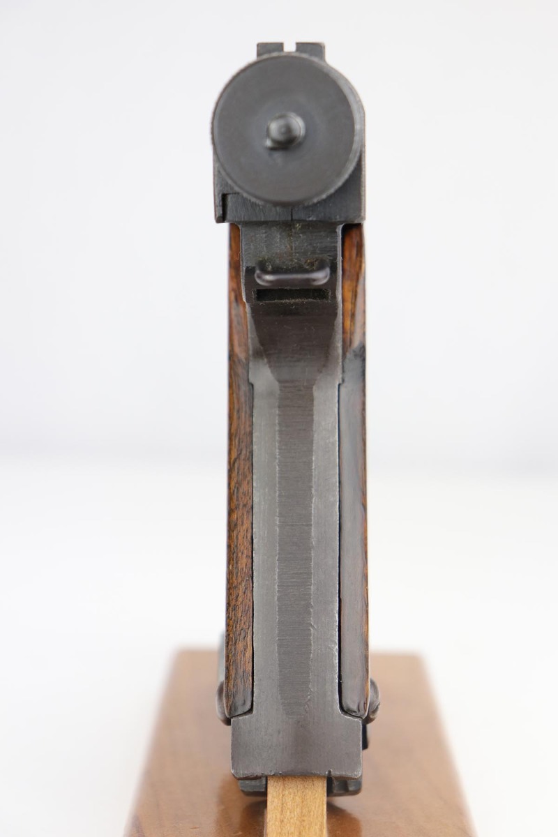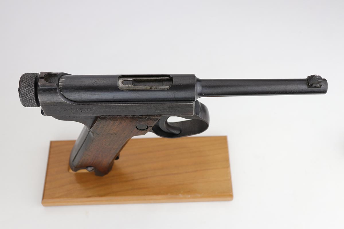 1/21/20 – This is an original WW2 Japanese Nambu Type 14, made in May of 1945. This pistol has retained ~95% of its original finish. There is just some light thinning on the straps. The grip panels appear to be period correct. One of the grip panels is matching and the other is not matching. The magazine does not match the gun. The bore is shiny with strong rifling. The gun is fully functional.
