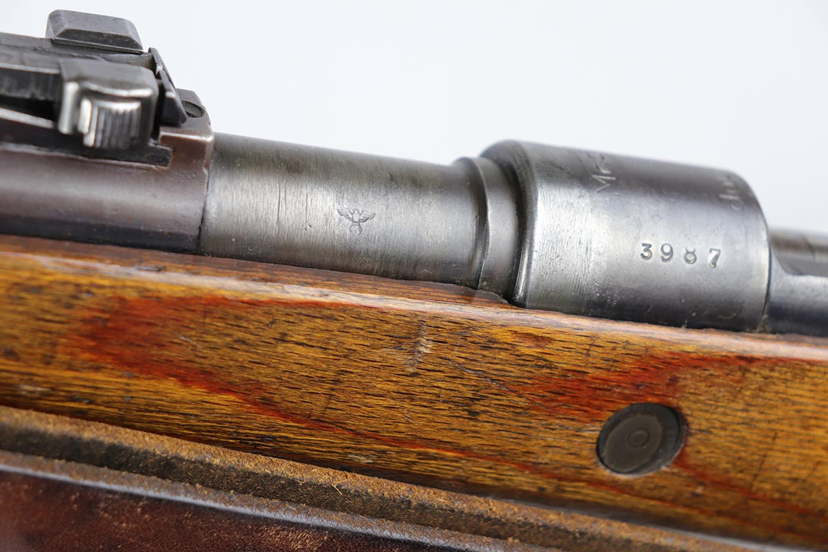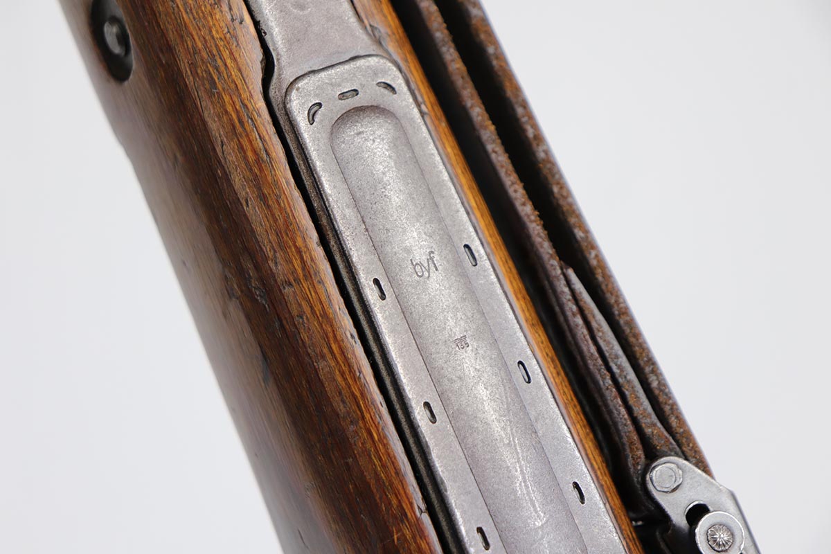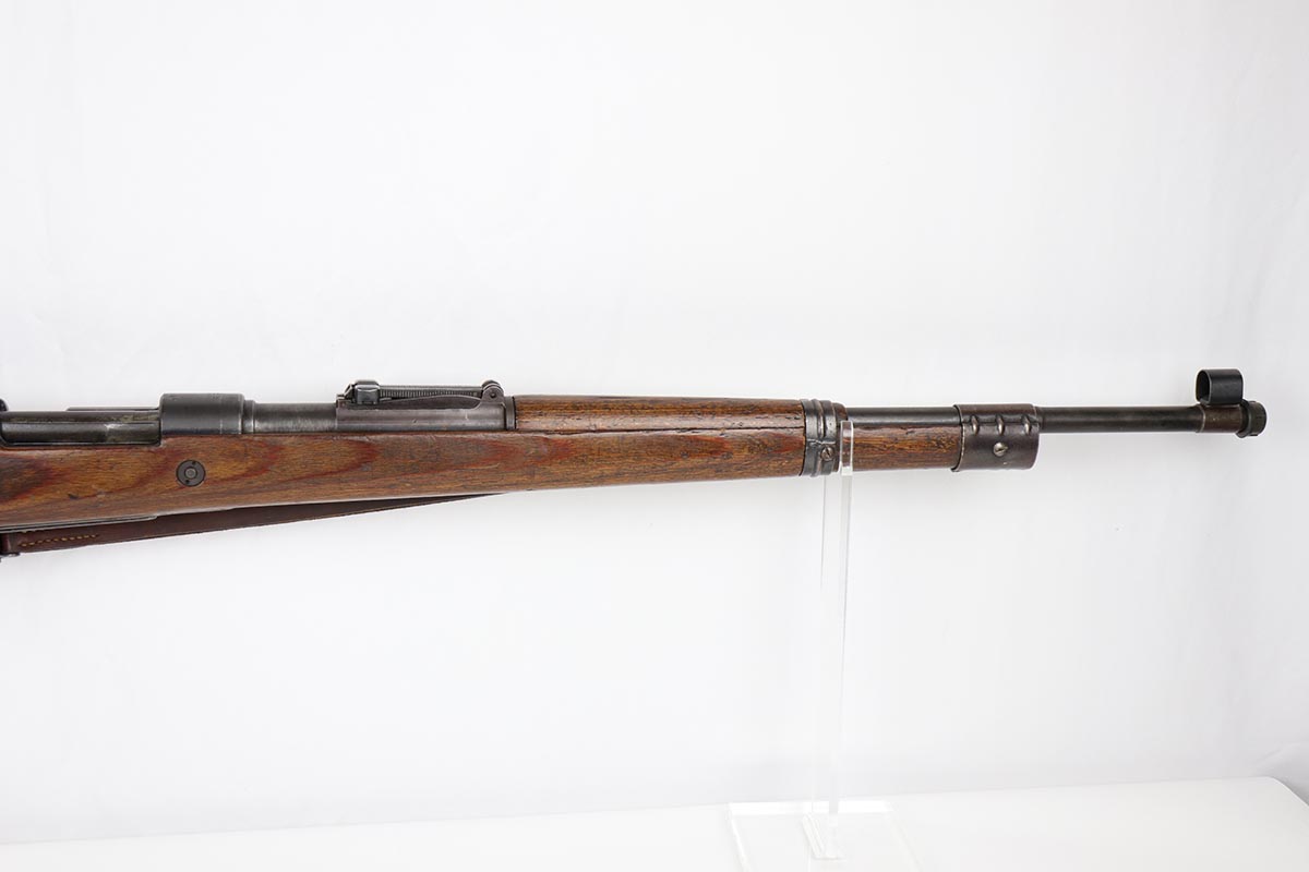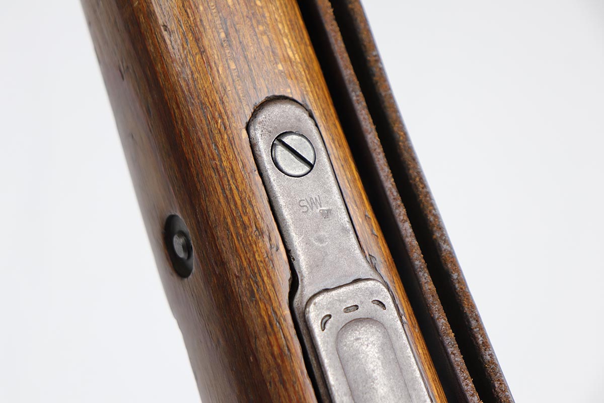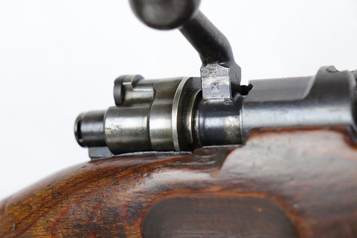 10/16/19 – This is an all matching and original K98 Kriegsmodell that was made at the Waffenwerke Bruenn factory in 1945. It has typical late-war features for a Kriegsmodell such as no cleaning rod slot, no bayonet lug and no disassembly disc. Only numbered parts are the receiver and the bolt assembly, which match. The finish is original but notably either thin or browning in most areas. Excellent original slight is present, and an original sight hood. Stock has some age and handling wear with several nicks and dings but no major cracks. Bore has pronounced rifling but thoroughly frosted and freckled.