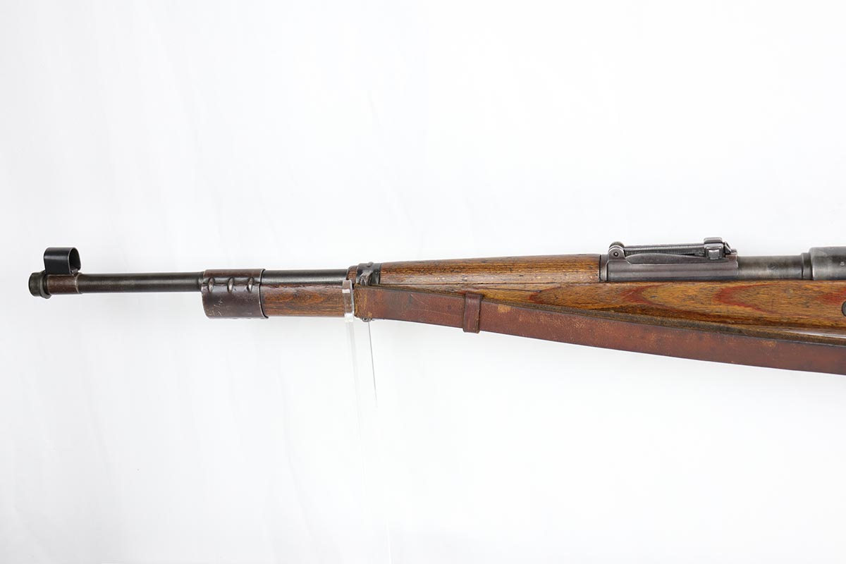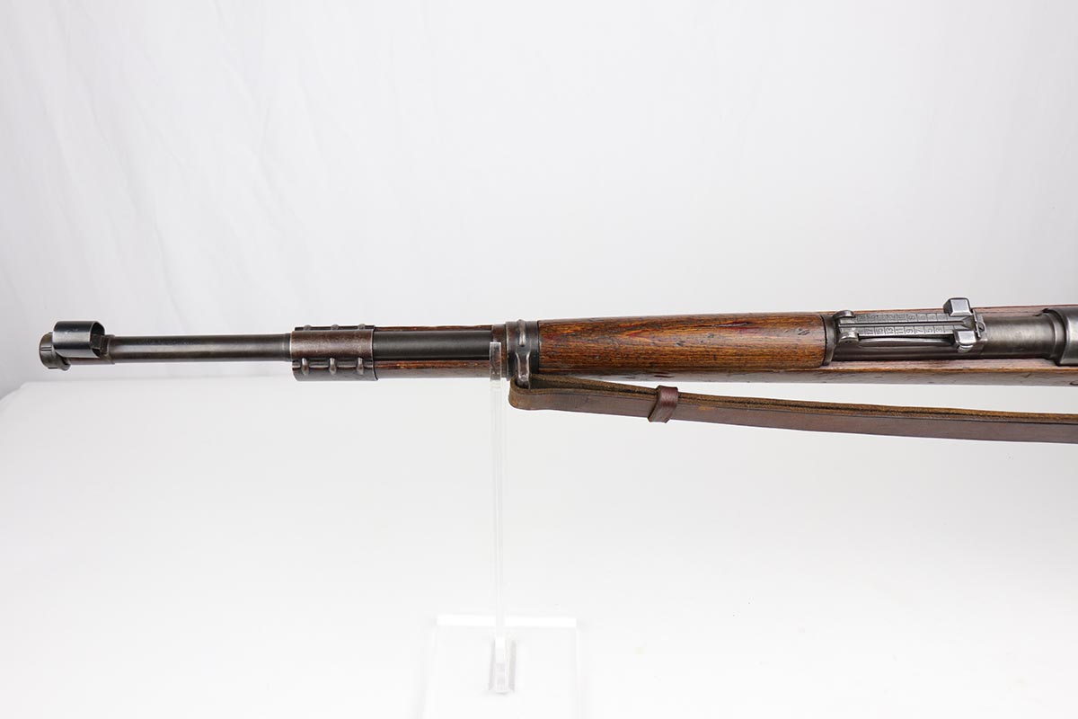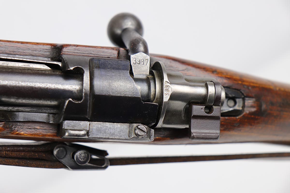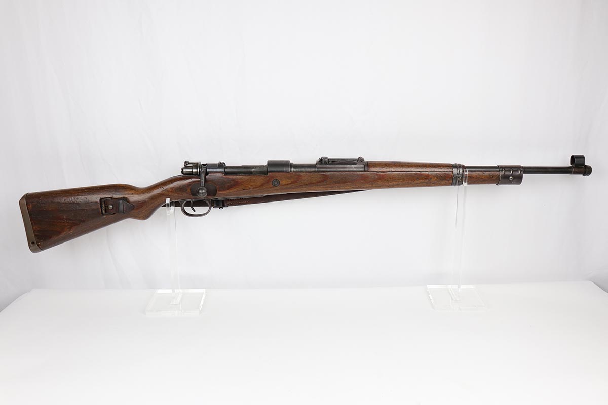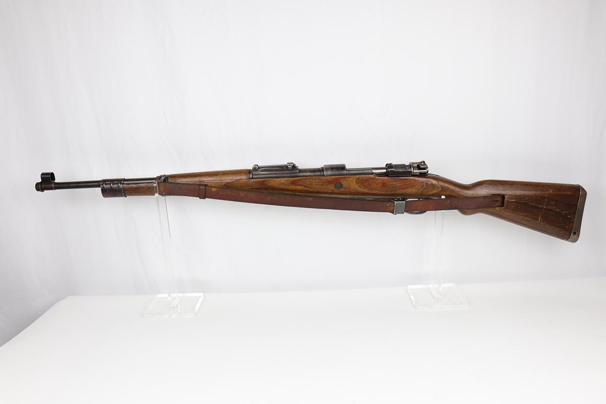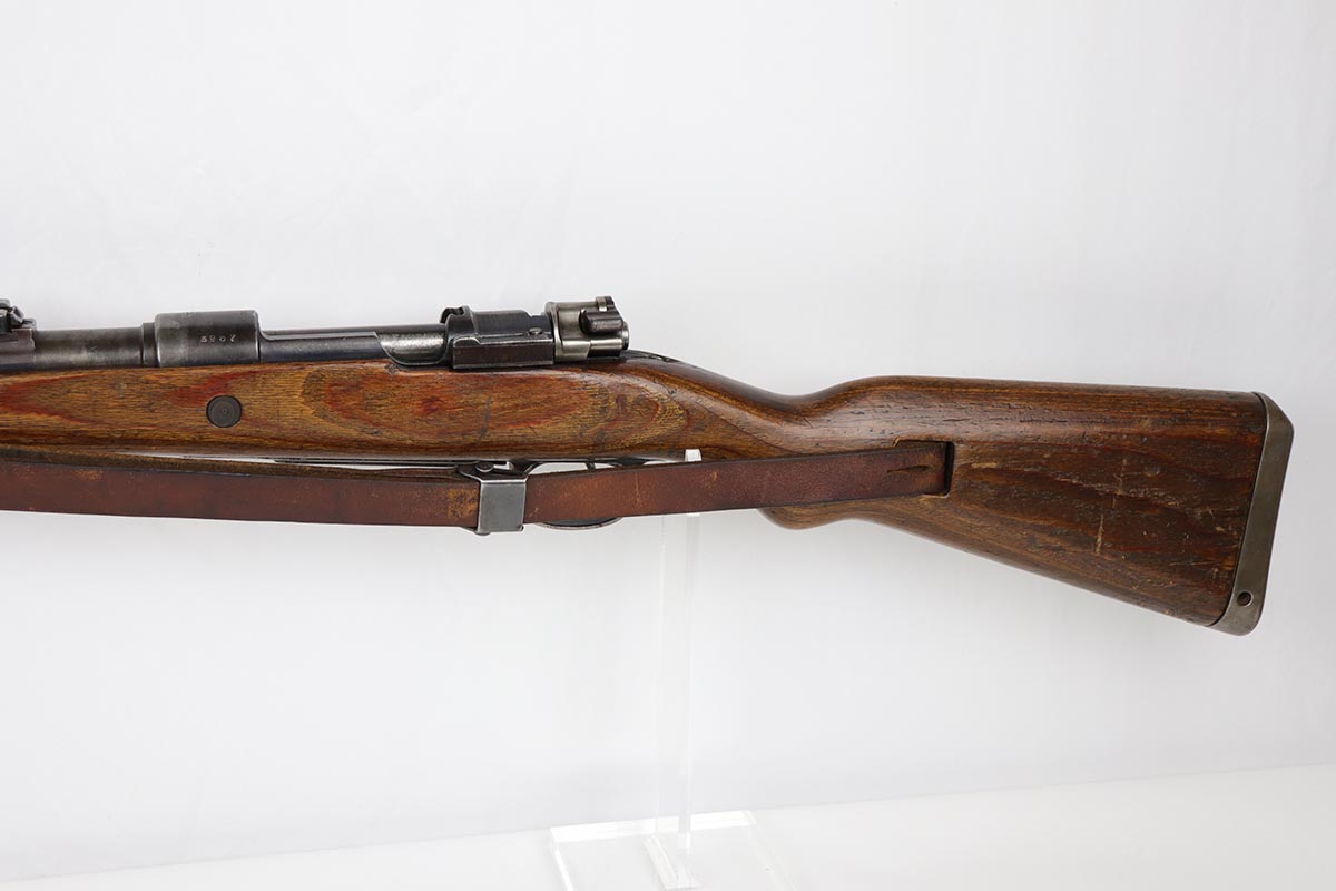10/16/19 – This is an all matching and original K98 Kriegsmodell that was made at the Waffenwerke Bruenn factory in 1945. It has typical late-war features for a Kriegsmodell such as no cleaning rod slot, no bayonet lug and no disassembly disc. Only numbered parts are the receiver and the bolt assembly, which match. The finish is original but notably either thin or browning in most areas. Excellent original slight is present, and an original sight hood. Stock has some age and handling wear with several nicks and dings but no major cracks. Bore has pronounced rifling but thoroughly frosted and freckled.