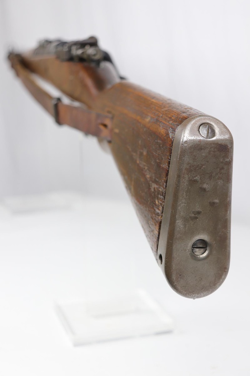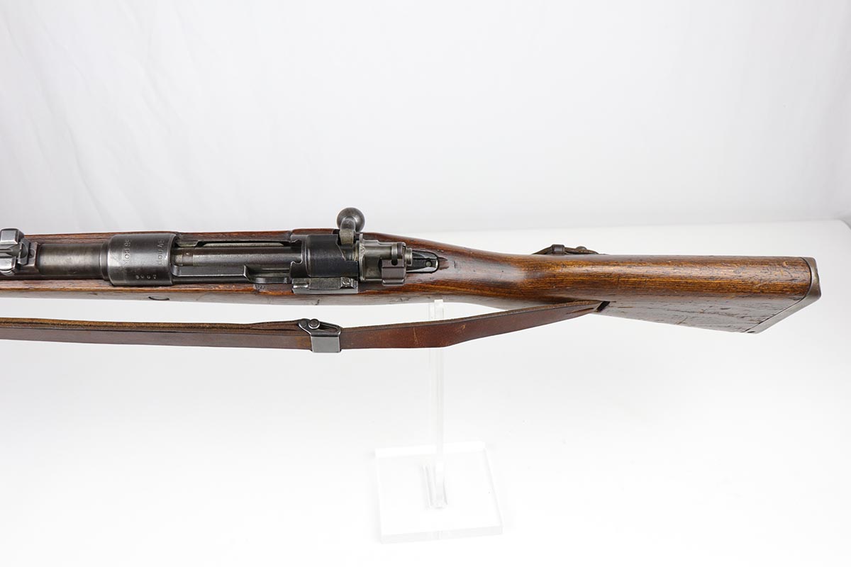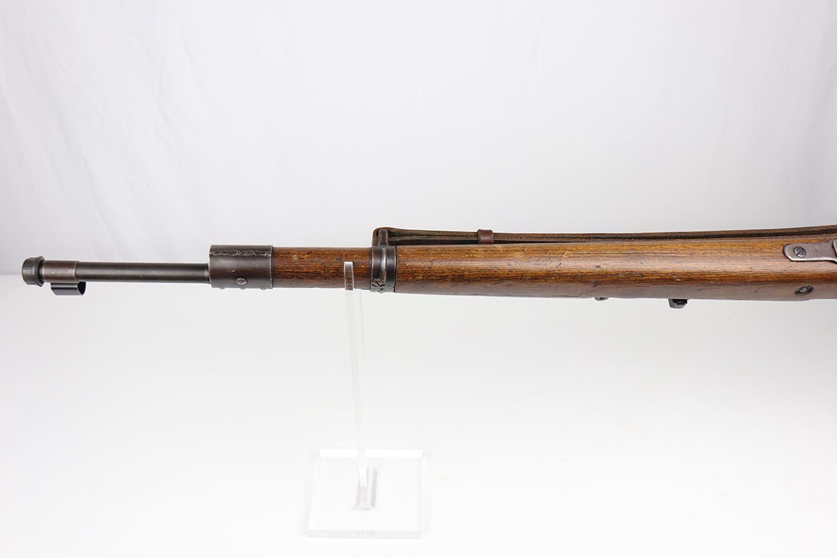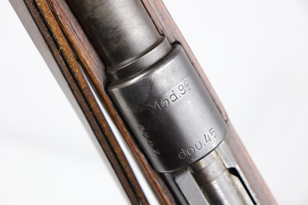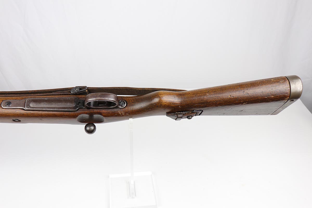 10/16/19 – This is an all matching and original K98 Kriegsmodell that was made at the Waffenwerke Bruenn factory in 1945. It has typical late-war features for a Kriegsmodell such as no cleaning rod slot, no bayonet lug and no disassembly disc. Only numbered parts are the receiver and the bolt assembly, which match. The finish is original but notably either thin or browning in most areas. Excellent original slight is present, and an original sight hood. Stock has some age and handling wear with several nicks and dings but no major cracks. Bore has pronounced rifling but thoroughly frosted and freckled.
