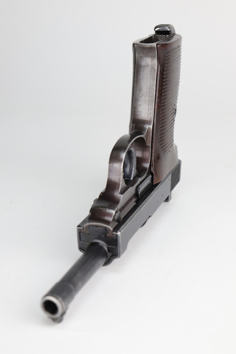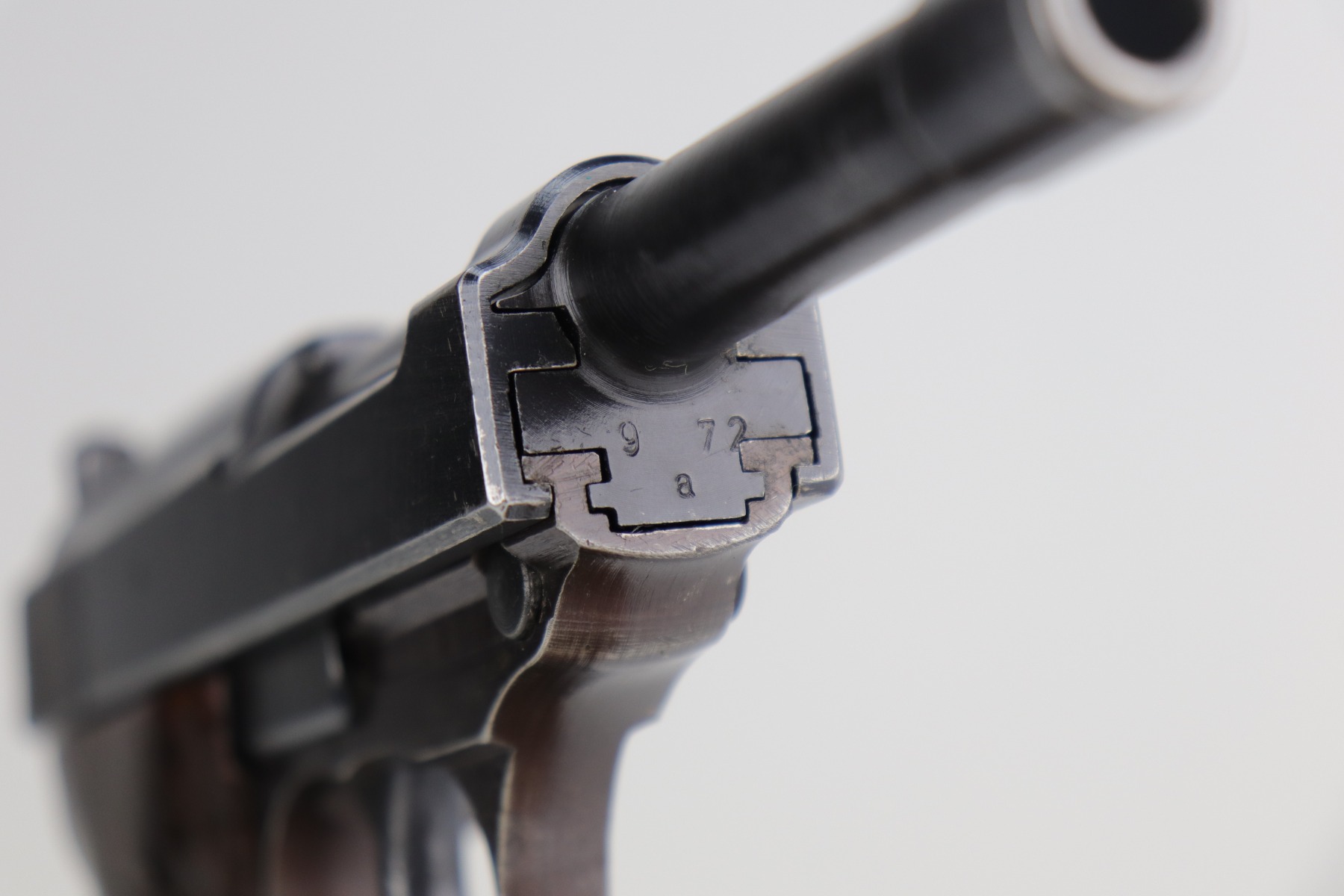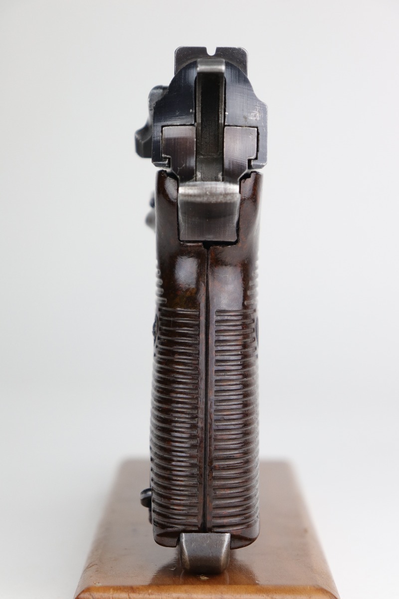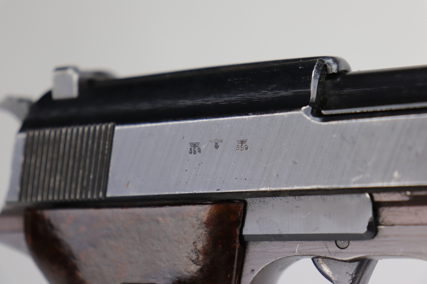 9/30/20 – This is a nice example of a Walther P.38 issued to the Nazi military in 1945. It is all matching, has a correct cog hammer, and has the proper “Eagle 359” Nazi military acceptance proofs. Because the frame is plumb-colored, the gun has a very nice two-tone appearance. It has retained somewhere between 85-90% of its original finish. Generally, there is muzzle wear, wear along the high edges, and small handling marks on the slide throughout. There is an area of discoloration on the top plate. There is thinning on the underside of the frame, most noticeable on the underside of the trigger guard and front strap. Wear on the peak of the tang. Excellent grips. Comes with a period-correct “U”-marked magazine. Excellent bore – shiny with strong rifling. Fully functional, including the de-cocker.