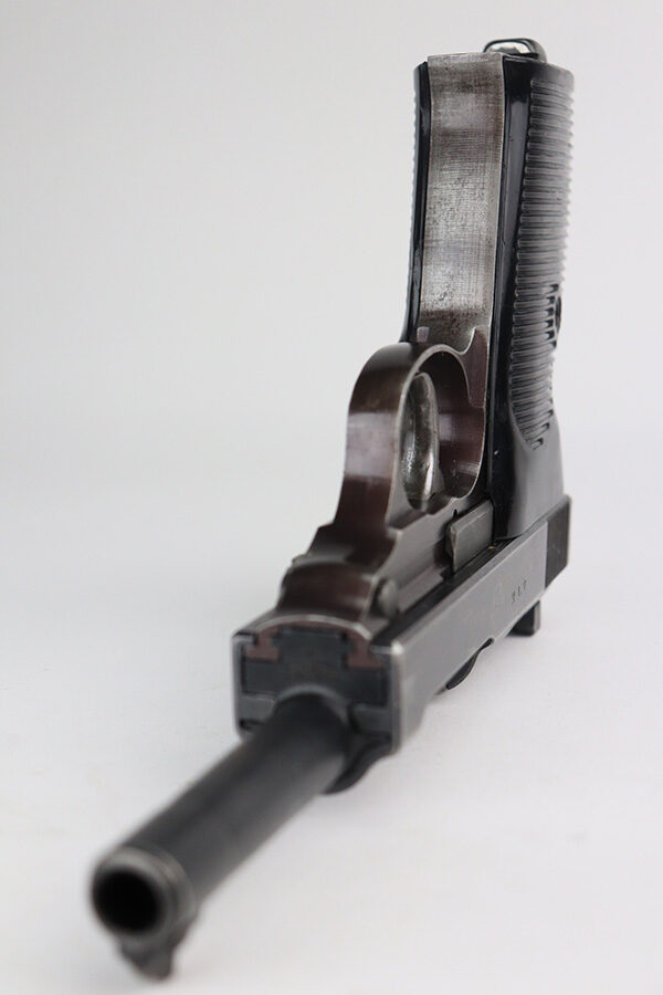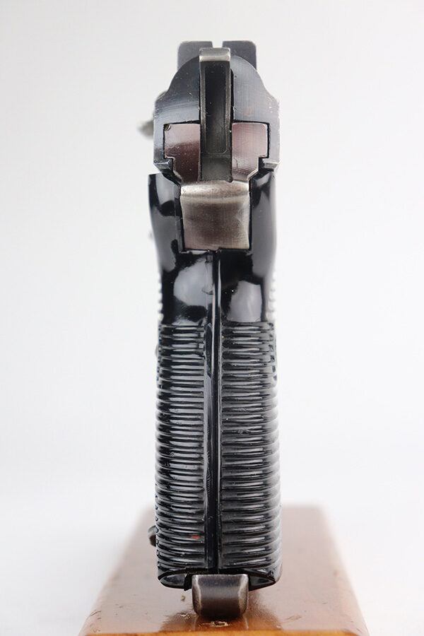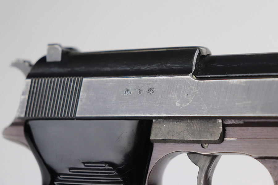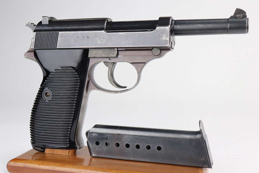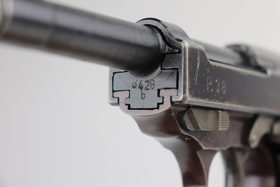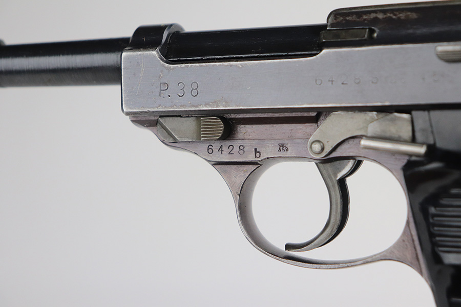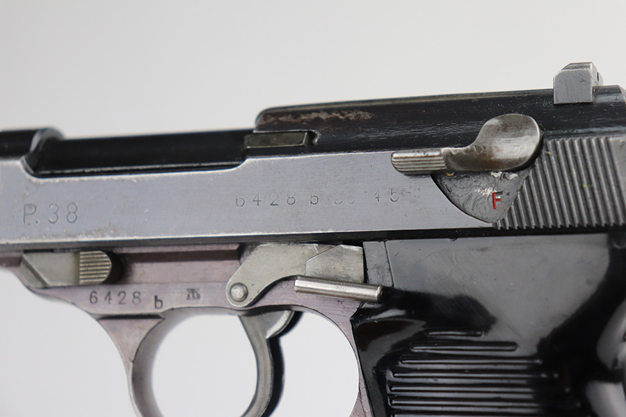 6/23/21 – This is a nice example of a Walther P.38 issued at the end of the war, in 1945. It has a late-war cog hammer and phosphate small parts. The gun is all matching and has the proper “Eagle 359” military proofs. The frame has a really nice plumb color. It has retained somewhere between 75-80% of its original finish. Most of the wear is on the front strap, but there is also wear on the high edges of the slide, around the muzzle, on top of the barrel in the ejection port, and top of the slide. Some scratchy wear on the right side of the slide. Comes with excellent grips and a period-correct Walther magazine. Minty bore. De-cocker is functional.