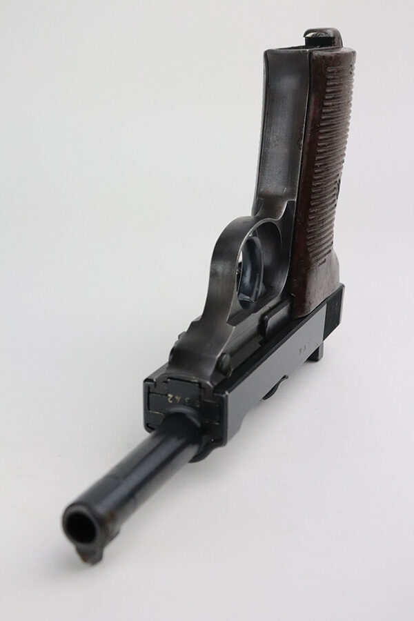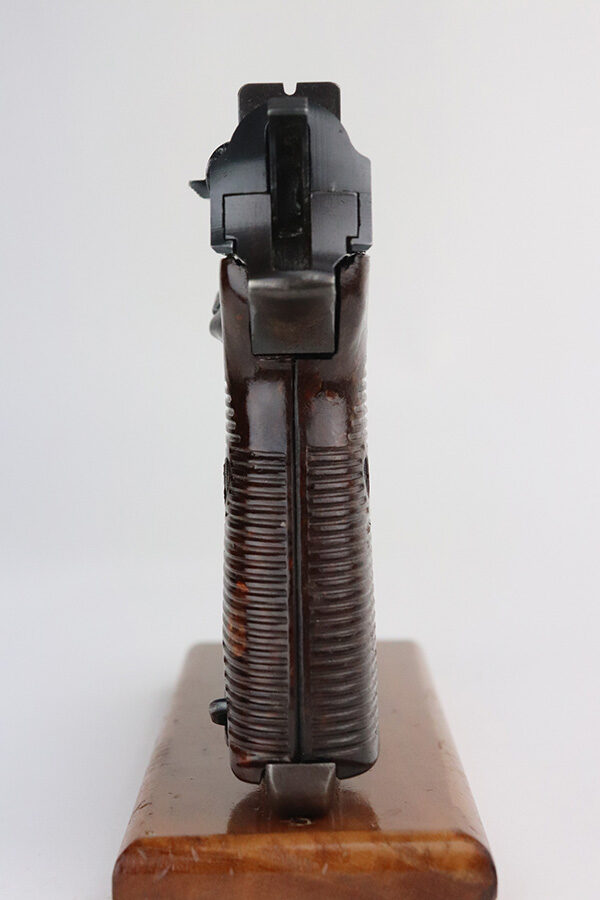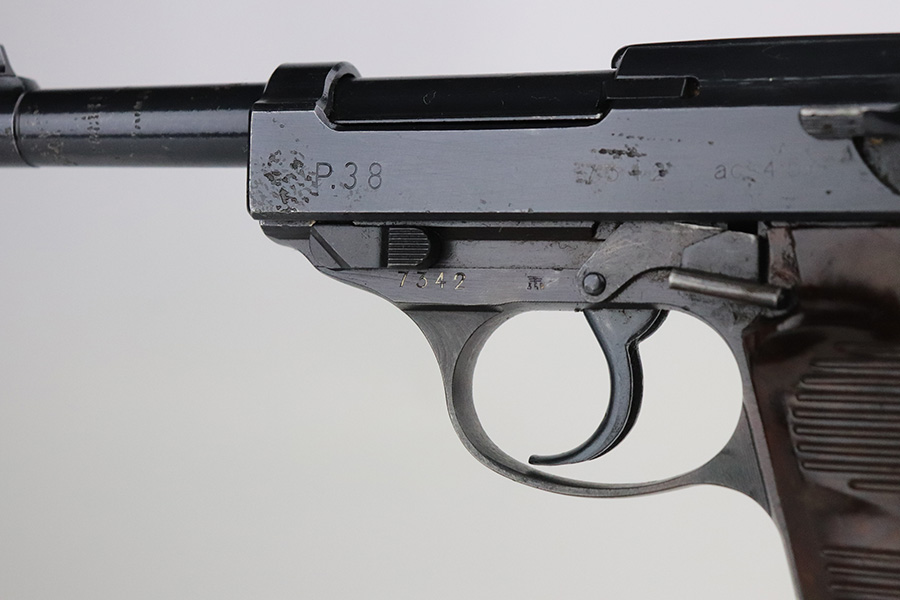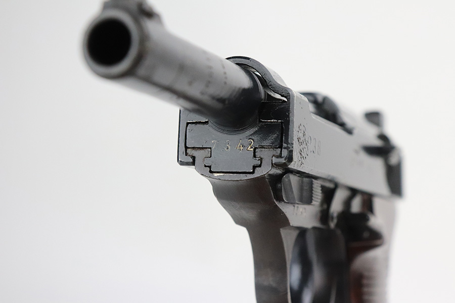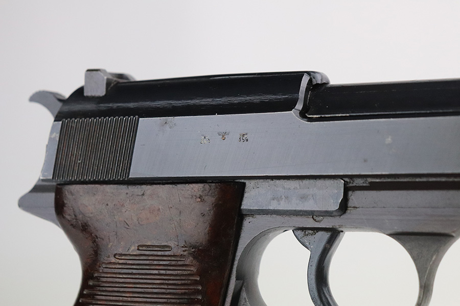 7/30/21 – This is a nice example of a Walther P.38 issued to the Nazi military in 1945. It is all matching and has the proper “Eagle 359” military proofs. It has retained about 98% of its finish. There are just hints of wear on the high edges of the slide and very minor thinning on the front strap. While there is very little actual finish loss, there are areas of heavy pitting on the left side of the slide, on the barrel, and around the muzzle. Comes with excellent grips and a Walther magazine. Mint bore. De-cocker is functional.