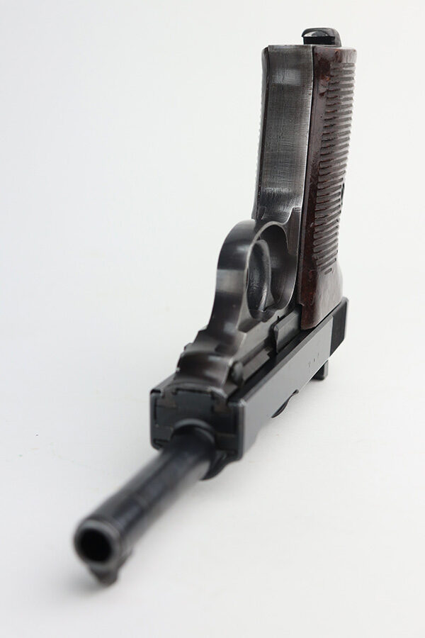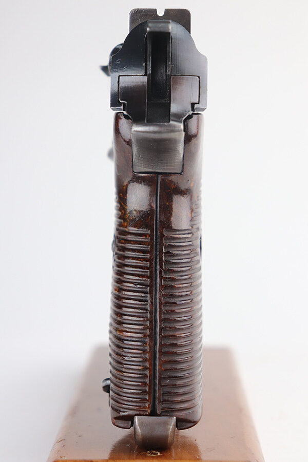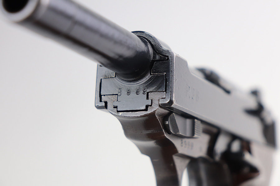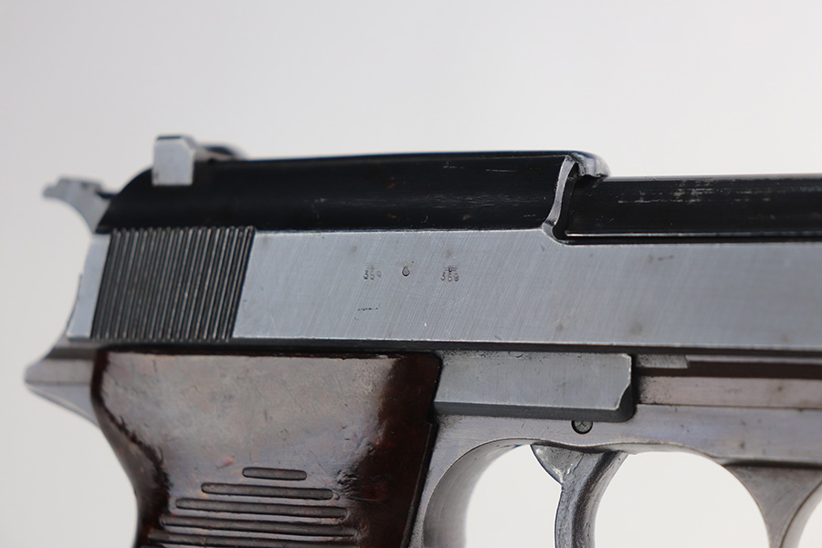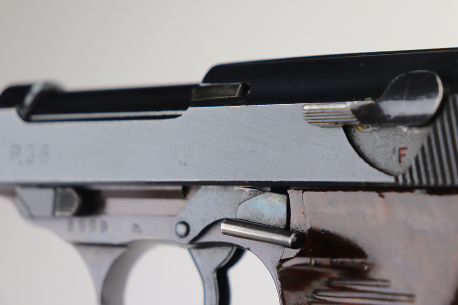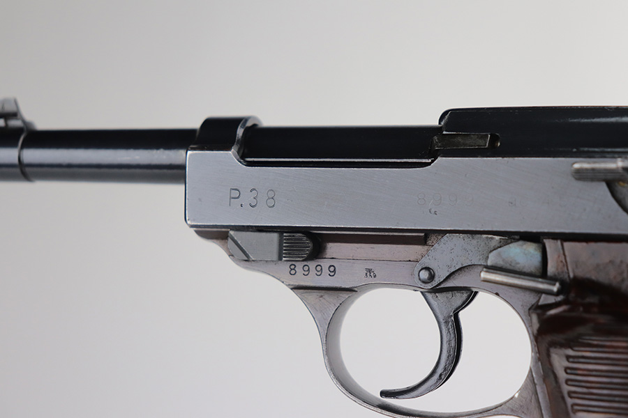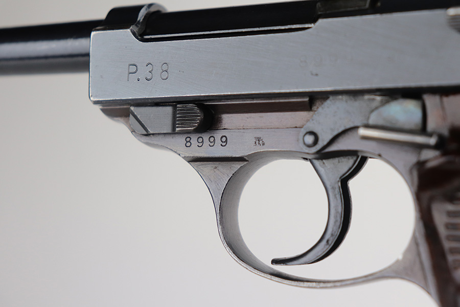 8/9/21 – This is a very nice example of a Walther P.38 issued to the Nazi military in 1945. It is all matching and has the proper “Eagle 359” military proofs. The serial number has no letter suffix. The gun has a proper late-war cog-style hammer. Most of the finish loss is on the front strap, but there are also hints of wear on the front edges of the slide and around the muzzle. Minor wear on the top of the barrel through the ejection port. Some small spots of oxidation on the top and right side of the slide and on the barrel. Comes with excellent late-war grips and a proper Walther magazine. The bore is excellent – shiny with strong rifling. De-cocker is functional.