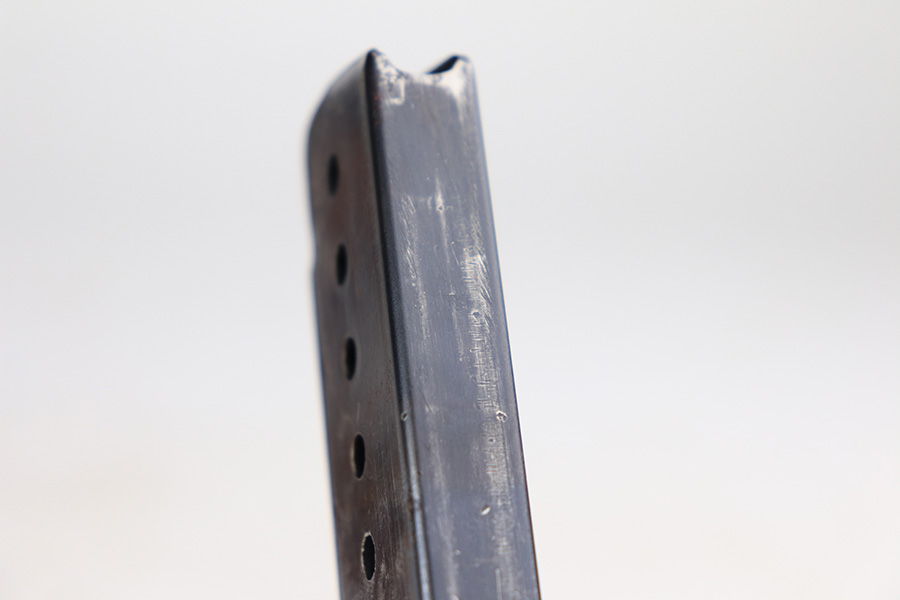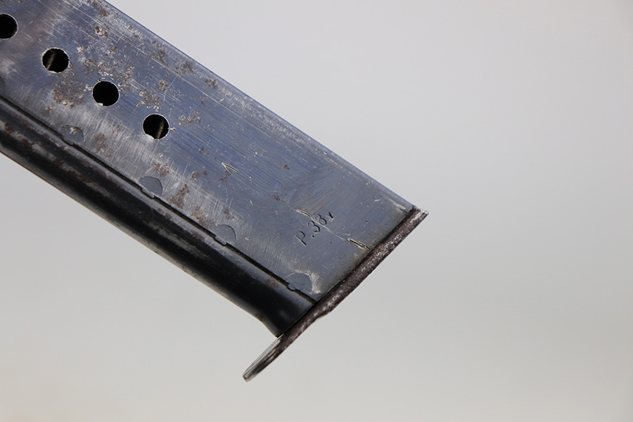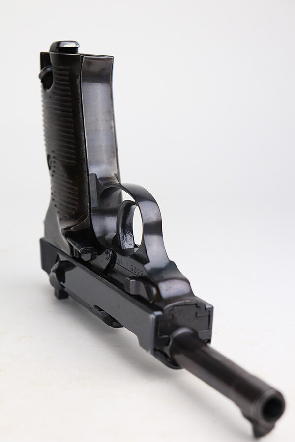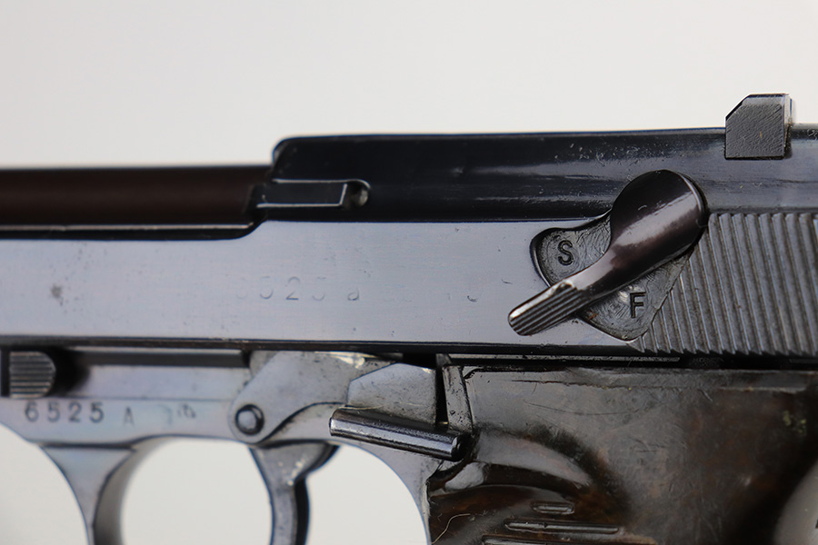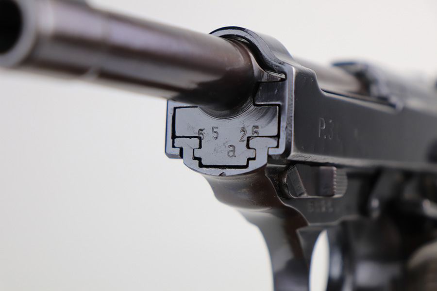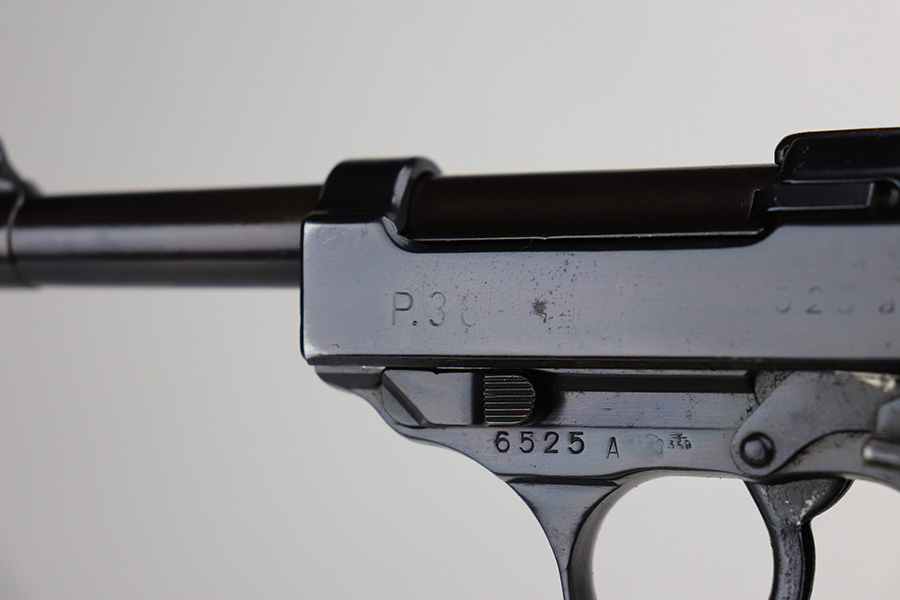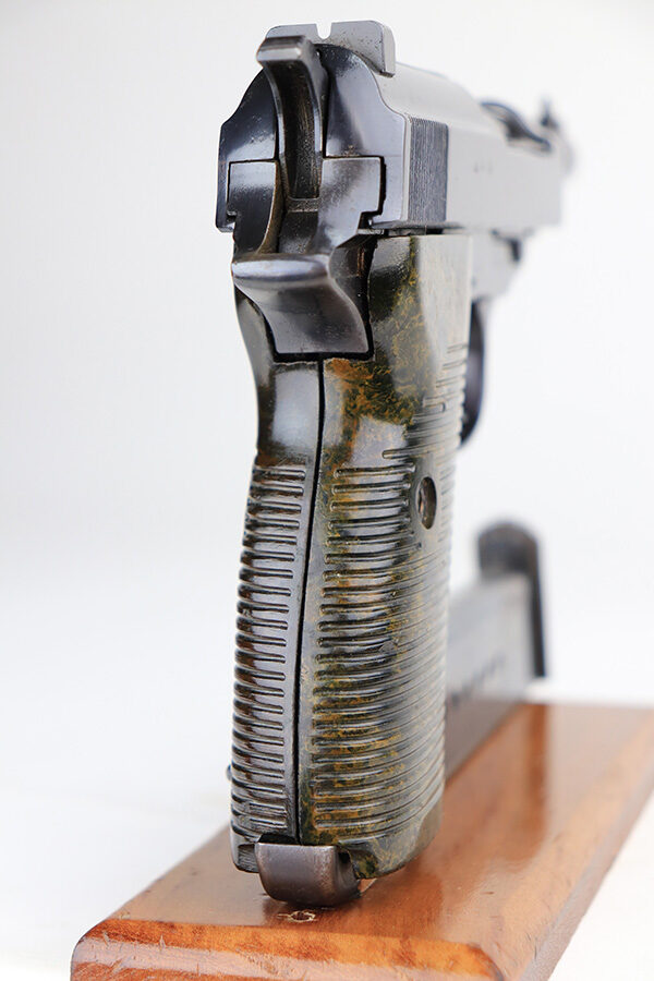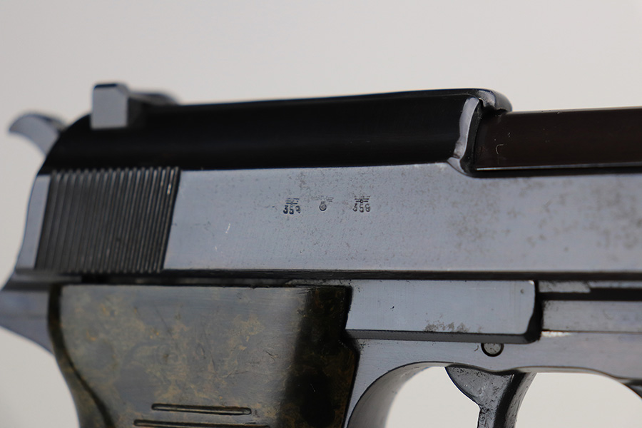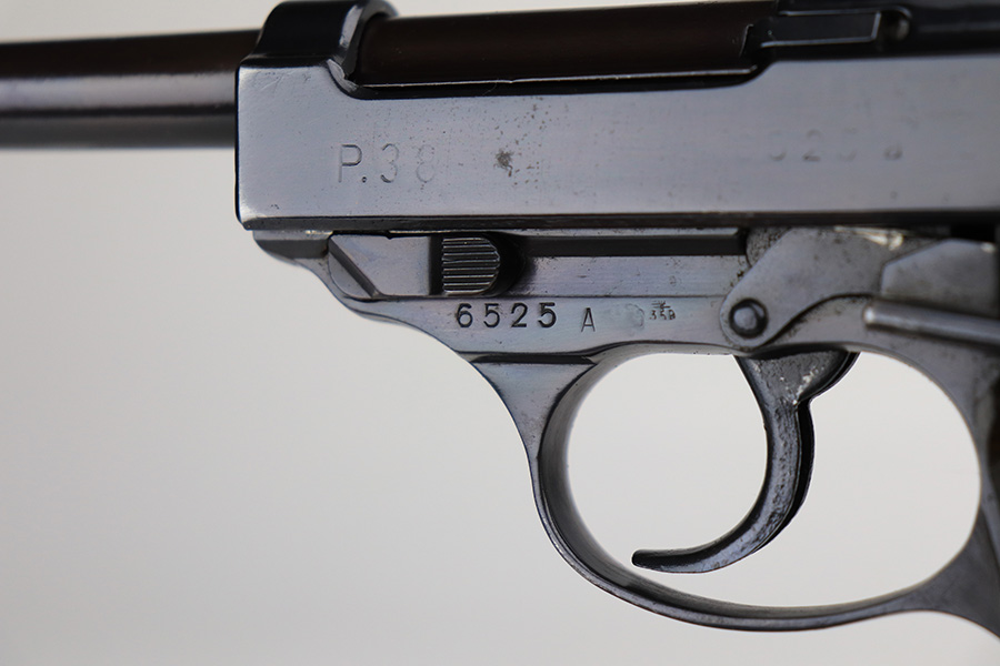 1/12/22 – This is a very nice example of an AC 45 Walther P.38 issued to the Nazi military in 1945. The gun is all matching and has the proper “Eagle 359” Nazi military acceptance proofs throughout. The gun has been buffed and refinished. It appears there was an additional marking on the left side of the frame that has been peened. The gun has retained about 97% of its new bluing. While there is very little actual finish loss, there are areas of pin-pricking that have been blued-over on the left side of the slide. Minor freckling on the right side of the slide and on the front strap. Comes with nice bakelite grips and a period-correct Walther magazine. The bore has decent rifling, but there is pitting in the grooves. De-cocker is functional.