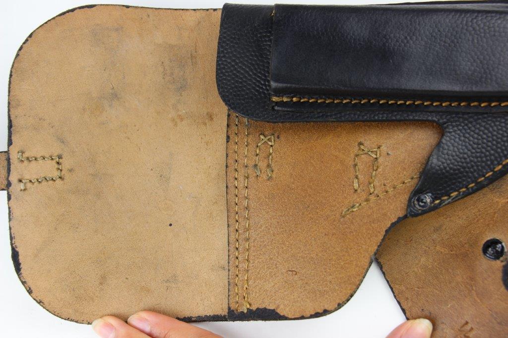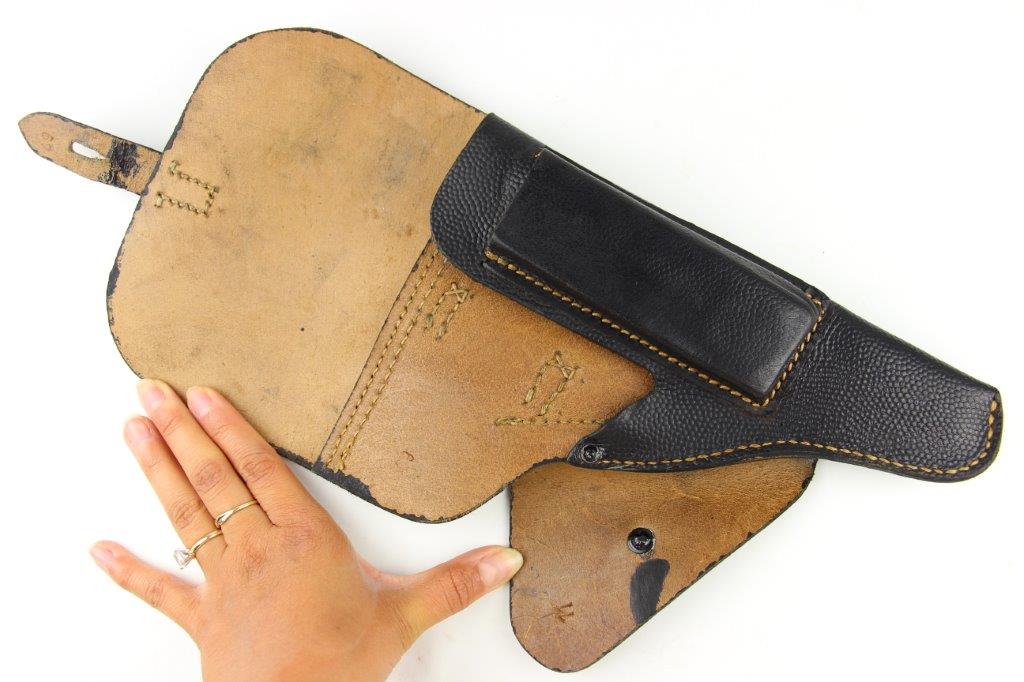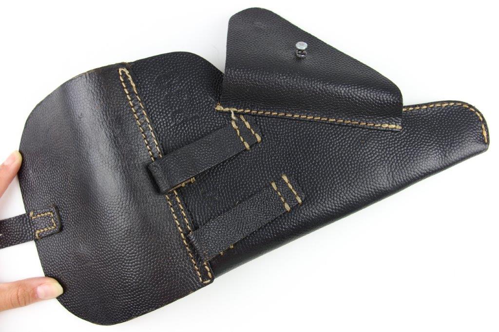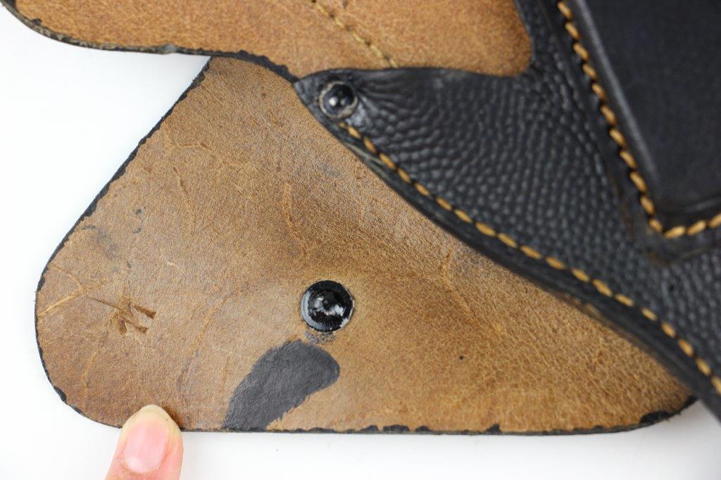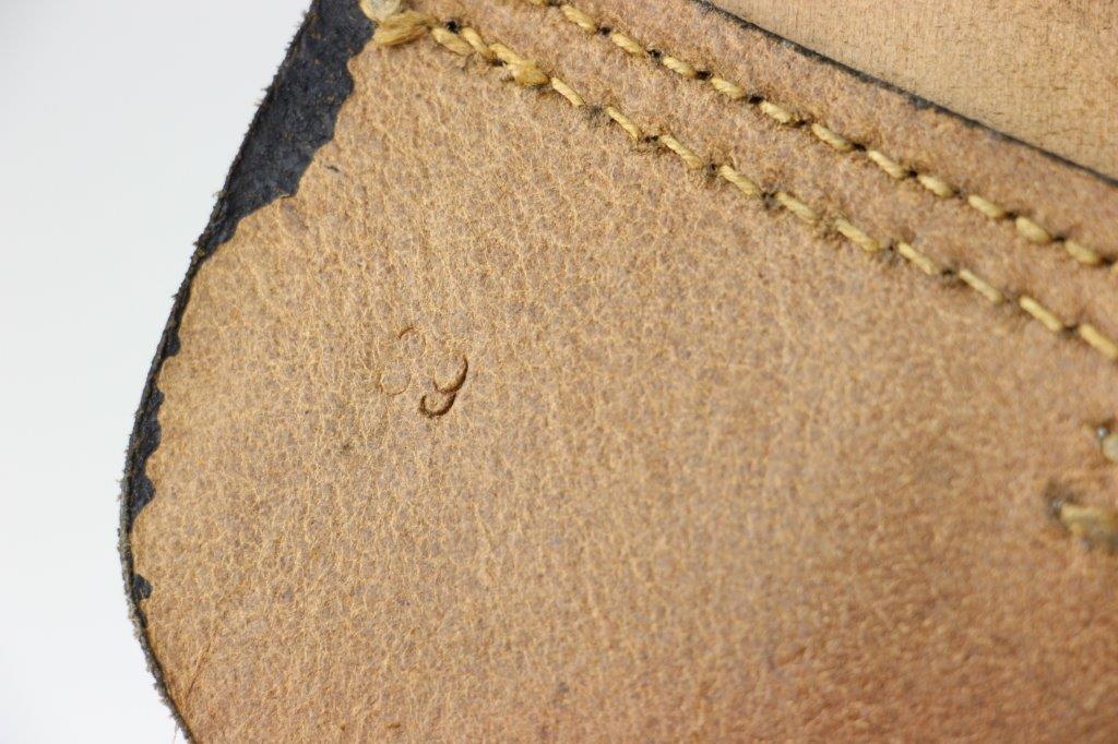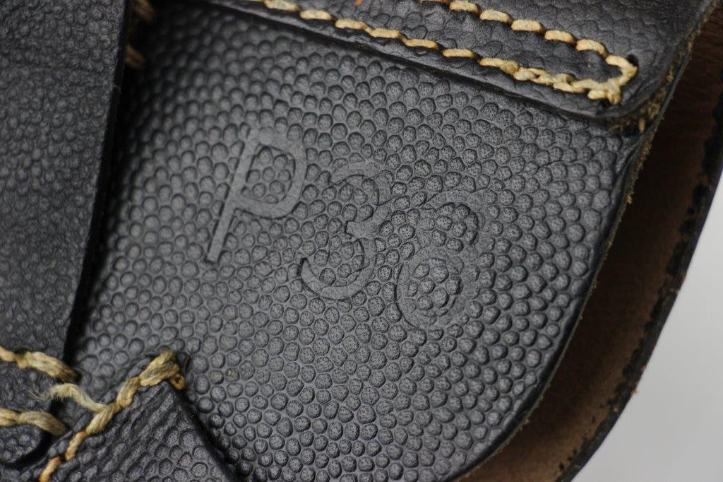 8/7/24 – This is a scarce 1945 dated soft shell style P.38 holster from the end of WW2. The holster is in minty, unissued condition with desirable pebble grain leather that’s crisp throughout the exterior. There’s some light rub wear on the magazine pouch, but this is minor. The holster is maker stamped CXB, 45 date stamped, and P.38 stamped on the back leather as shown. Excellent, tight, and all original stitching throughout. The leather is firm yet pliable with very clean interior. A textbook end-of-war production example!