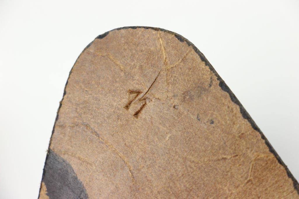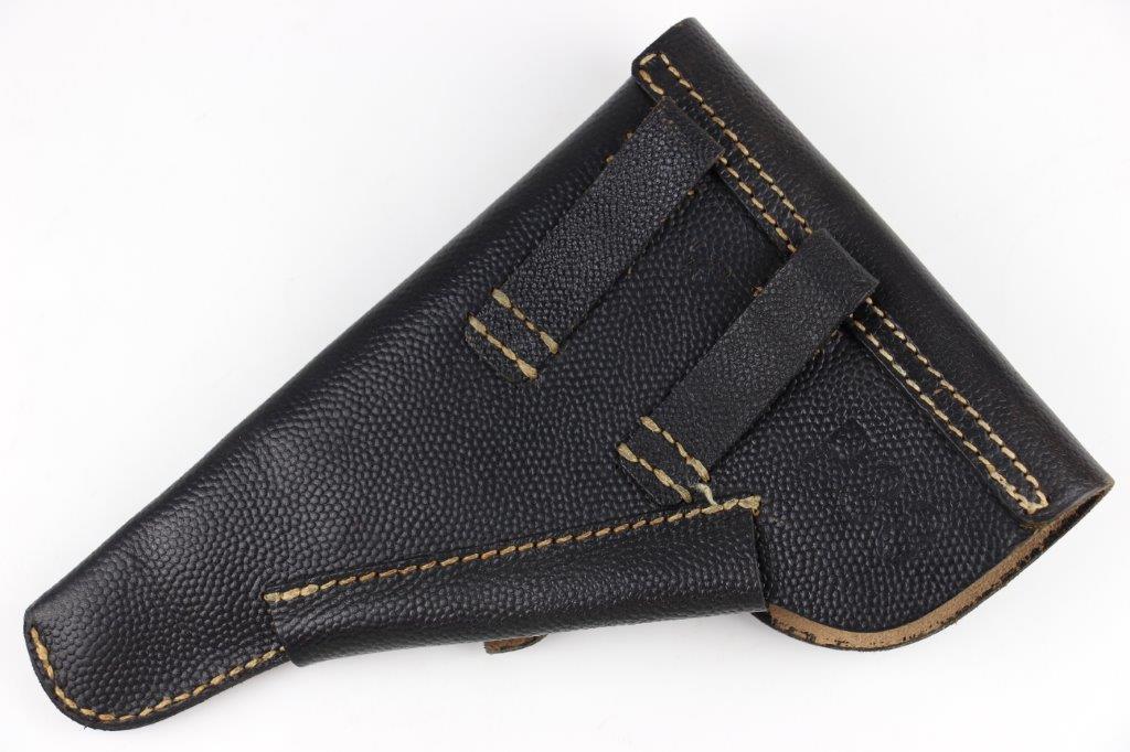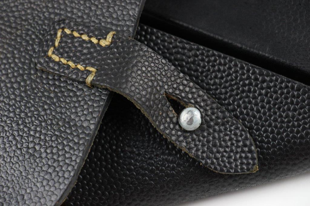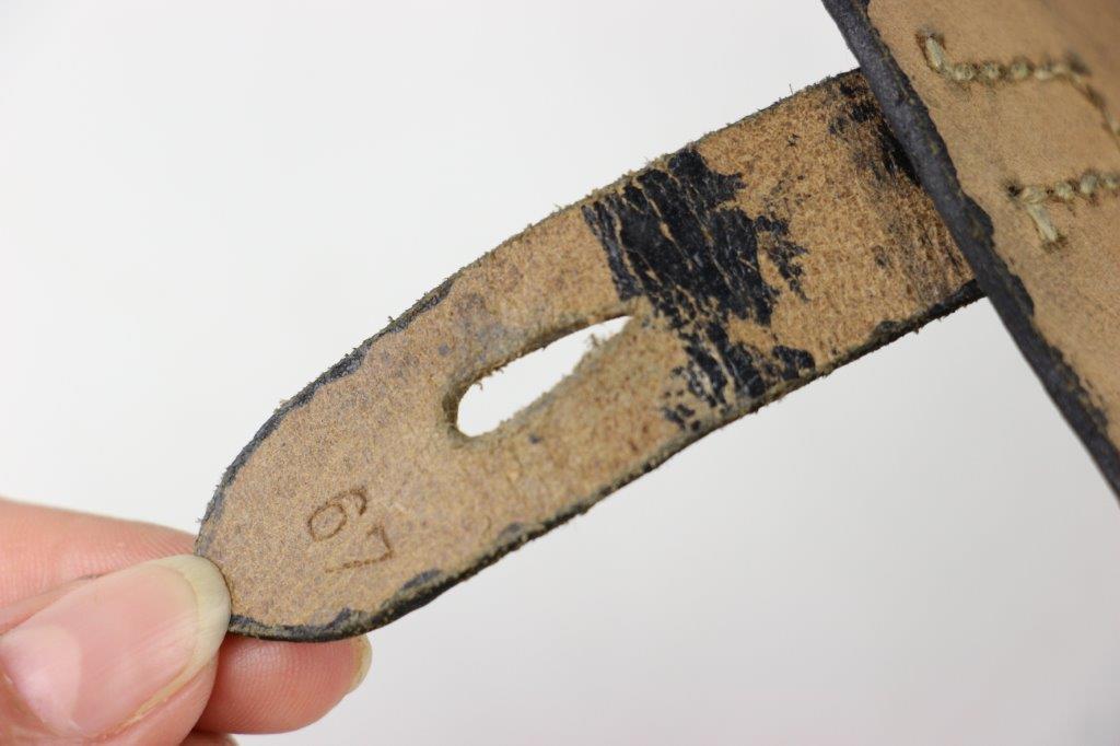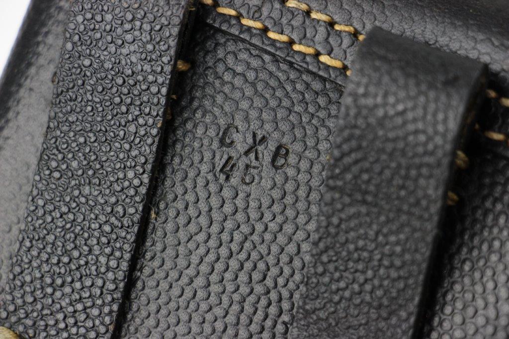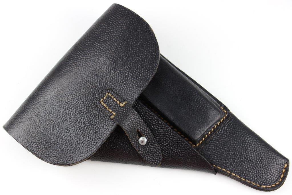 8/7/24 – This is a scarce 1945 dated soft shell style P.38 holster from the end of WW2. The holster is in minty, unissued condition with desirable pebble grain leather that’s crisp throughout the exterior. There’s some light rub wear on the magazine pouch, but this is minor. The holster is maker stamped CXB, 45 date stamped, and P.38 stamped on the back leather as shown. Excellent, tight, and all original stitching throughout. The leather is firm yet pliable with very clean interior. A textbook end-of-war production example!