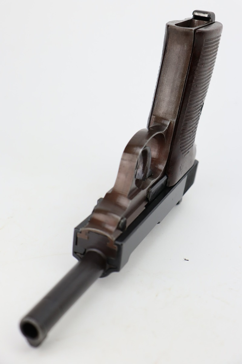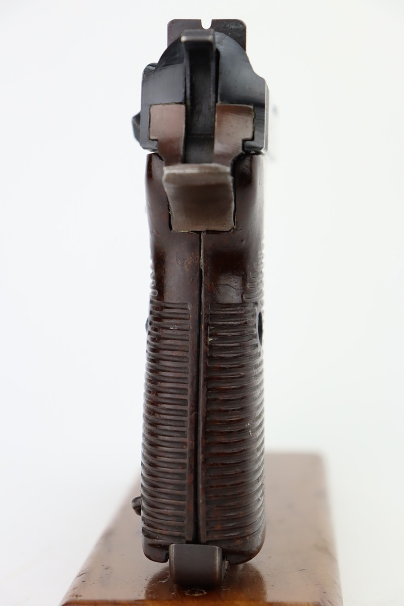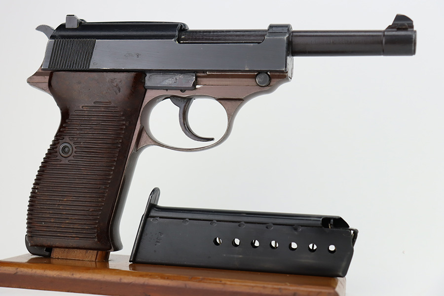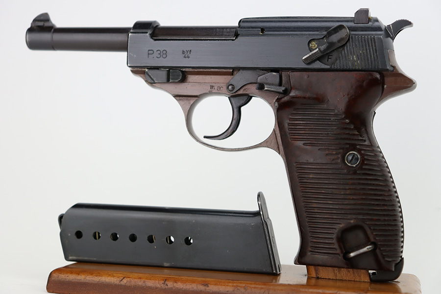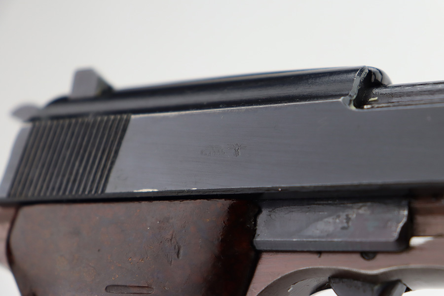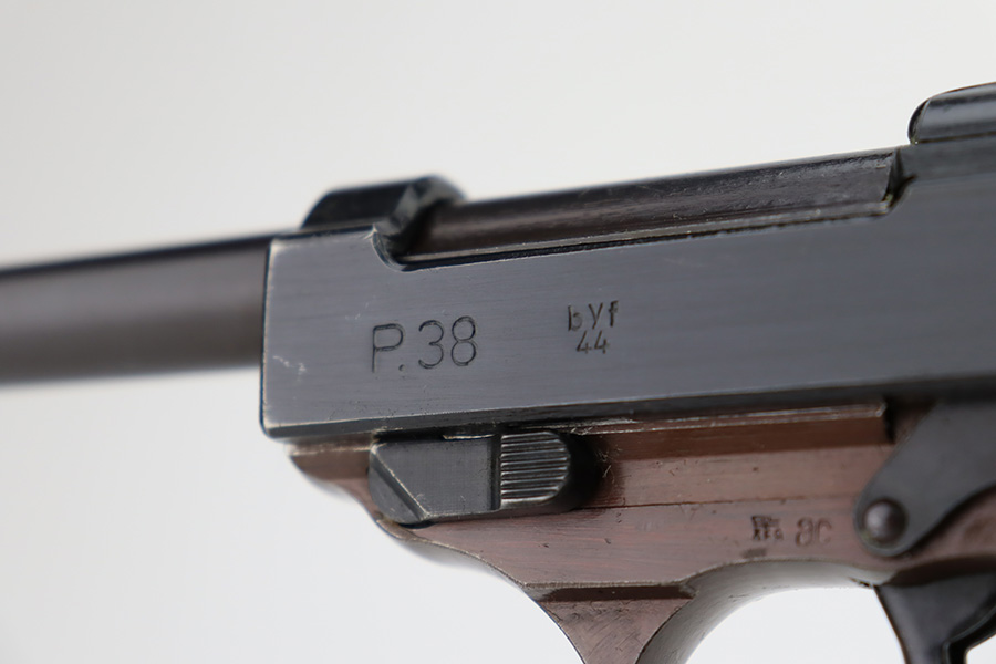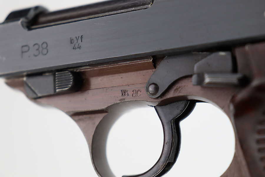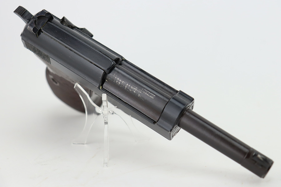 12/6/23 – This is a rare Mixed Parts P.38! Walther and Mauser parts with no serial number. This is a known and documented variation. It is a Late Date AC Frame P.38 (armorers replacement frame from Walther). Then, it has a Mauser byf 44 slide with NO serial numbers. Frame has the copper color to it found on some Walther AC late war guns. The barrel and locking block have no numbers on them either, however the barrel is 135 proofed (Mauser) and the locking block is 359 proofed (Walther). It’s a well-documented, but little a known category of P.38’s. These guns were made in 1945 towards the end. The general speculation is that these guns were not made at the main Walther or Mauser factories. In an effort to increase production, labor services were sought outside of the factories, with any parts they could get. Much of which were spare, salvaged or armorer’s parts. One theory is they were built using camp labor at the Neuengamme Concentration Camp. The magazine is Mauser WaA135 marked. The original finish rated at about 95% and the bore has strong rifling but cloudiness to it. Rates about 7 out of 10.