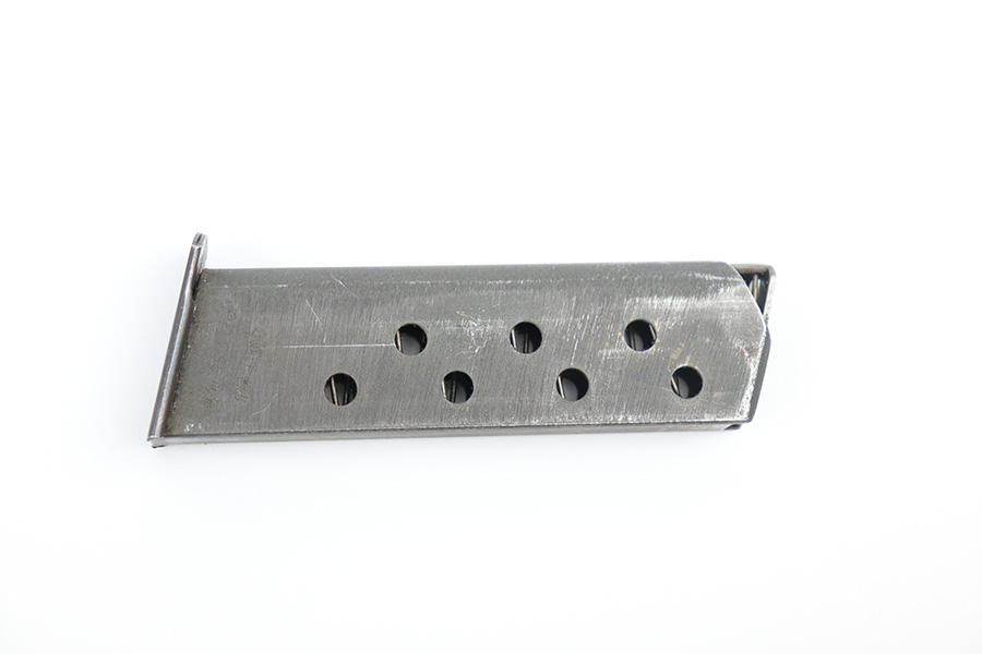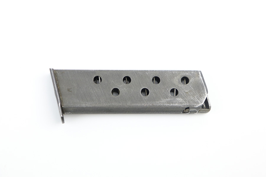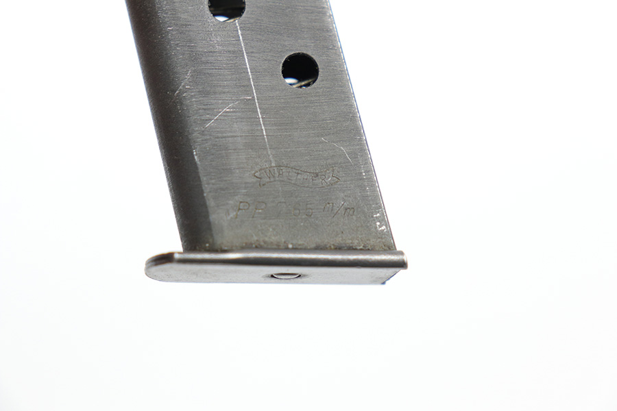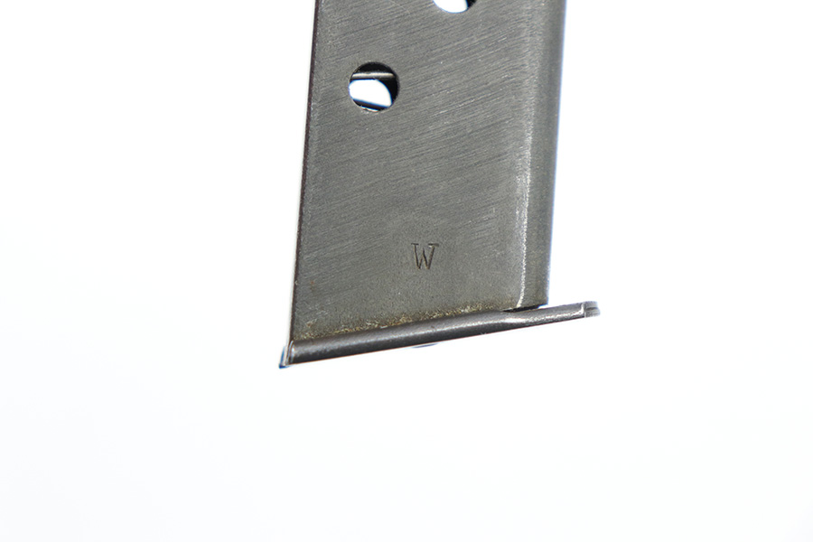 9/1/21 – This magazine is for a Walther PP. Produced in 1945, this magazine features a Walther banner, caliber stamp, and “W” mark. The “W” mark indicates that the magazine was not hardened during the manufacturing process. The magazine tube has a phosphate finish and is in overall good condition.