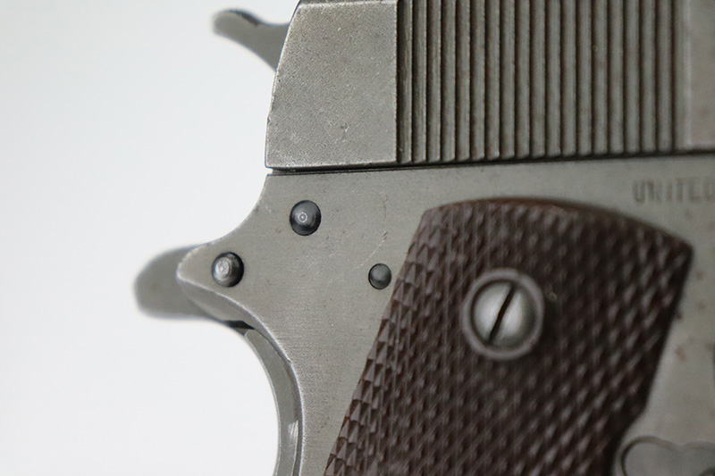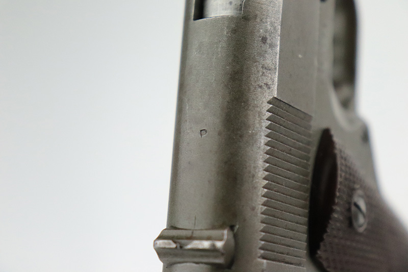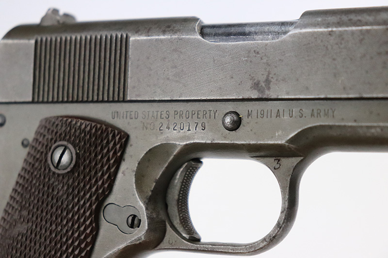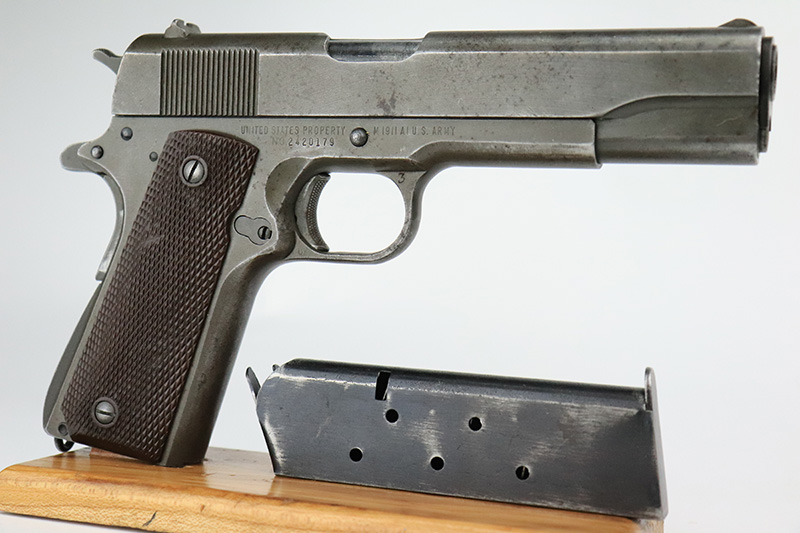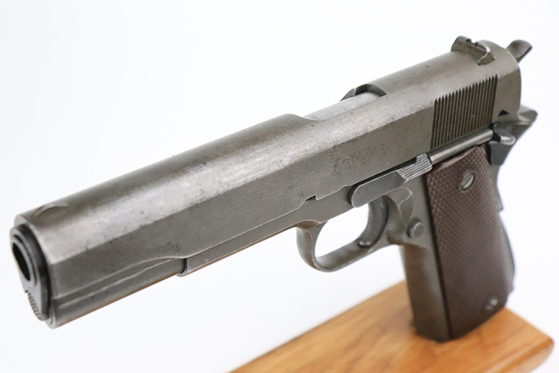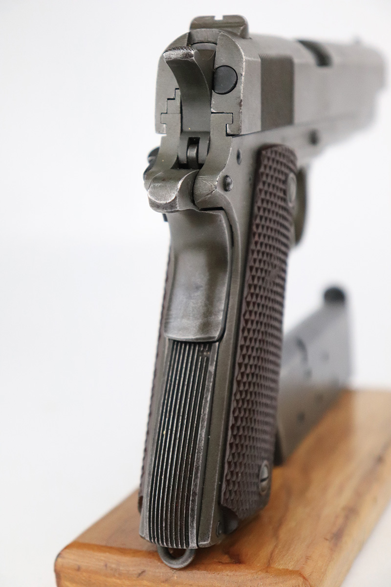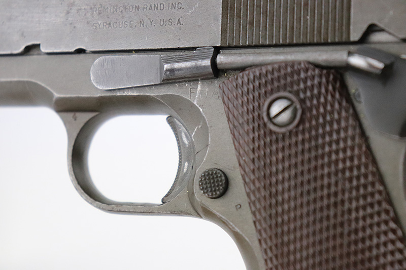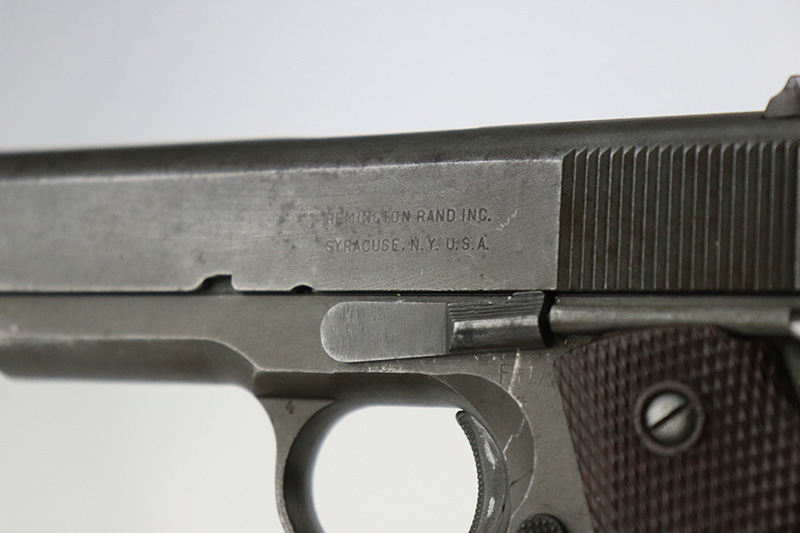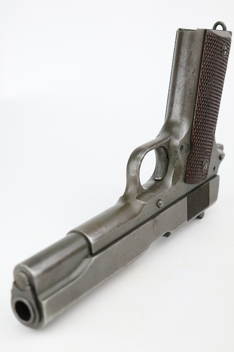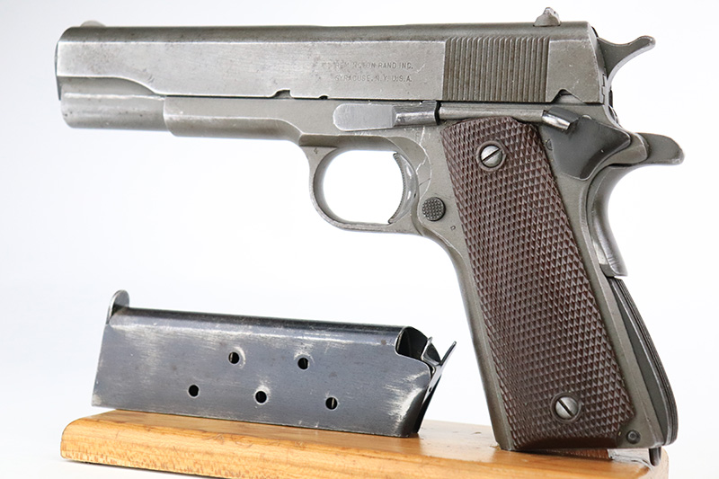 9/22/22 – This is a nice example of a Remington Rand Model 1911A1 issued to the US military in 1945. It is “United States Property” marked and has the proper “FJA” and cross-canon military proofs. It also has a proper High Standard barrel. The finish on this gun is a little difficult to rate, but we estimate it has retained somewhere between 85-90%. There appears to be very minor thinning in the finish throughout and very minor wear around the high edges. There is light spotty oxidation covering most of the gun. It comes with very nice period-correct reddish grips and a proper “R” marked magazine. The bore has great rifling with very minor frosting throughout.
