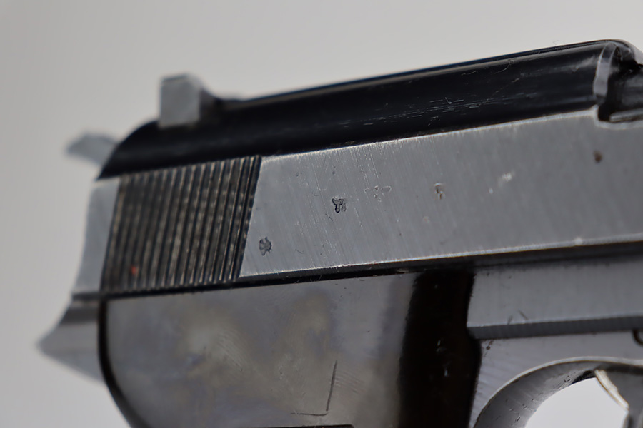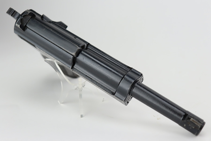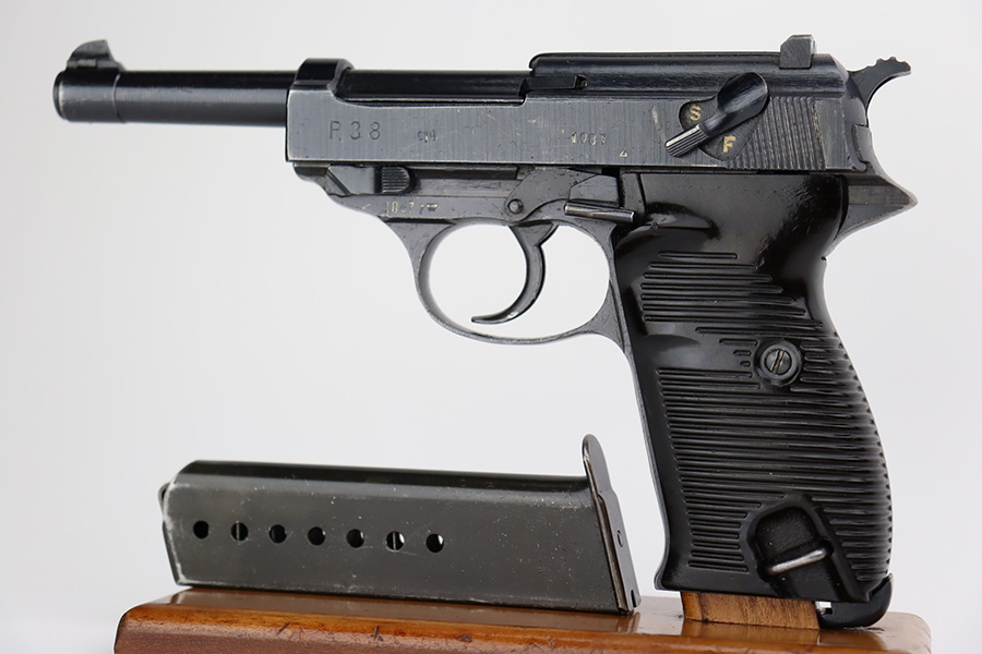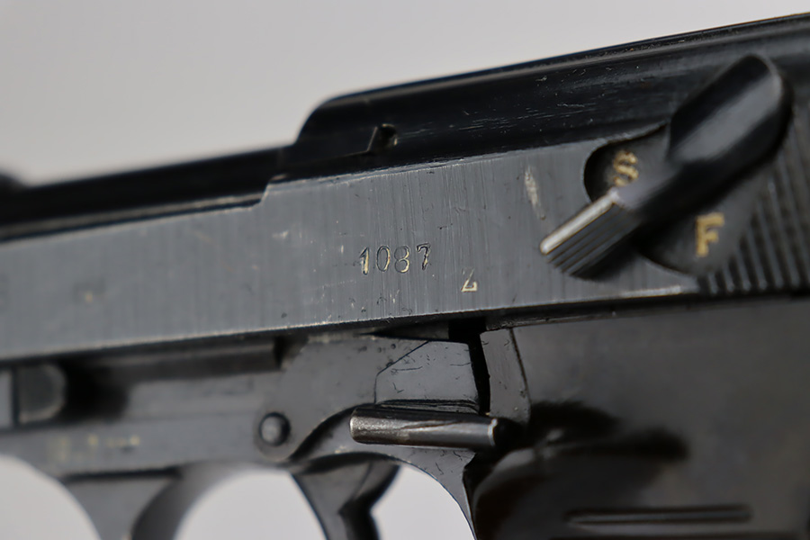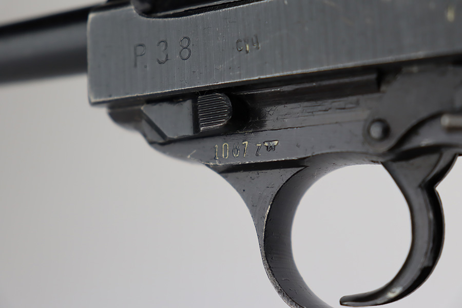 10/10/23 – This is a Spreewerk P.38 issued to the Nazi military in January of 1945. All matching with the proper “Eagle 88” military acceptance proofs. This pistol has a couple of unique, late-war “errors”. The original factory paint in the ‘S’ and ‘F’ on the slide are both in the white. Also, the back side of the frame has a finish error (been ground through). All as it came from the factory though. The bluing rates about 90%. Nearly all of the finish loss is on the front strap. Hints of wear around the muzzle and on the high edges of the slide. Tiny scratches and handling marks along both sides of the slide. Fitted with excellent black bakelite grips and comes with a period-correct jvd magazine. The bore has good rifling, but there are some small pits in the grooves. De-cocker is functional.