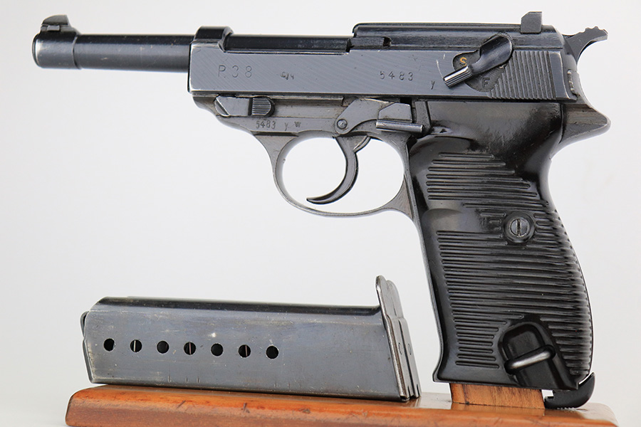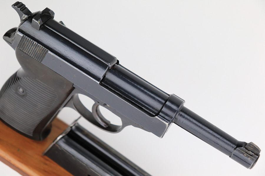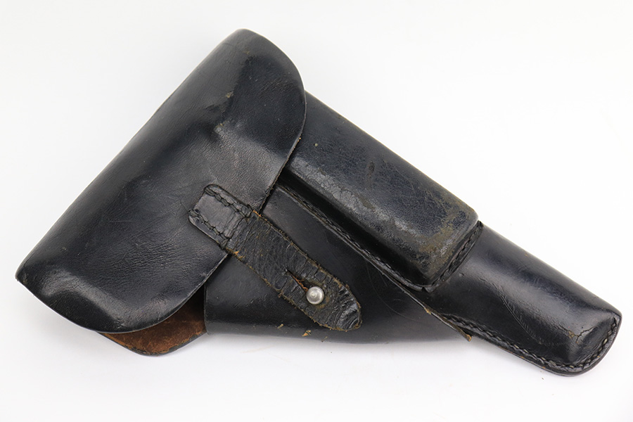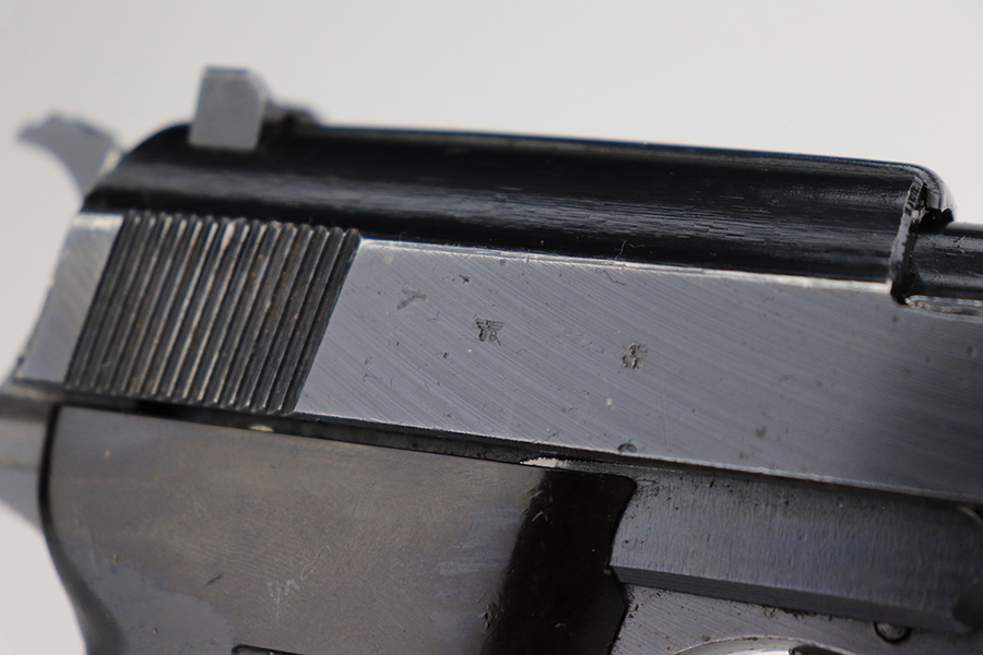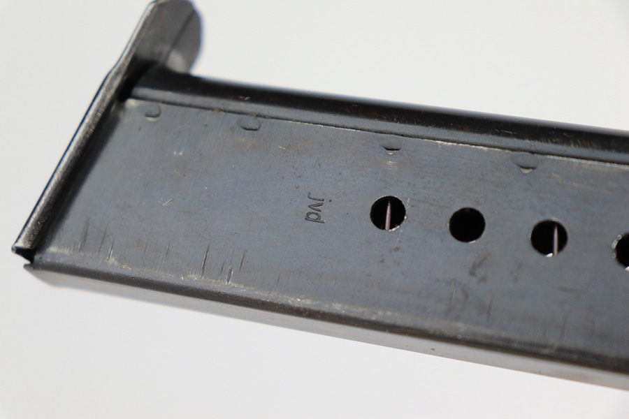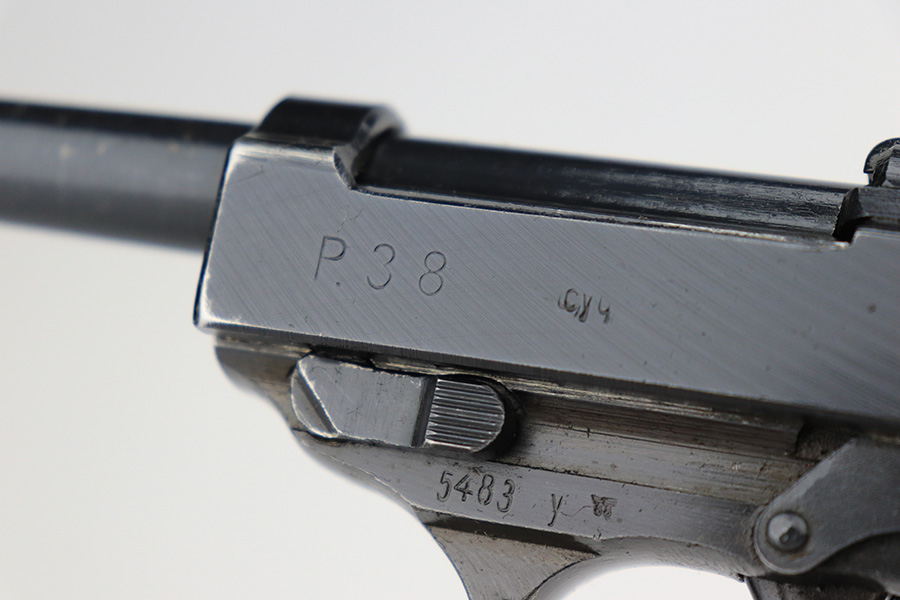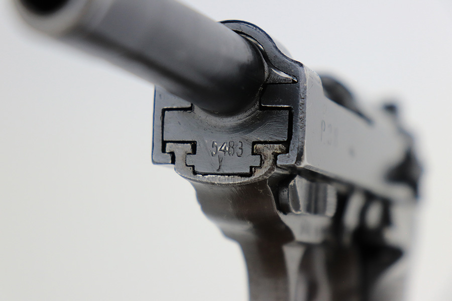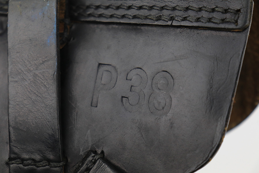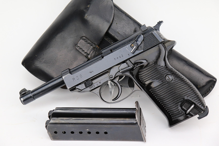 5/25/23 – This is a very nice example of a Spreewerk P.38 issued to the Nazi military in January of 1945. It is all matching with the proper “Eagle 88” military acceptance proofs throughout. It comes as a rig with a very nice 1944-dated soft shell holster, one jvd magazine, and one rare late-war “U” marked Walther magazine. The gun itself has retained somewhere between 85-90% of its original finish with the majority of finish loss on the front strap. Very minor wear around the muzzle and on some of the high edges of the slide. A small area of minor casting flaws on the right side of the frame, typical for these end-of-war guns. Fitted with excellent blackish-brown bakelite grips. The bore has great rifling, but there is light freckling in the grooves. De-cocker is functional.