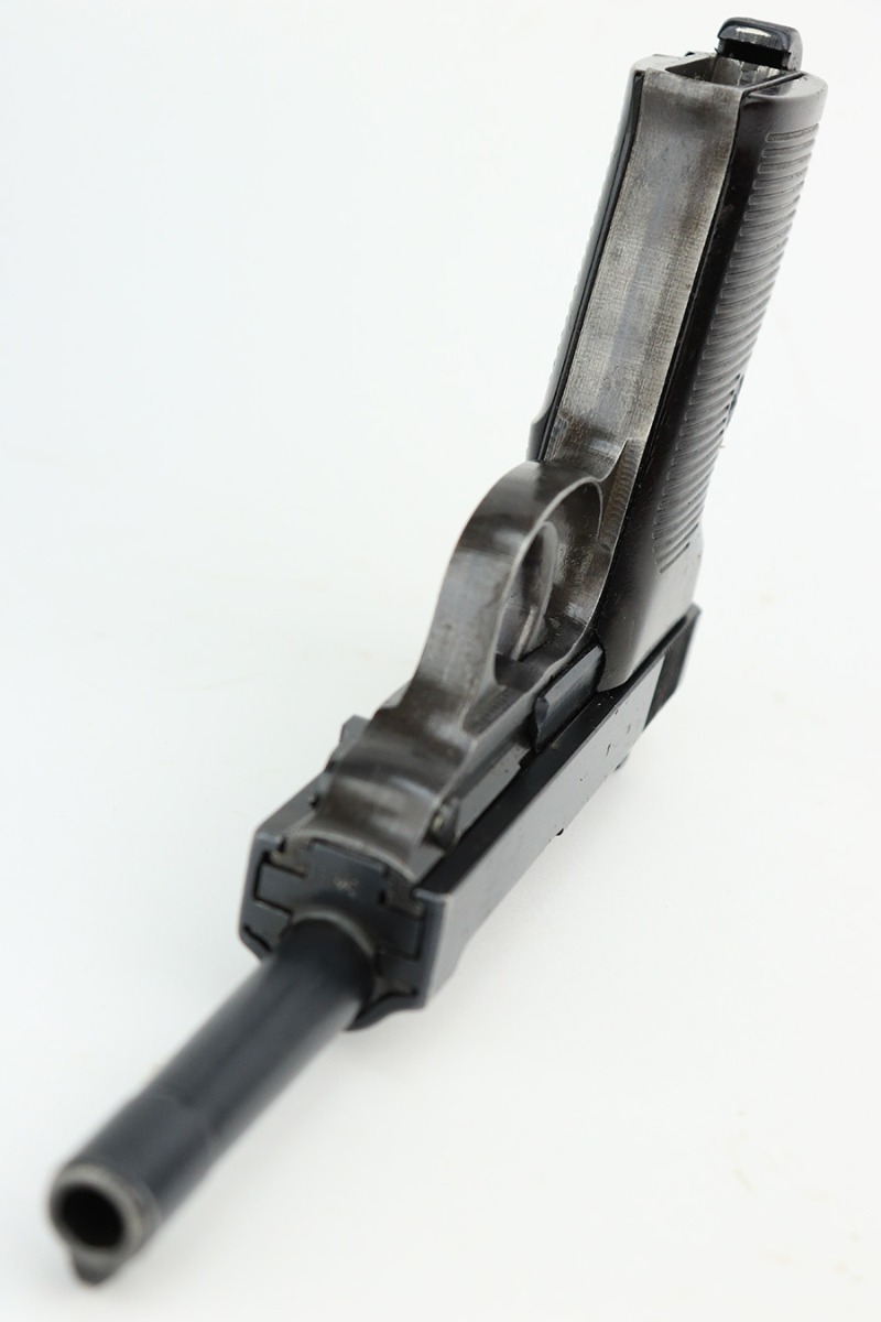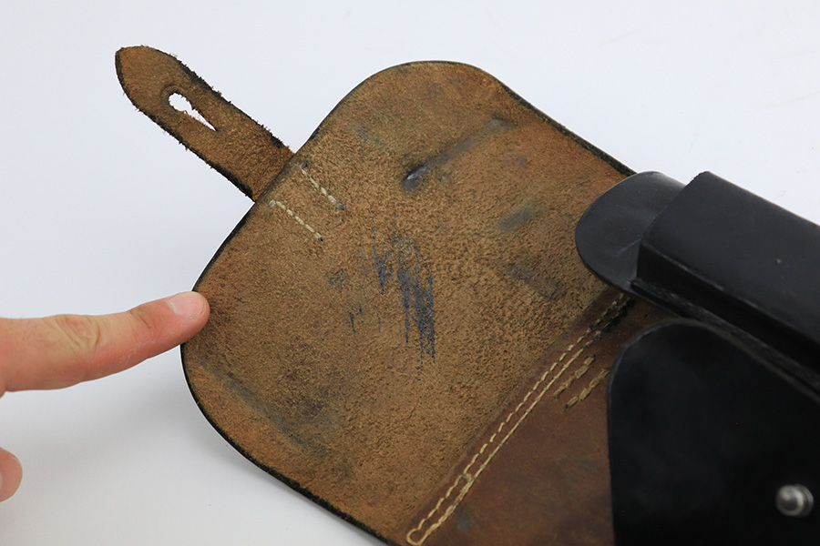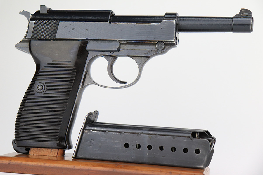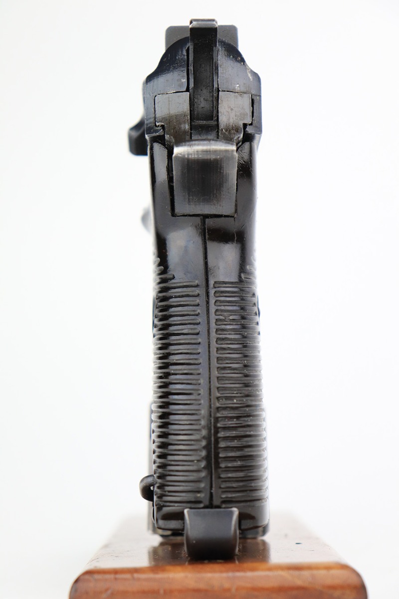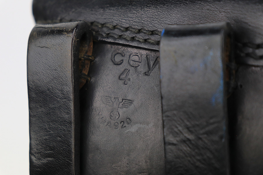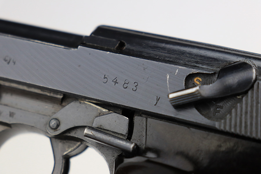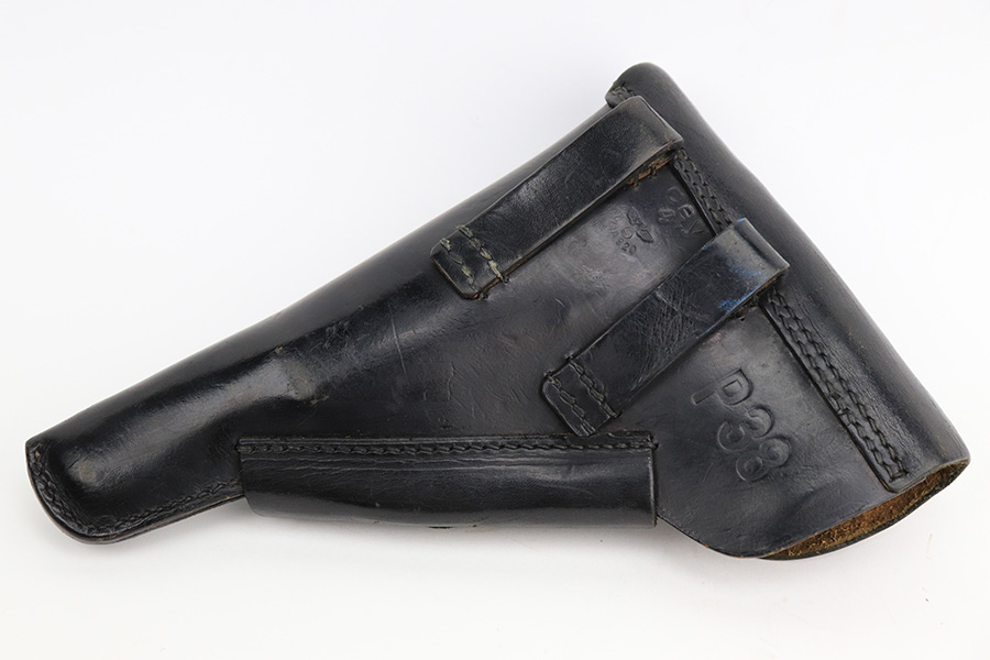 5/25/23 – This is a very nice example of a Spreewerk P.38 issued to the Nazi military in January of 1945. It is all matching with the proper “Eagle 88” military acceptance proofs throughout. It comes as a rig with a very nice 1944-dated soft shell holster, one jvd magazine, and one rare late-war “U” marked Walther magazine. The gun itself has retained somewhere between 85-90% of its original finish with the majority of finish loss on the front strap. Very minor wear around the muzzle and on some of the high edges of the slide. A small area of minor casting flaws on the right side of the frame, typical for these end-of-war guns. Fitted with excellent blackish-brown bakelite grips. The bore has great rifling, but there is light freckling in the grooves. De-cocker is functional.