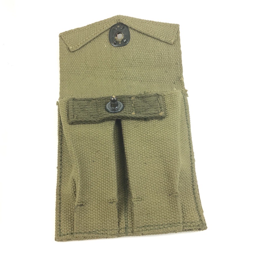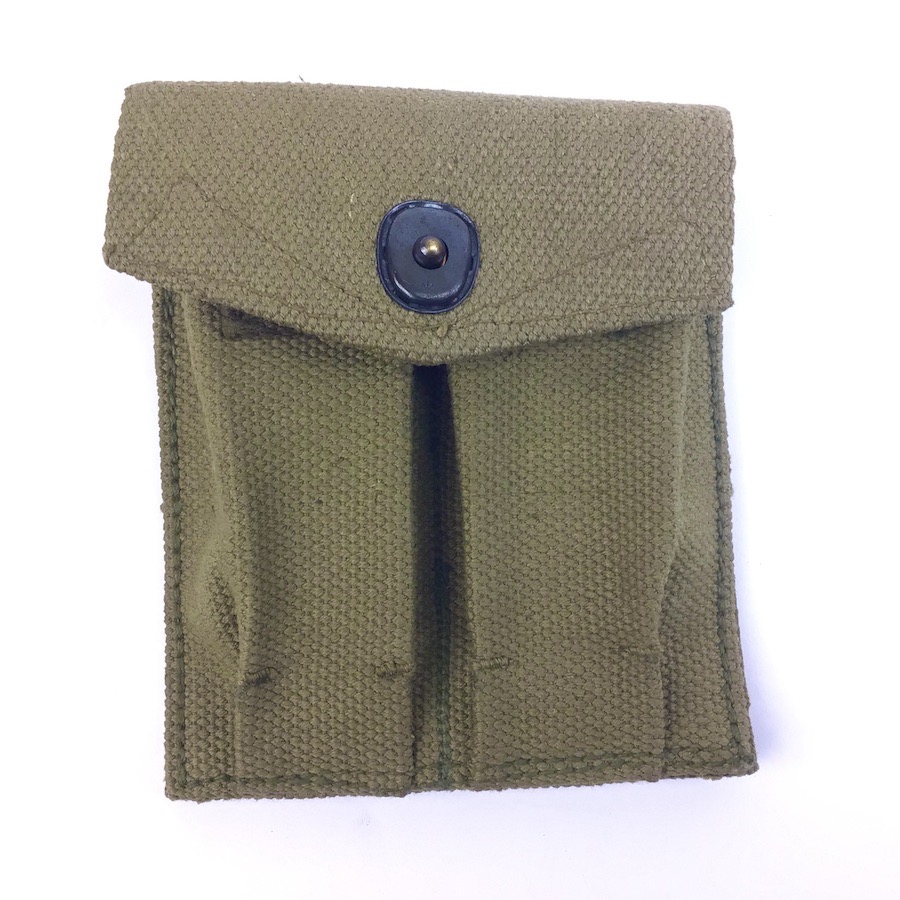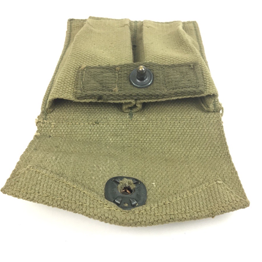 5/7/24 – This is an original USMC magazine pouch for the M1911A1 pistol. The canvas pouch is in excellent condition with only mild use wear. The backside is USMC ink stamped with a maker and date ink stamp underneath. No stitching issues.