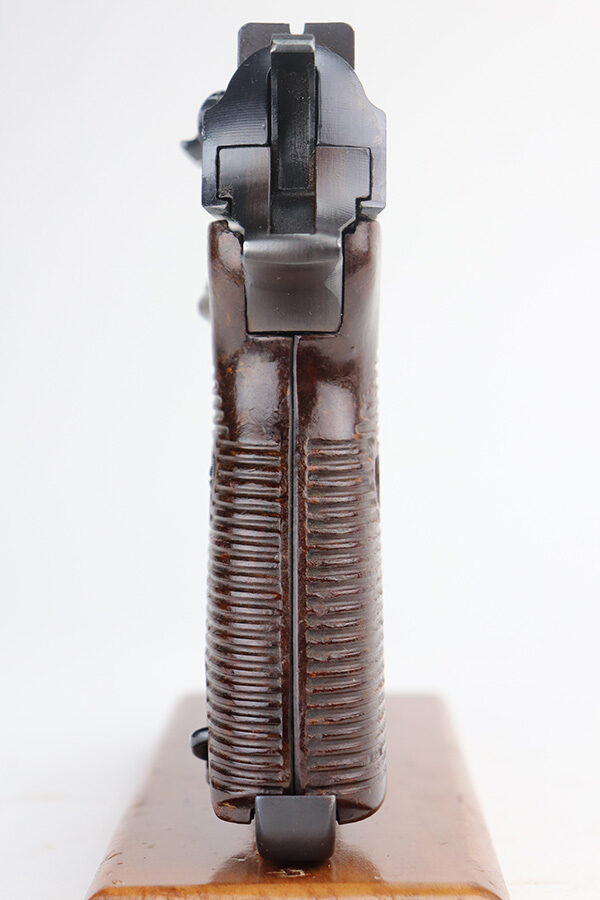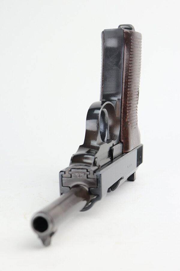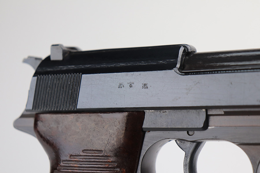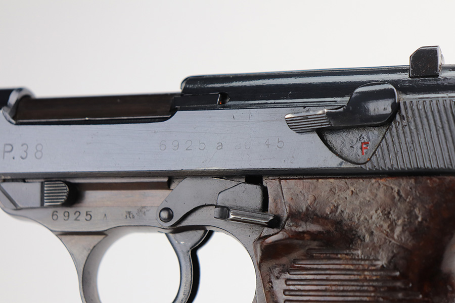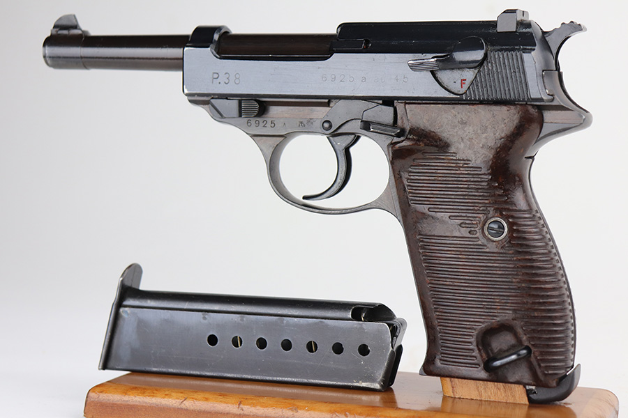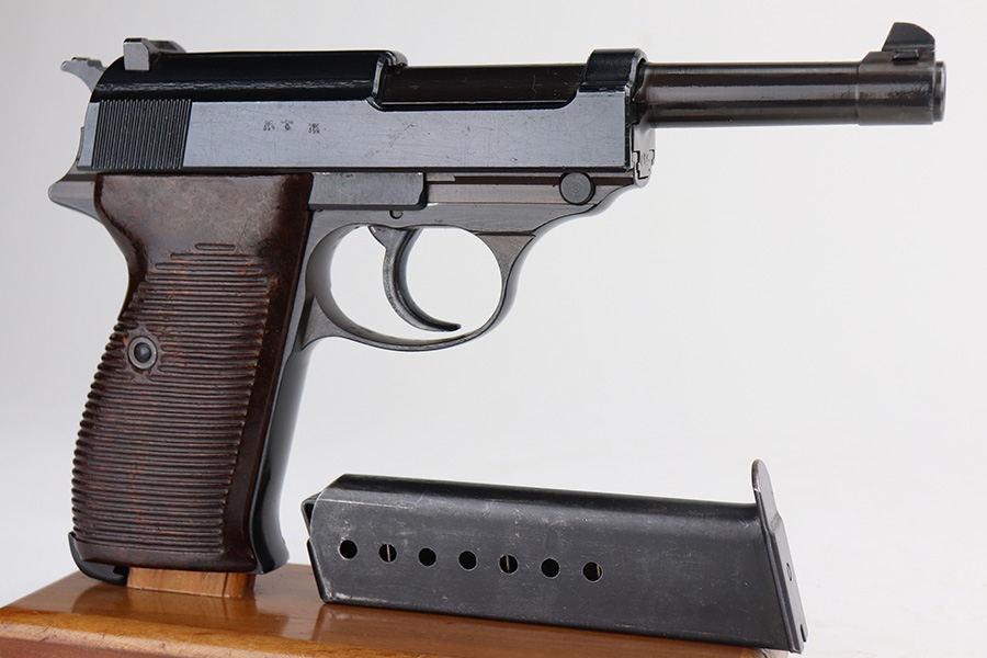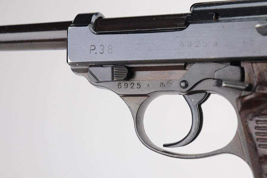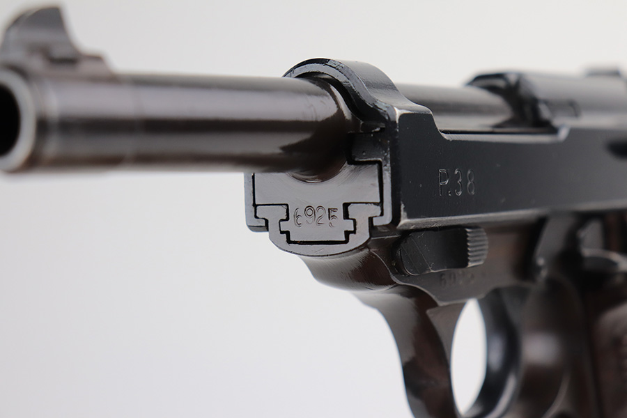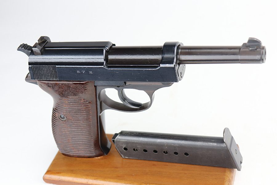 6/8/21 – This is an excellent example of a Walther P.38 that was initially issued to the Nazi military in 1945. It is all matching and has the proper “Eagle 359” military proofs. Late-war cog hammer. The gun was reworked after the war and issued to the East German police force. There is a police “sunburst” proof on the left side of the frame. The barrel and locking block were numbered at the police arsenal to match. They must have used leftover parts, because the barrel has a commercial “Crown N” proof. It has retained about 99% of its finish with just a hint of wear at the front of the slide and around the muzzle. Excellent grips and an un-marked magazine. Mint bore. De-cocker is functional.
