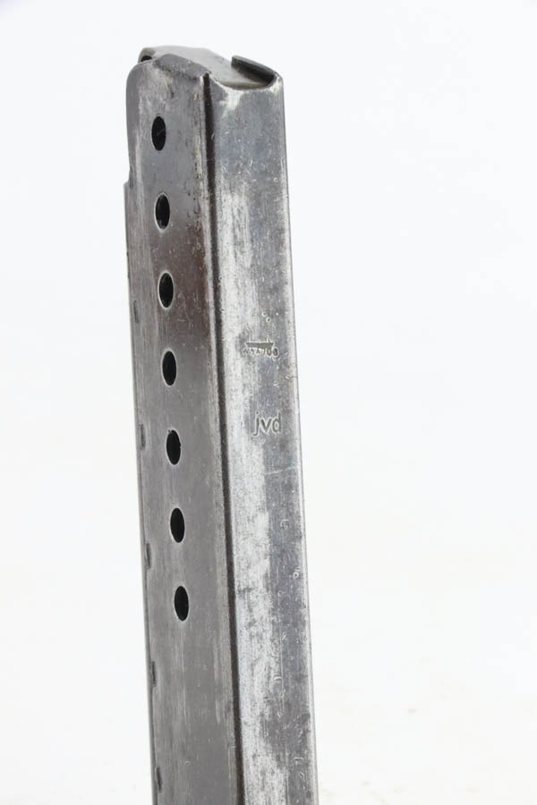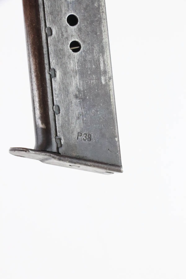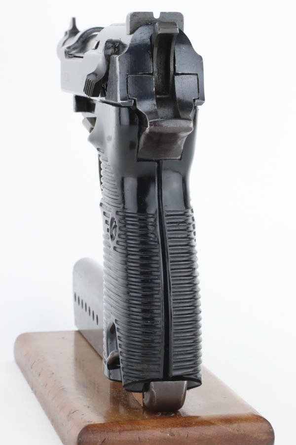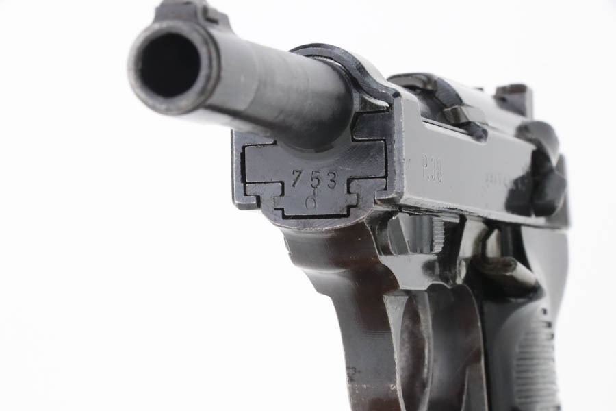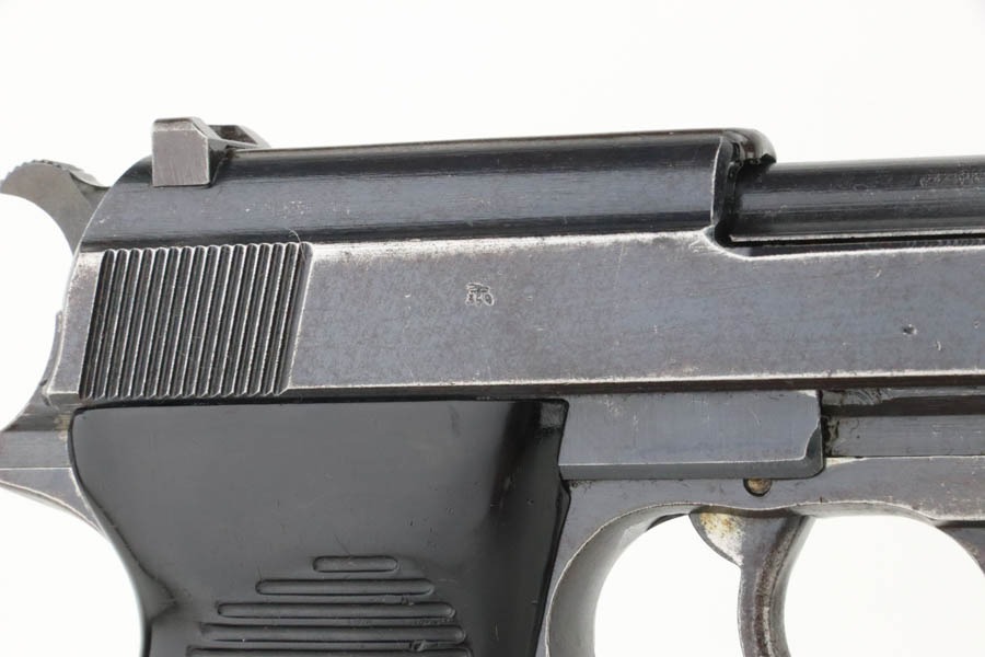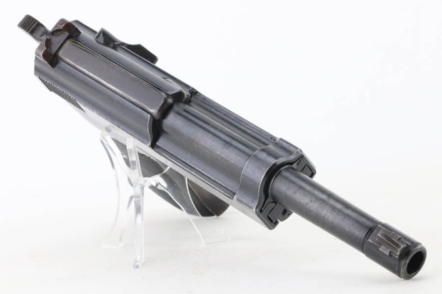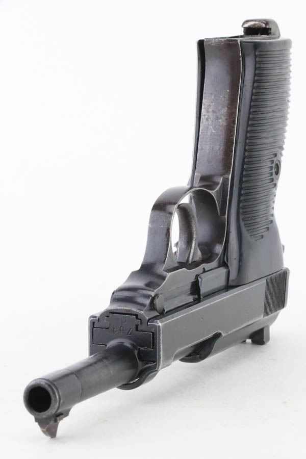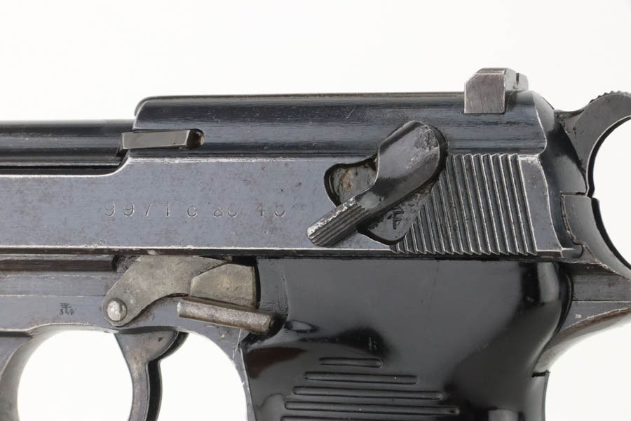 10/16/24 – This is a very nice example of an AC 45 Walther P.38 made at the very end of WW2. This is a GI mismatched gun, put together by an American GI when the Walther factory was liberated. All of the parts are mismatched and in the proper “c and d” serial blocks, correct for this variation. The barrel is in the “d” block, a desirable trait for some collectors. It also only has one “Eagle 359” military acceptance proof on the right side of the slide, indicating it was never issued. The unique thing about this one is that the frame has no serial number, just one “Eagle 359” proof. The locking block is un-marked and un-numbered. Some phosphate small parts, correct for this variation. Its finish rates about 93%. General high edge wear with minor thinning on the front strap. Brown patina on the front strap with minor spotty oxidation here and there. Some pitting on the safety lever. Fitted with black plastic grips and comes with a “Waffen 706” jvd magazine. Excellent bore. De-cocker is not functional. The hold-open does not function properly with this magazine.