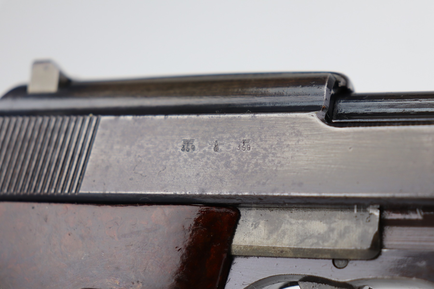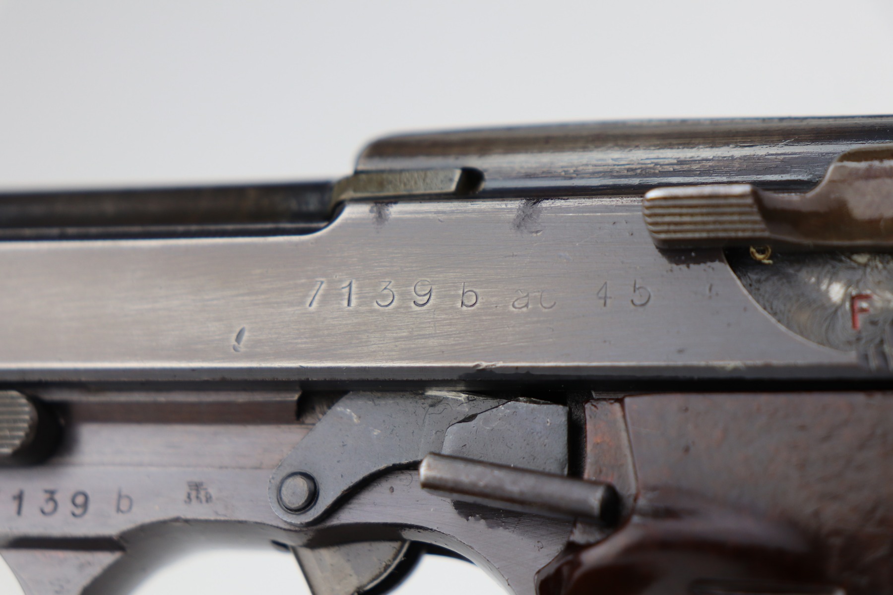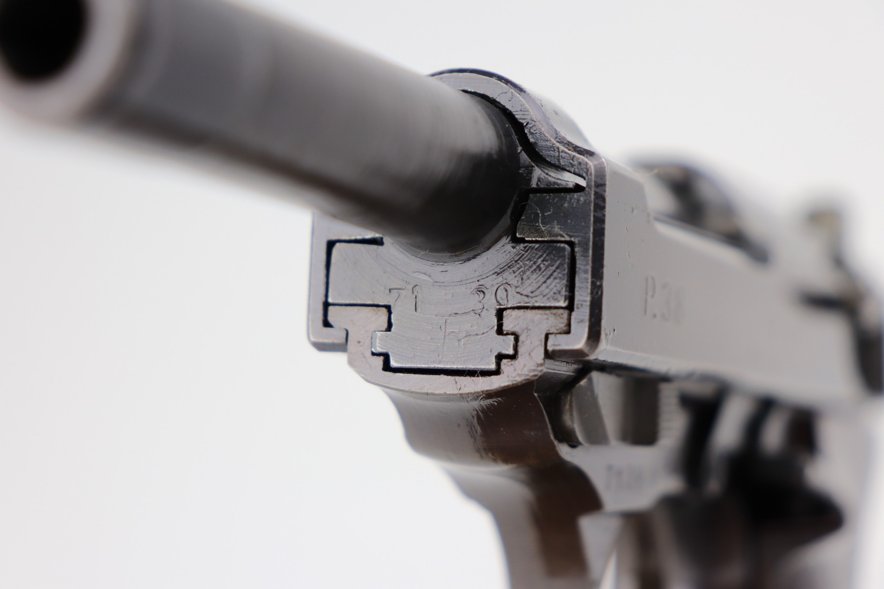 3/17/21 – This is a nice example of a Walther P.38 issued to the Nazi military in 1945. The gun is all matching and has the proper “Eagle 359” military proofs. The gun comes with a nice 1944-dated holster and two period-correct magazines. It has retained only about 40% of its original finish. There are areas of thinning and spotty oxidation throughout. It comes with excellent grips. The bore is mint. De-cocker is functional.