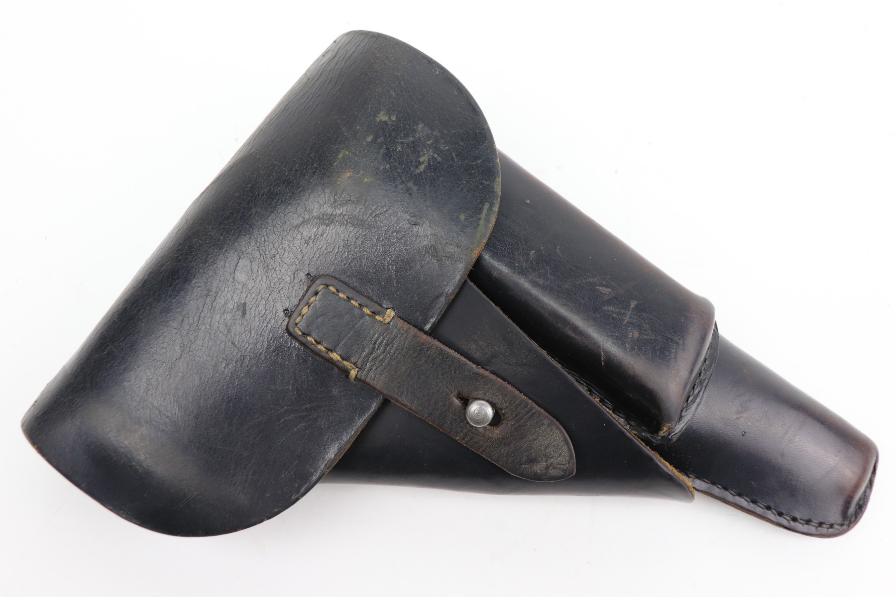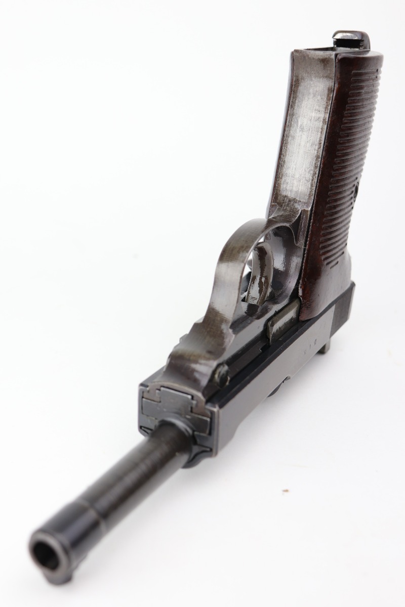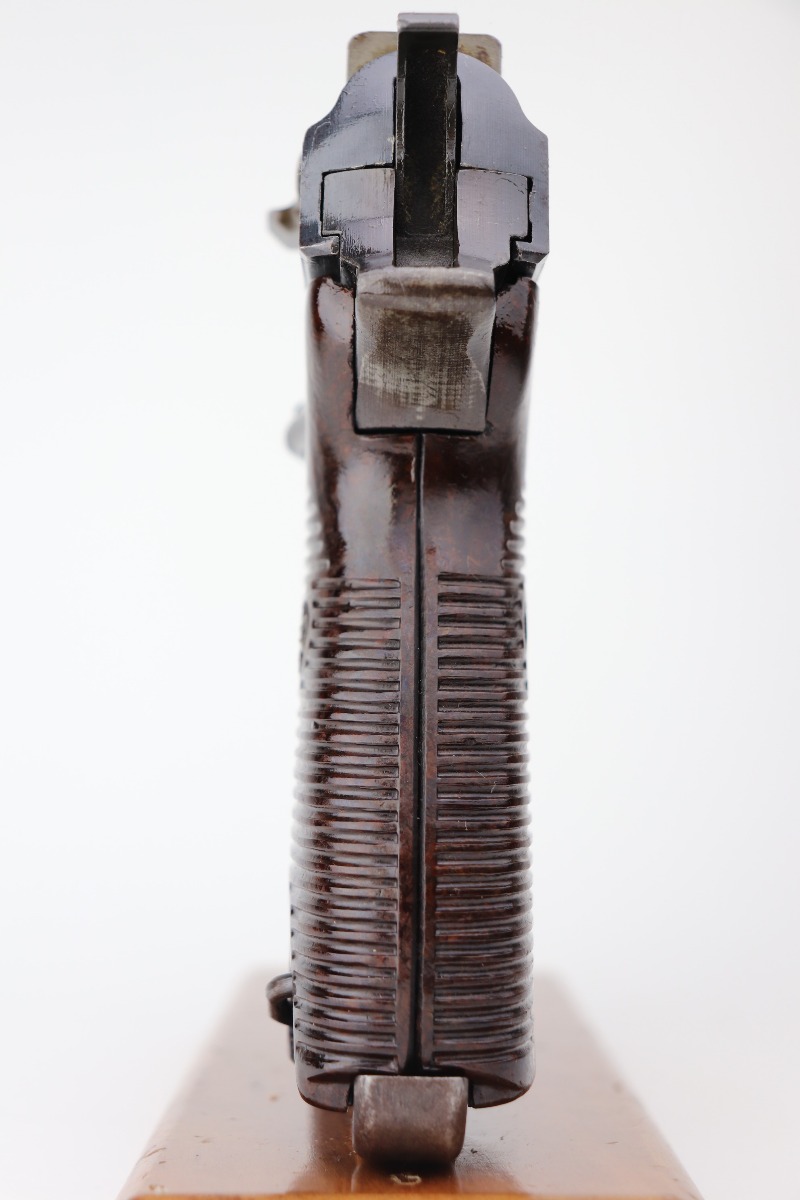 3/17/21 – This is a nice example of a Walther P.38 issued to the Nazi military in 1945. The gun is all matching and has the proper “Eagle 359” military proofs. The gun comes with a nice 1944-dated holster and two period-correct magazines. It has retained only about 40% of its original finish. There are areas of thinning and spotty oxidation throughout. It comes with excellent grips. The bore is mint. De-cocker is functional.