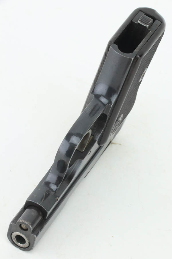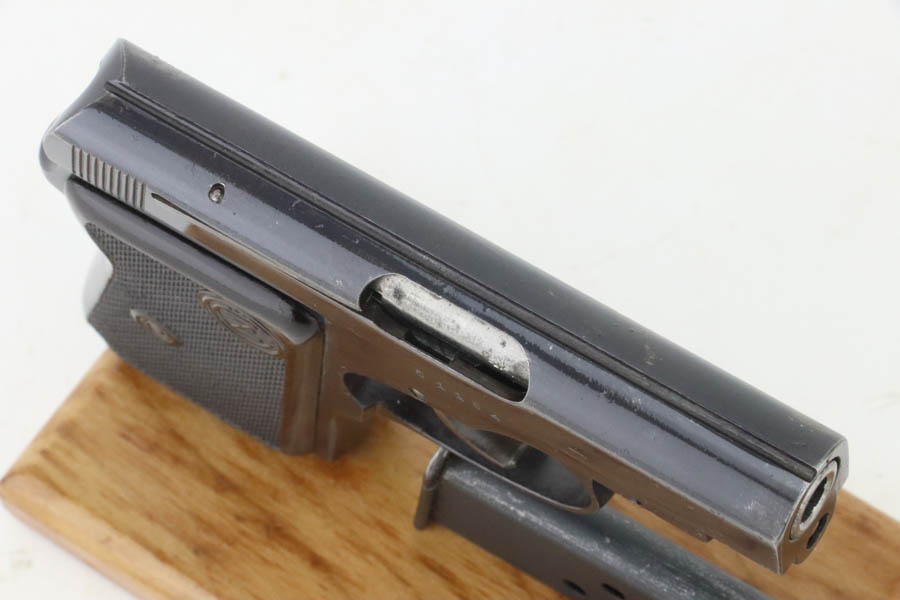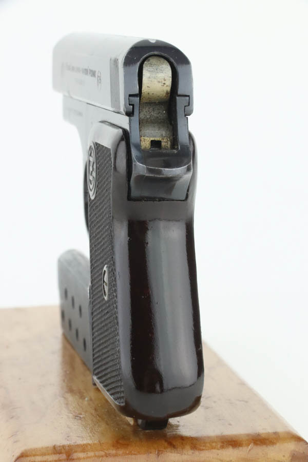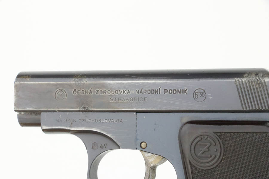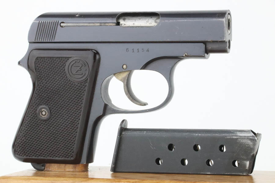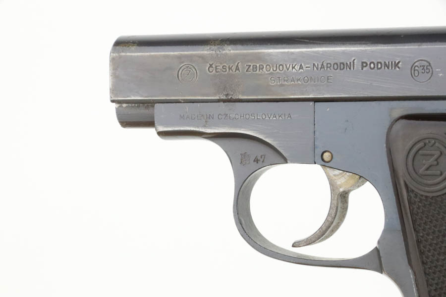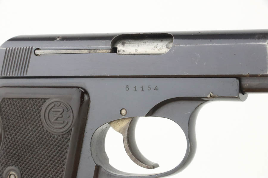8/15/24 – This is a nice example of a Czech CZ 45 manufactured in 1947 and chambered in 6.35mm or .25 ACP. It is all matching and has the proper Czech Lion proofs. Dated 1947 on the left side of the trigger guard. It has retained about 94-95% of its original finish. There is general high edge wear, an area of minor discoloration on the left side of the slide, and a few spots of pitting on the left side of the slide. Tiny chip in the metal at the right front of the frame. Fitted with a very nice period-correct bakelite grip and comes with one proper magazine. Minty bore.