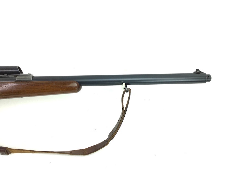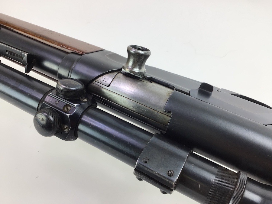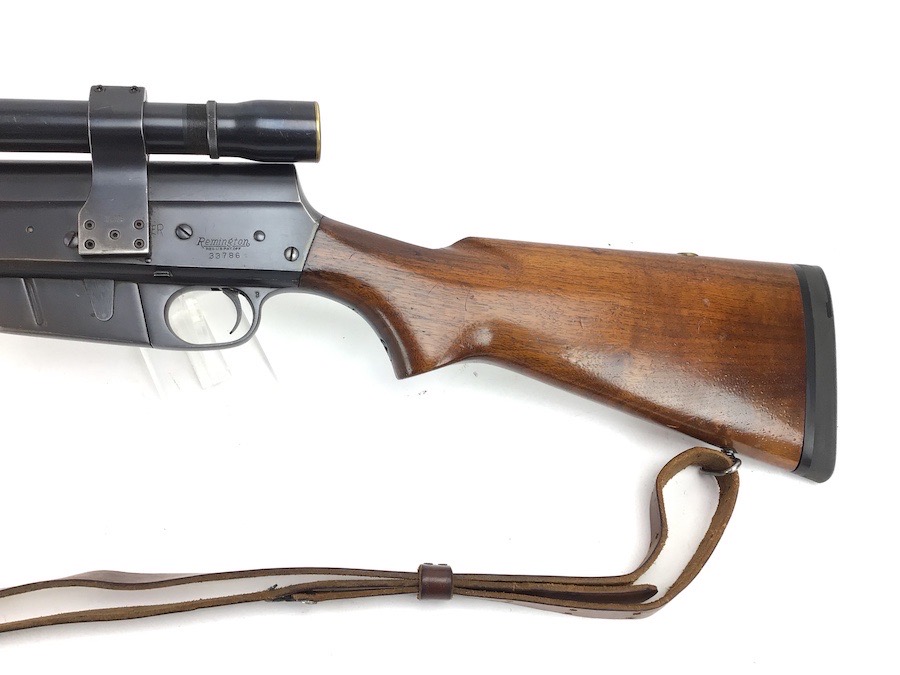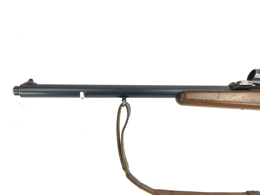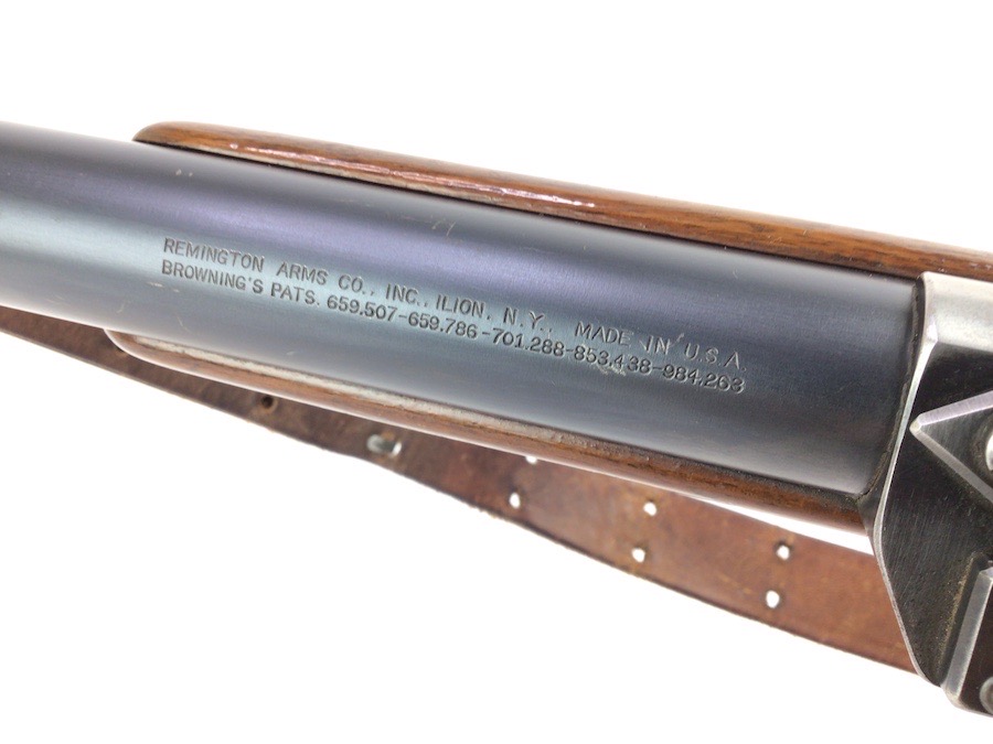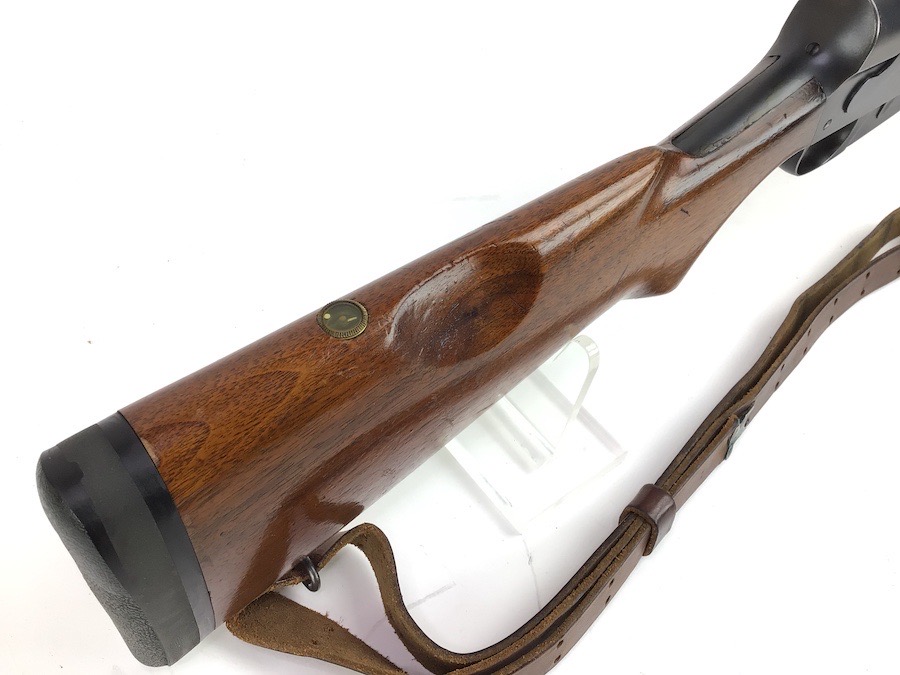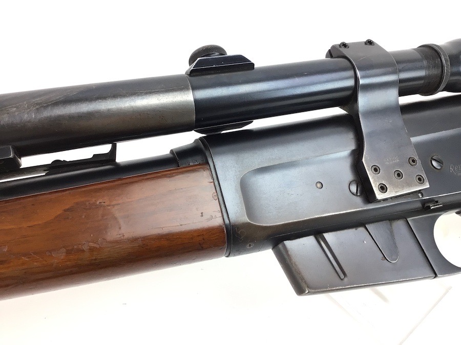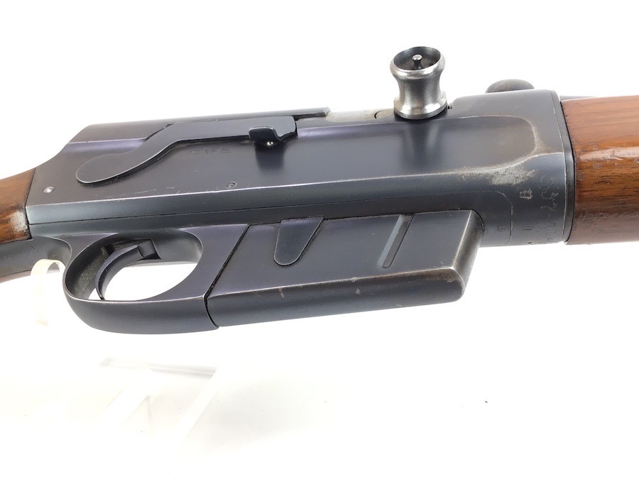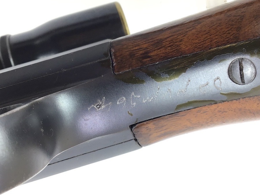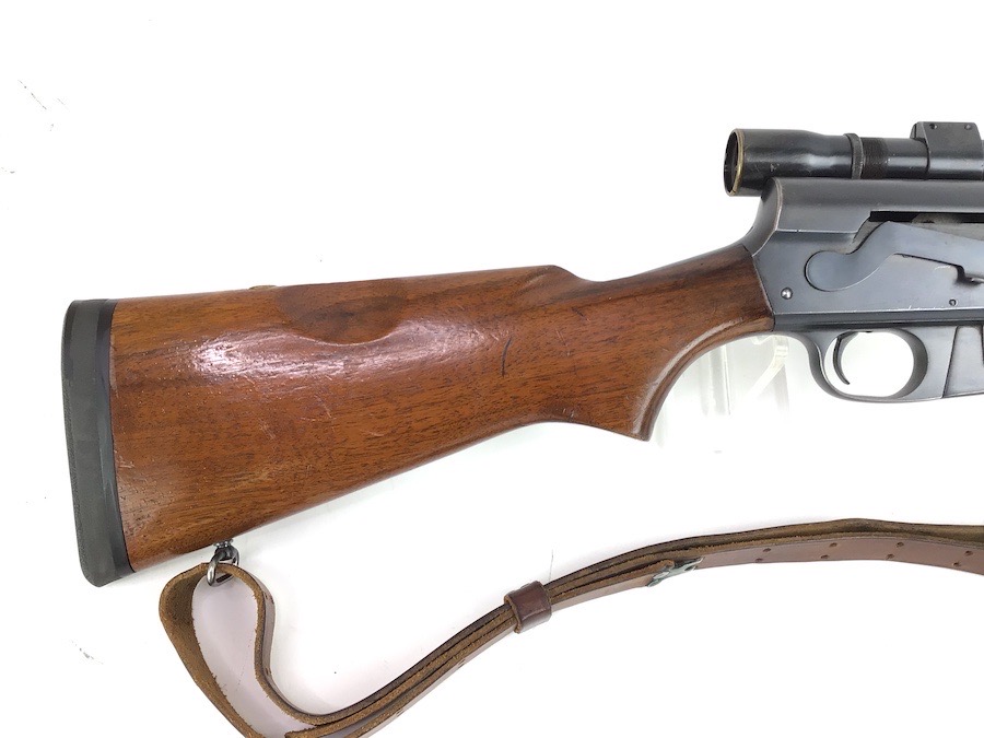 8/13/24 – This is an excellent example of a Remington Woodsmaster Model 81 semi auto rifle, chambered in .300 Savage. From the “KSS” date code on the barrel, it was manufactured in May of 1947. Overall, the gun is excellent. The metal parts have retained a majority of original bluing with minor wear around the high edges. There is some unknown pencil etching around the trigger guard and under the breech. The wood furniture is in great shape and appears to have been re-coated sometime in the past. Bore is clean with good rifling and rates a strong 8 of 10. Includes a Lyman scope with clear optics, and an unmarked leather sling. Smooth action and fully functional.