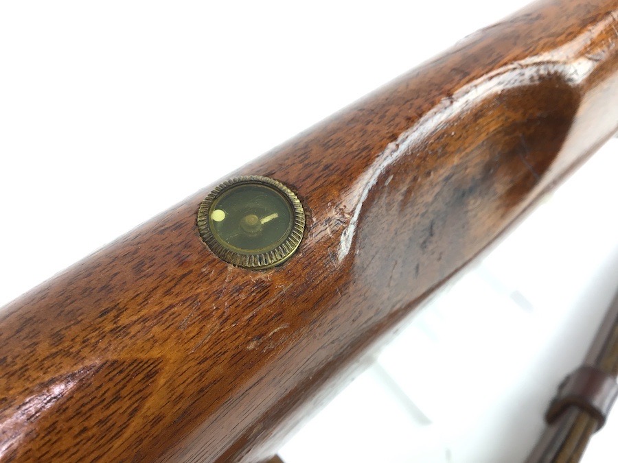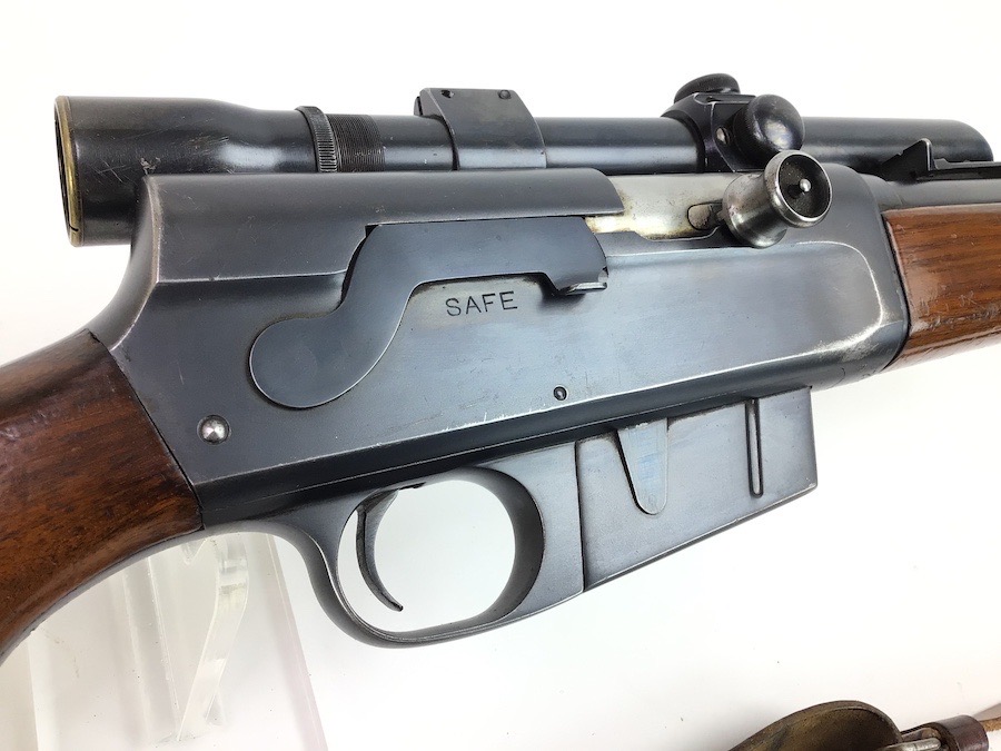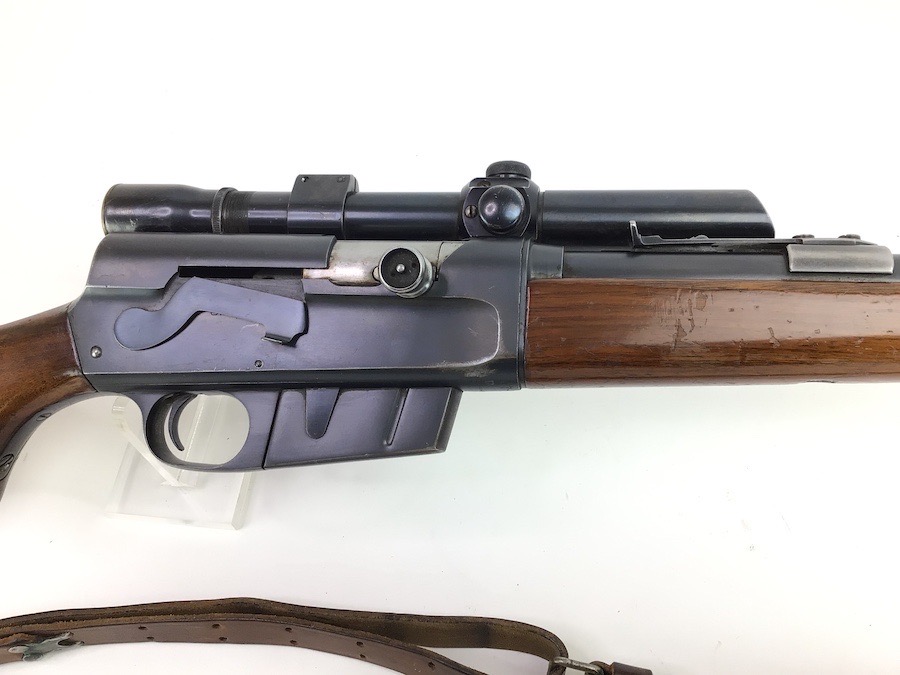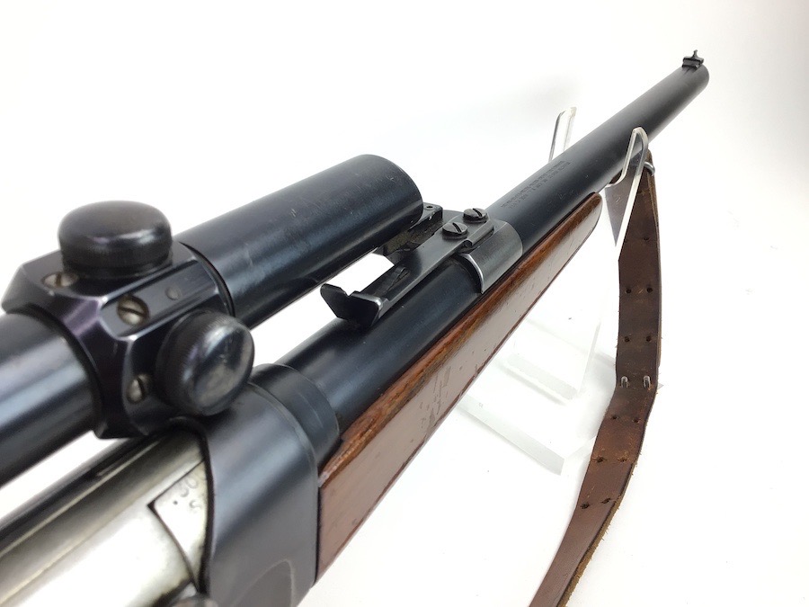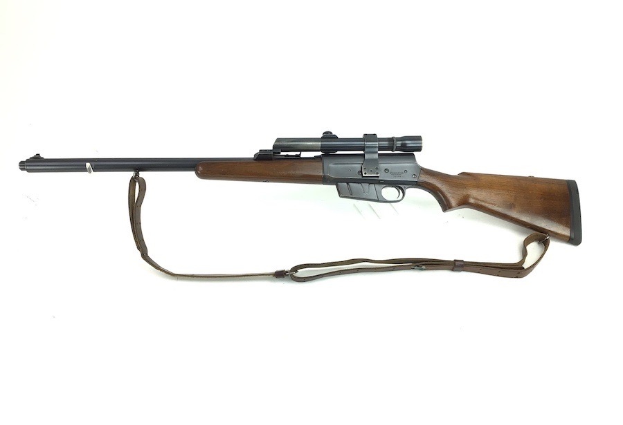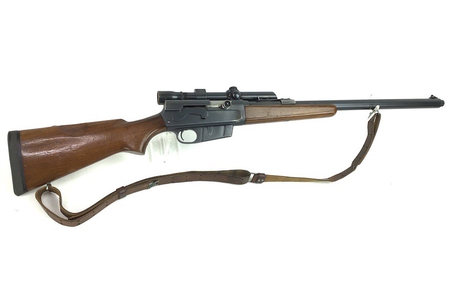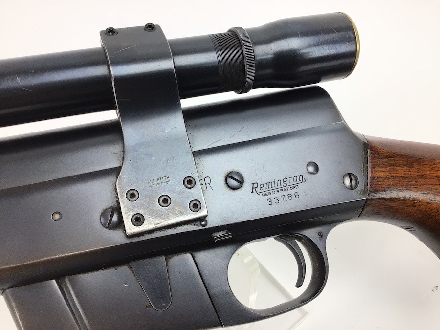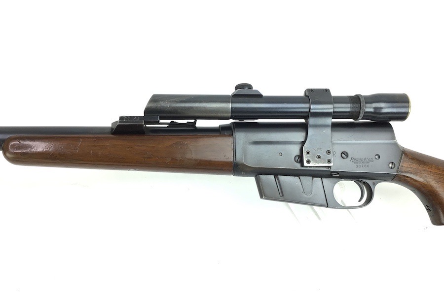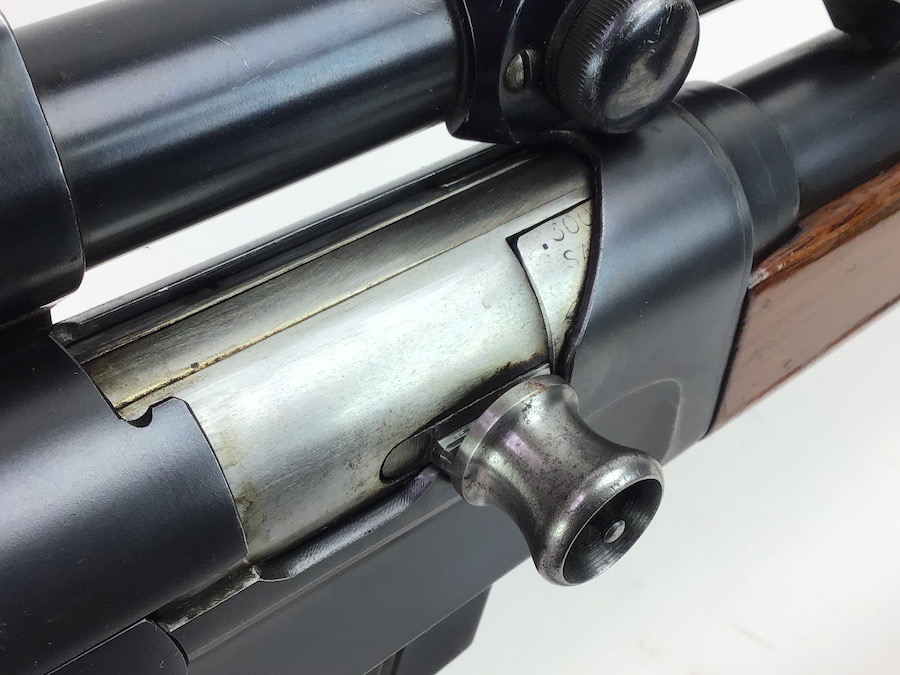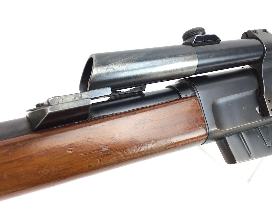 8/13/24 – This is an excellent example of a Remington Woodsmaster Model 81 semi auto rifle, chambered in .300 Savage. From the “KSS” date code on the barrel, it was manufactured in May of 1947. Overall, the gun is excellent. The metal parts have retained a majority of original bluing with minor wear around the high edges. There is some unknown pencil etching around the trigger guard and under the breech. The wood furniture is in great shape and appears to have been re-coated sometime in the past. Bore is clean with good rifling and rates a strong 8 of 10. Includes a Lyman scope with clear optics, and an unmarked leather sling. Smooth action and fully functional.