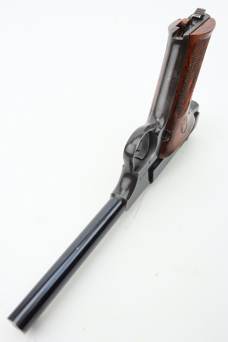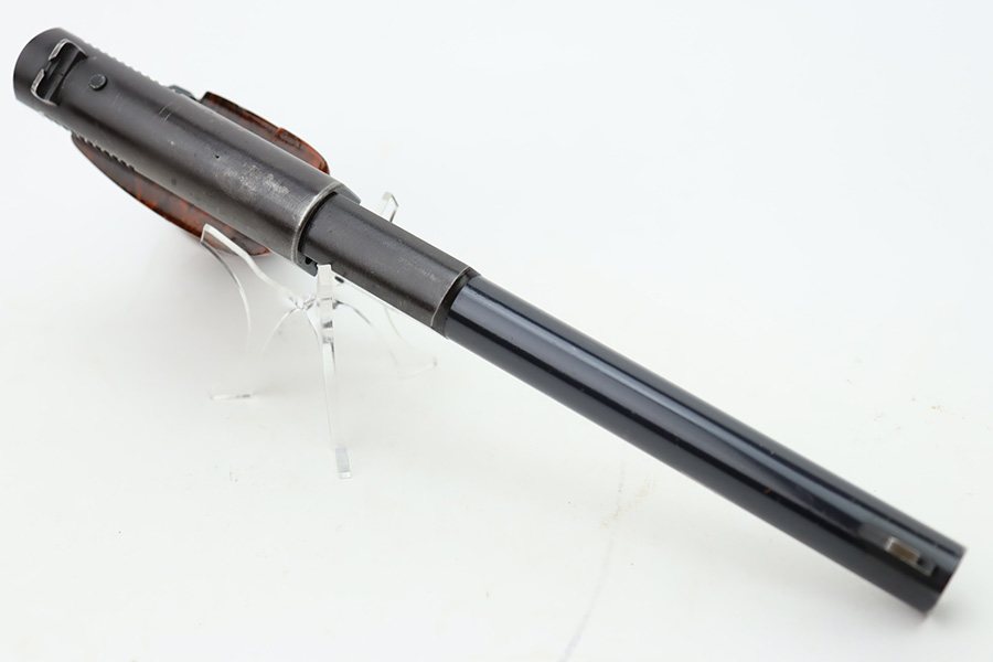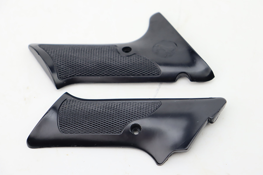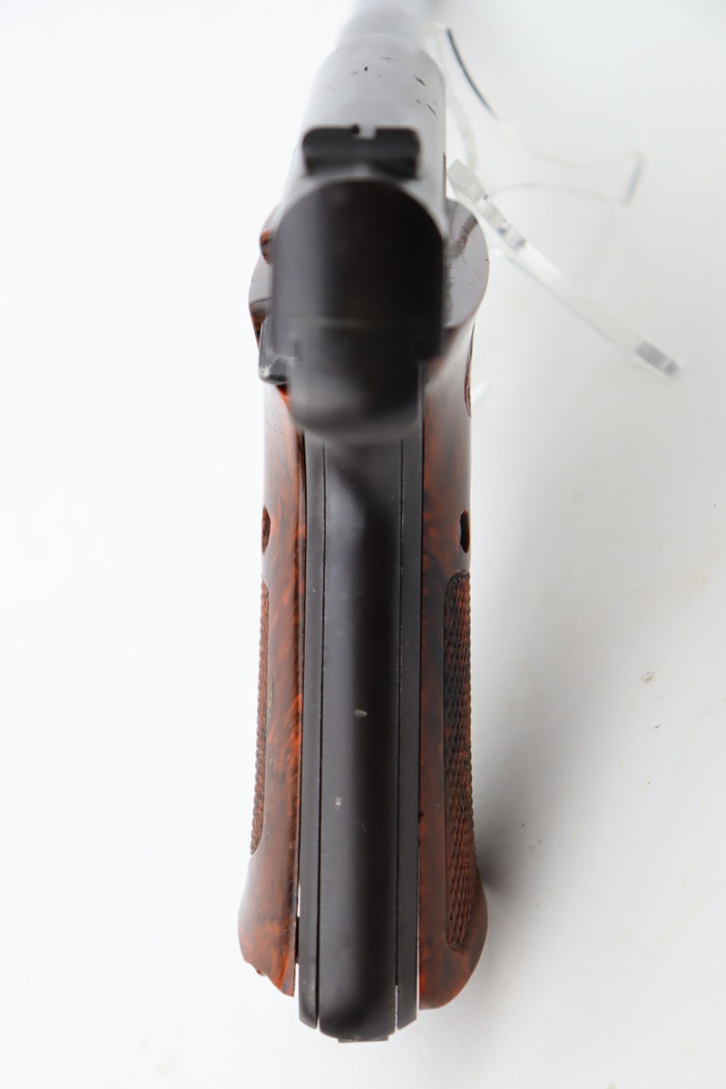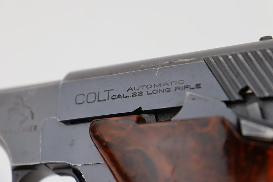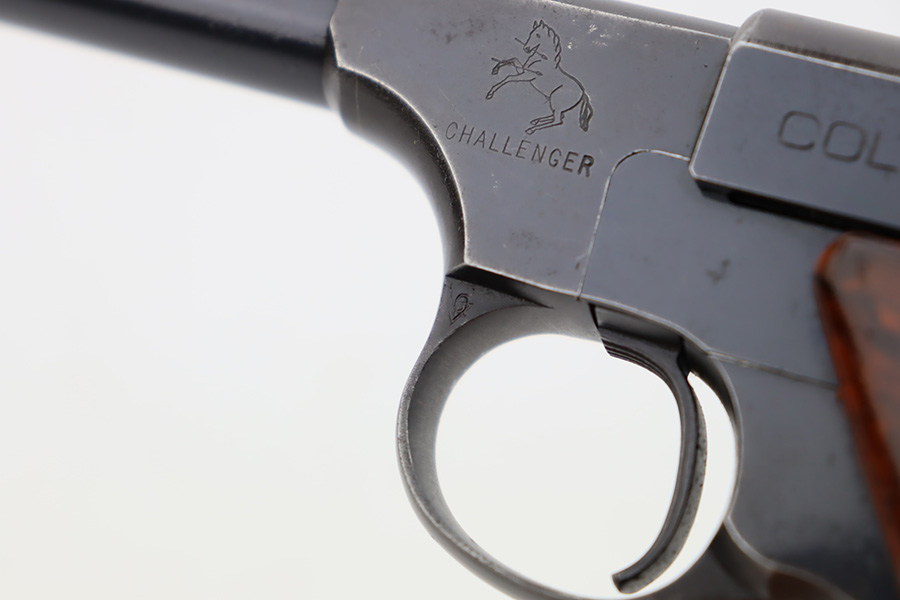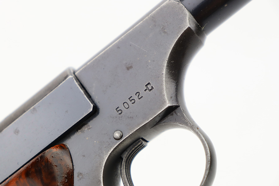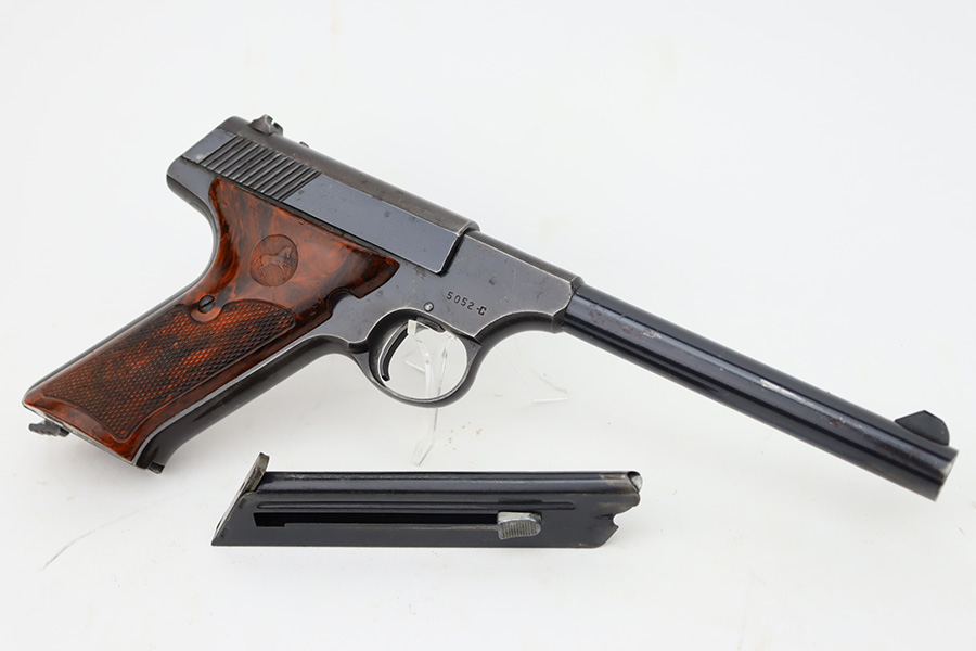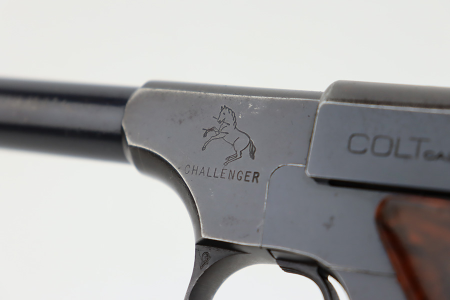 10/12/23 – This is a Colt Challenger, manufactured in 1950 and chambered in .22 LR. It has retained roughly 85% of its original finish with areas of wear along the barrel, on the grip straps, and on the top of the slide. Some areas of light spotty oxidation here and there. Fitted with marbled brown bakelite grips and comes with a set of spare black plastic grips. Comes with one proper magazine. Mint bore.