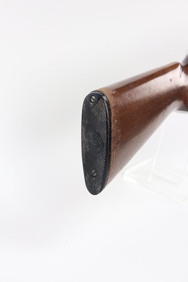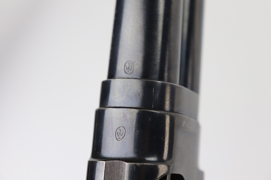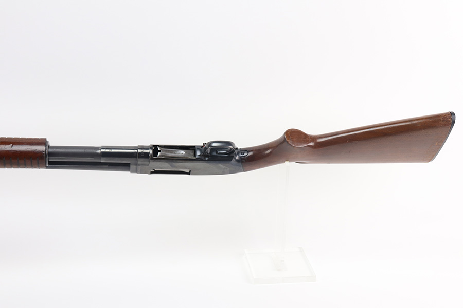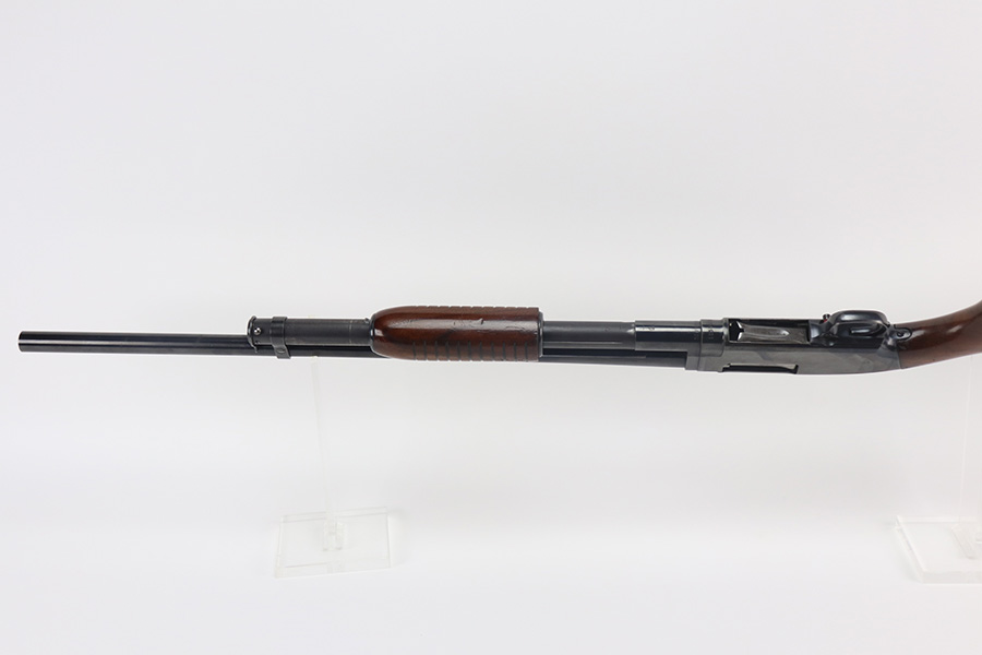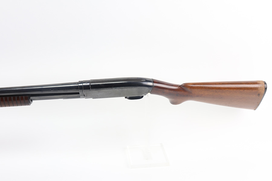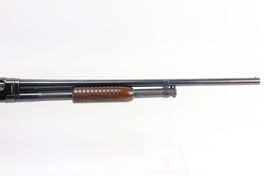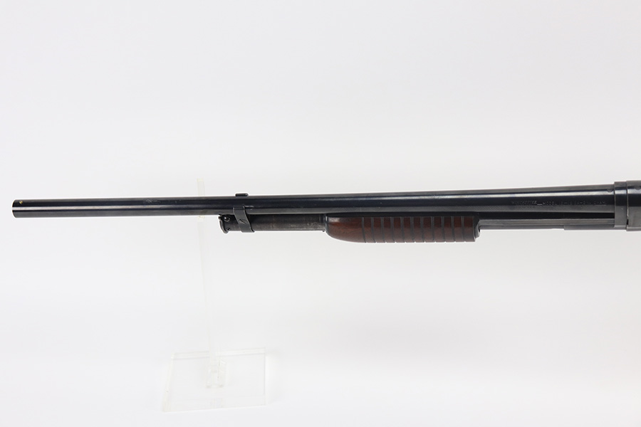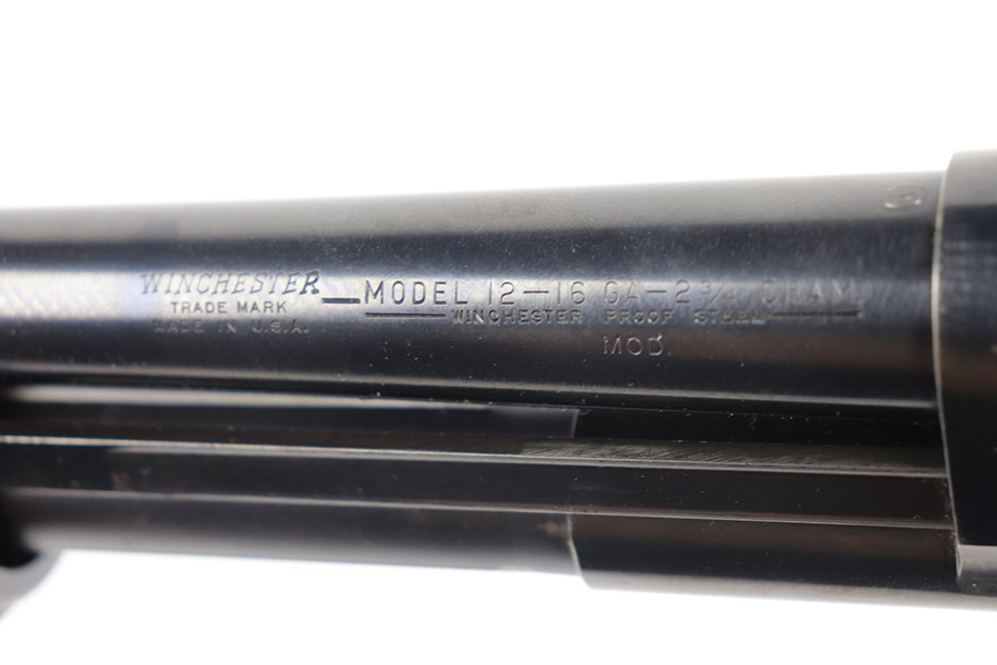 8/12/21 – This is a nice example of a Winchester Model 12 chambered in 16 GA. Made in 1950. 23.75″ barrel, 13.25″ LOP, modified choke. The gun has retained most of its finish with minor scratches and handling marks along the barrel. There is minor wear around the high edges and more noticeable scratching on the receiver. Very nice stock. Minor dings and marks here and there. There is some finish missing where it looks like someone had tape adjacent to the butt plate. The bore is shiny and would be mint, but there is a very small dent in the barrel visible in the bore.