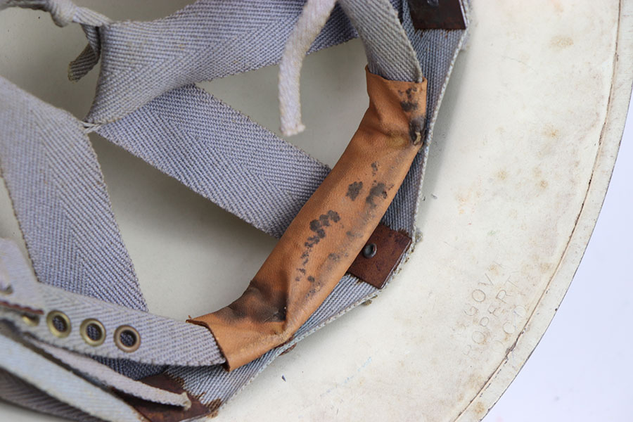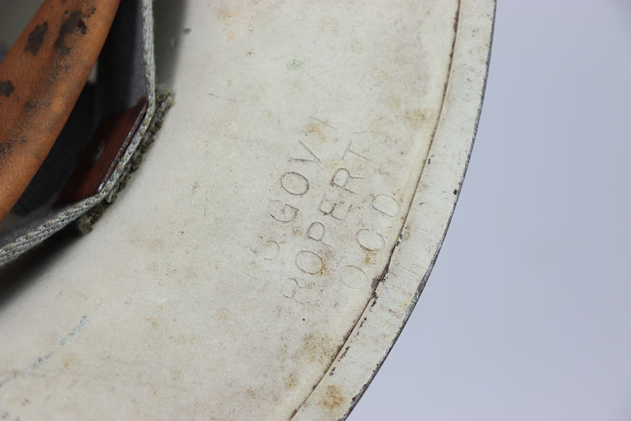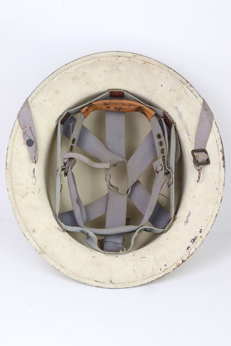5/26/24 – This is an original US Civil Defense helmet. These were issued to “town leaders” or volunteers who helped prepare citizens for any invasion or attack in the 1950s and 1960s. The helmet is in great condition with very nice paint throughout and a crisp front logo. There is some honest wear on the edges and discoloration from being a white helmet. The interior canvas liner is still in tact as well. There’s some mild wear and signs of aging throughout. A nice example of US history.