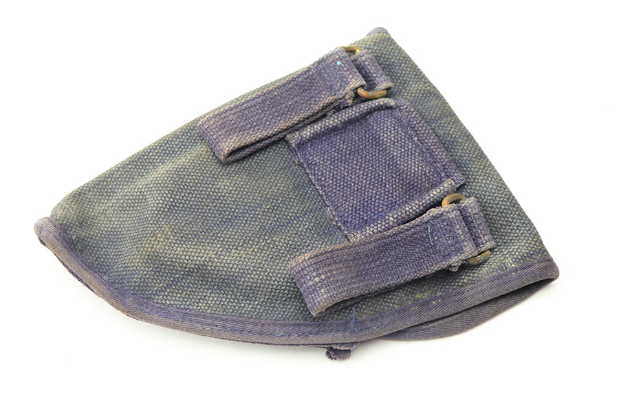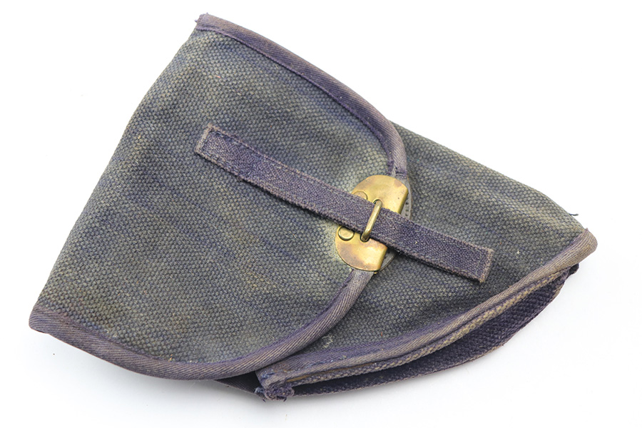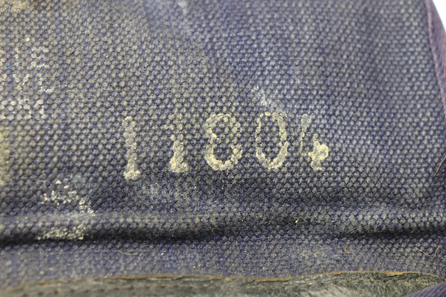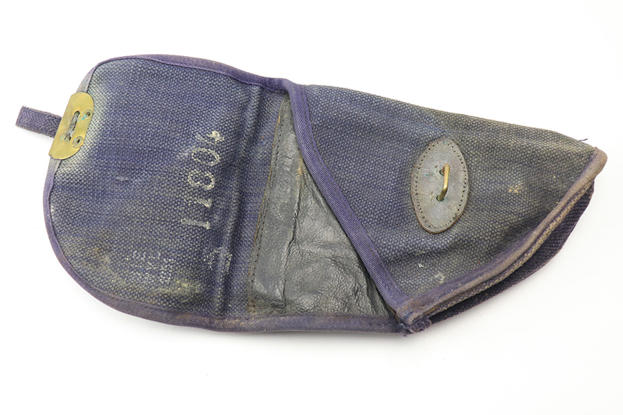 1/19/22 – This is a 1950s production High Power holster. The holster is purple colored canvas, and is likely Belgian or Canadian manufacture. The interior is numbered and maker stamped with what appears to be a 1951 date. The holster shows signs of use and aging throughout but is in tact and without any major or structural flaws. Excellent stitching is in tact.