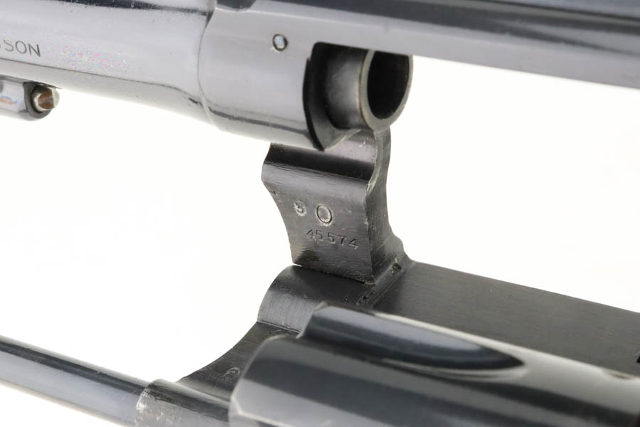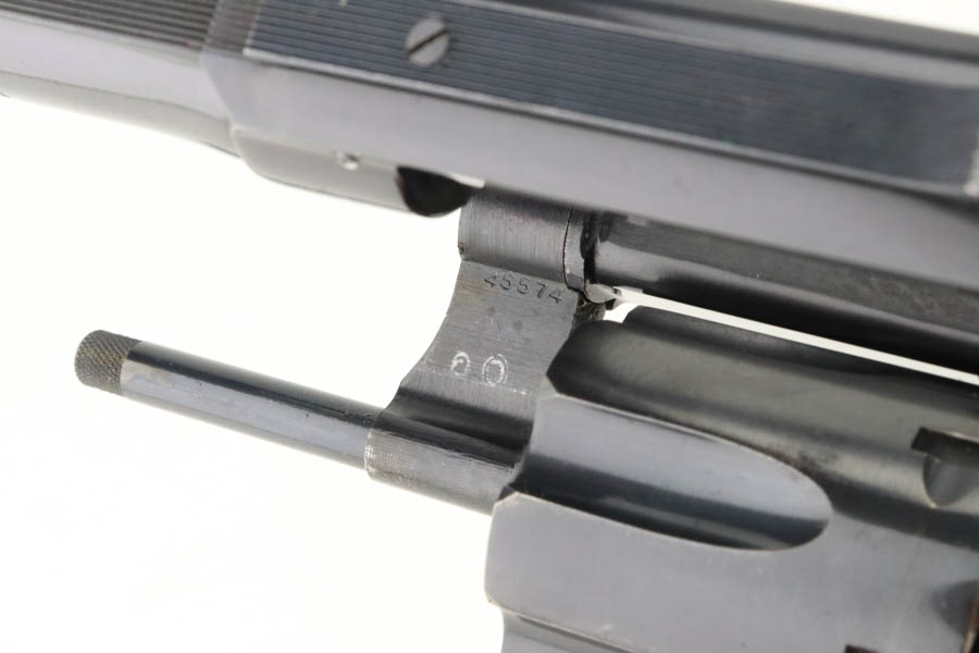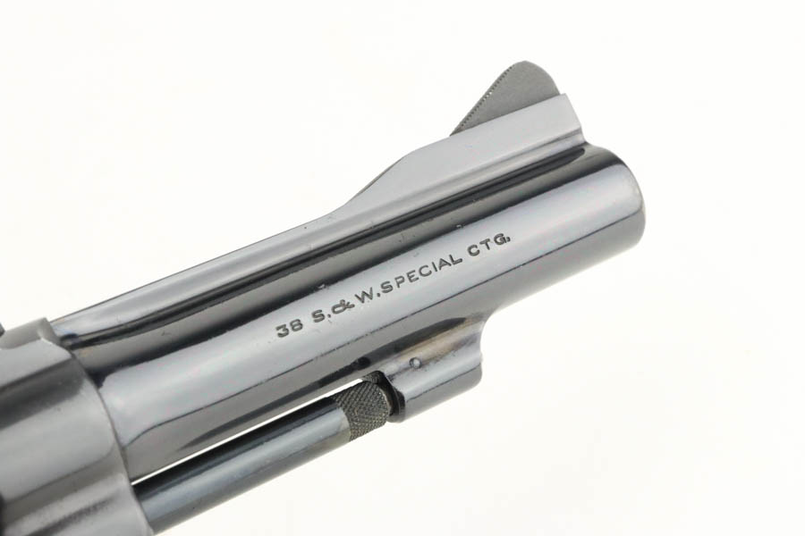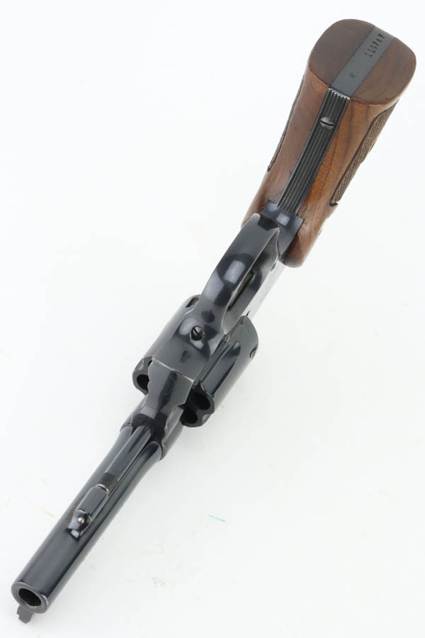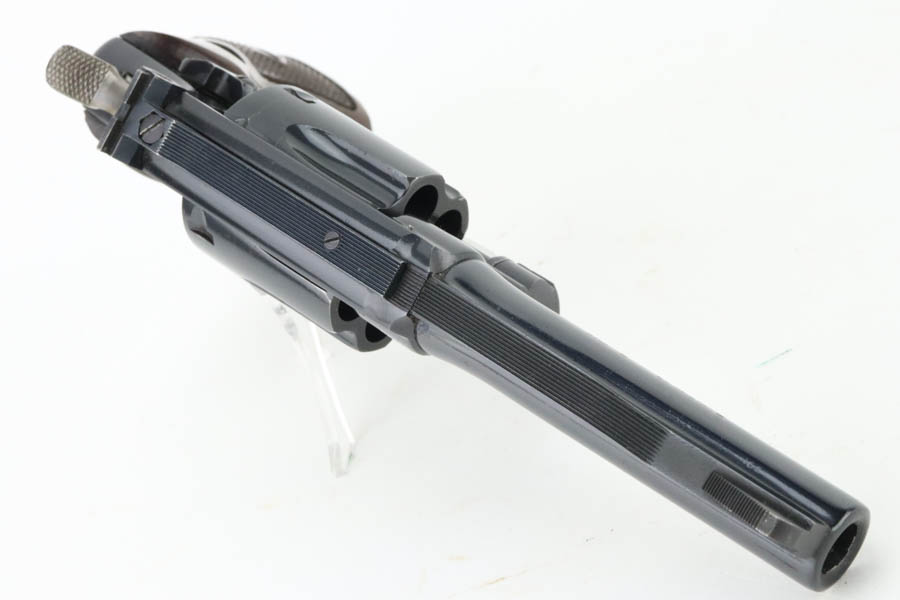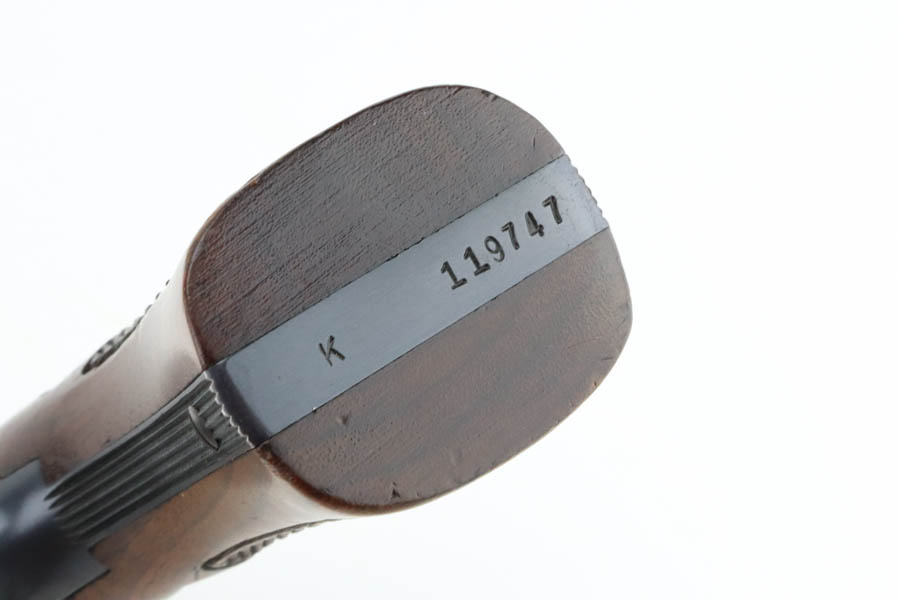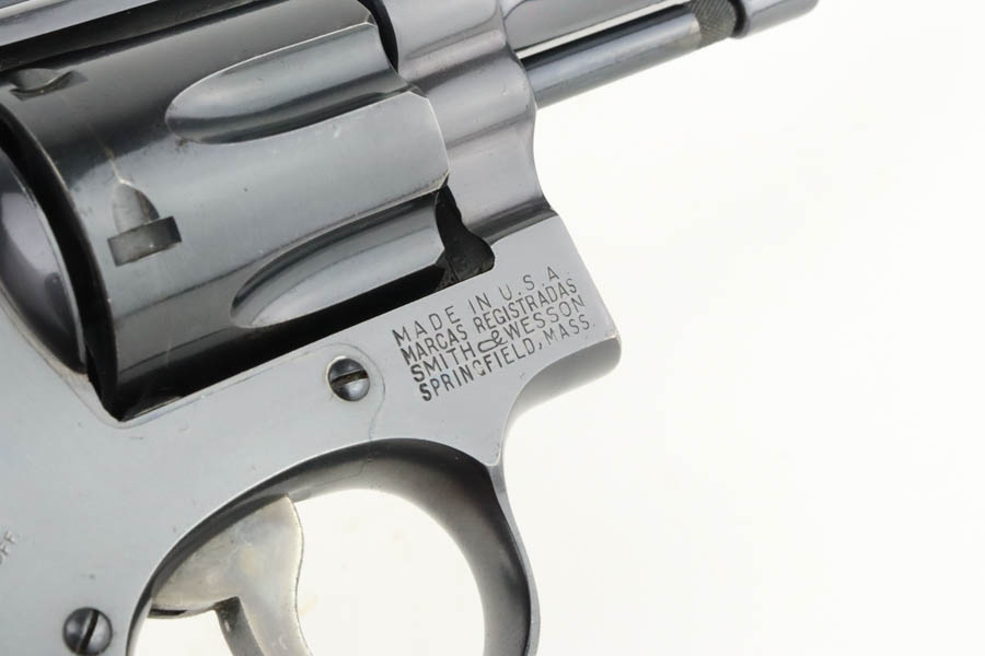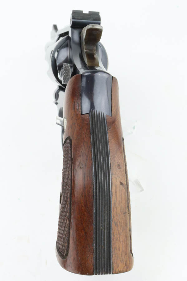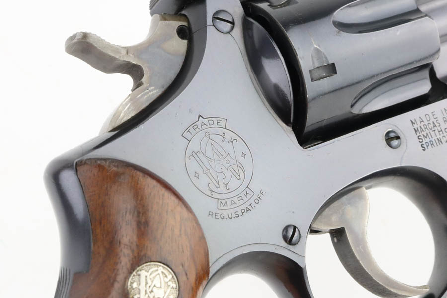 6/6/24 – This is a minty example of a Smith & Wesson K-38 revolver, manufactured in 1951 and chambered in .38 Special. It has retained about 98% of its original high polish bluing with a hint of wear around the muzzle and a light roll mark on the cylinder. Excellent case-hardening on the hammer and trigger. Fitted with nice hand-checkered Walnut grips. Mint bore. Smooth action.