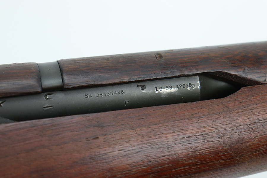 8/4/23 – This is an excellent example of a Springfield M1 Garand. The serial number on the receiver dates to 1952. Springfield-marked barrel dated October of 1953. There are DOD proof marks on the barrel and on the left side of the stock. The metal parts have retained nearly all of their finish with very minor scuffing on the floor plate and one small dot of discoloration on the breech bolt. Very nice wood stock with only minor bruises and scratches. More noticeable dings on the upper handguard. Mint bore. Muzzle reading: 2. Throat reading: 3.