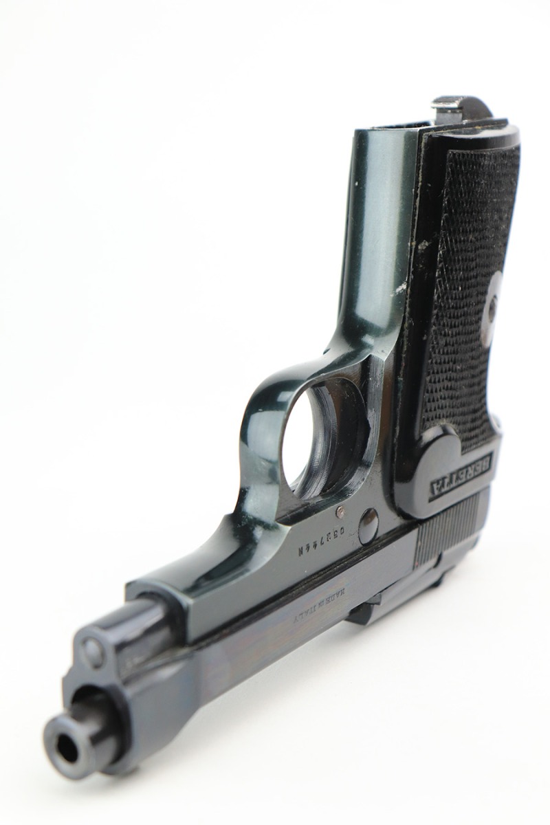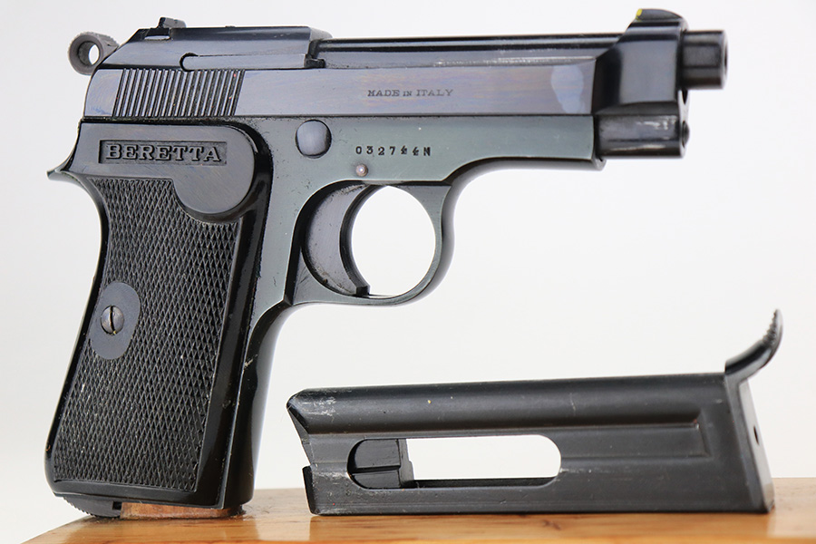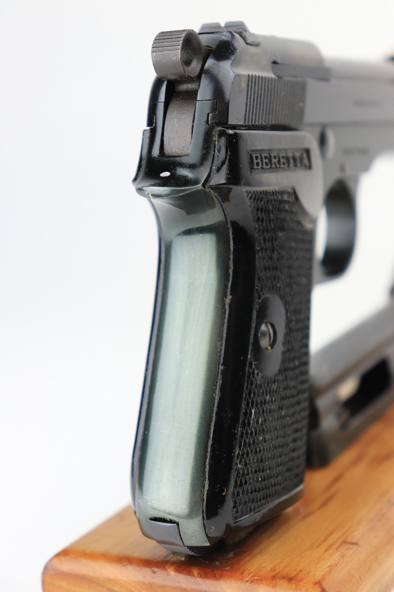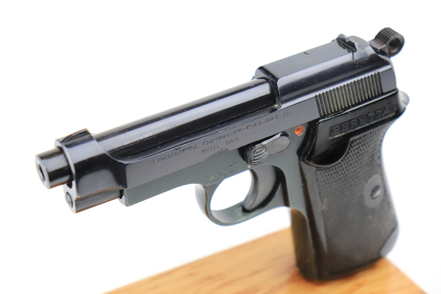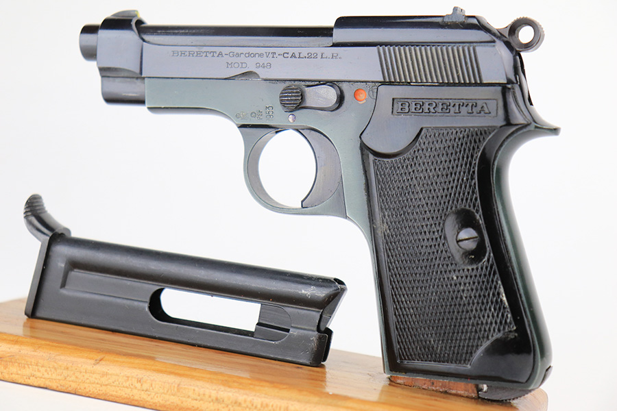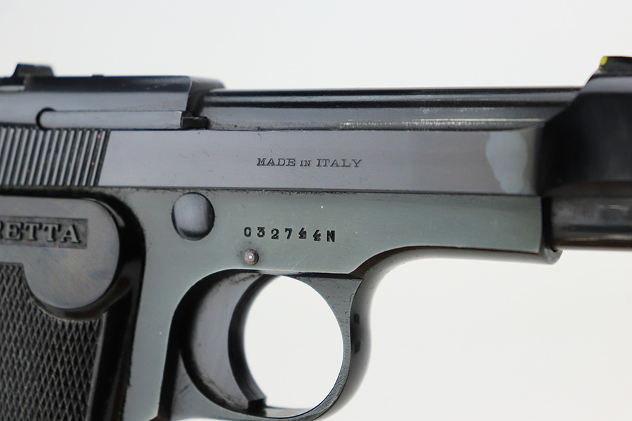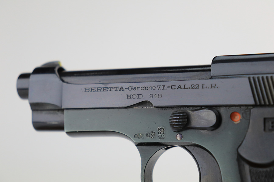 5/26/22 – This is an excellent example of a Beretta Model 948 pistol manufactured in 1953 and chambered in .22 LR. It is all matching and has the proper Italian proofs throughout. It has retained about 95% of its original finish. The annodized finish on the frame is a little difficult to rate, but we believe there is some minor thinning, mainly on the grip straps. There are also a couple of tiny handling marks on the front strap. Comes with very nice black plastic grips and a proper magazine. Mint bore.