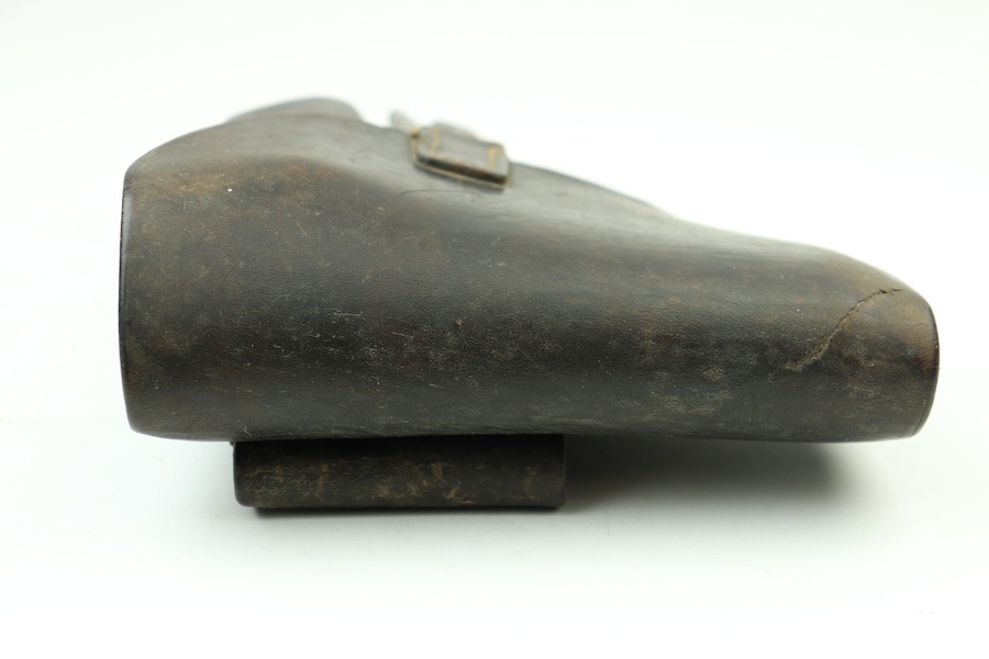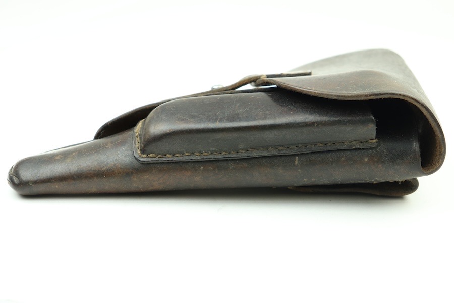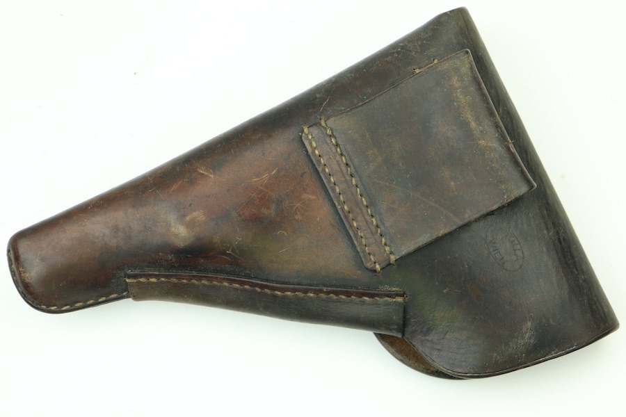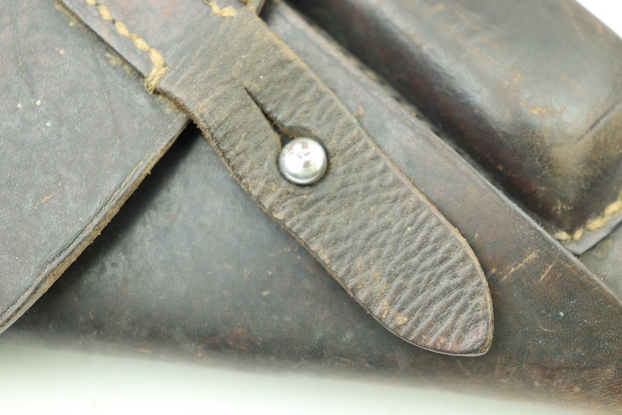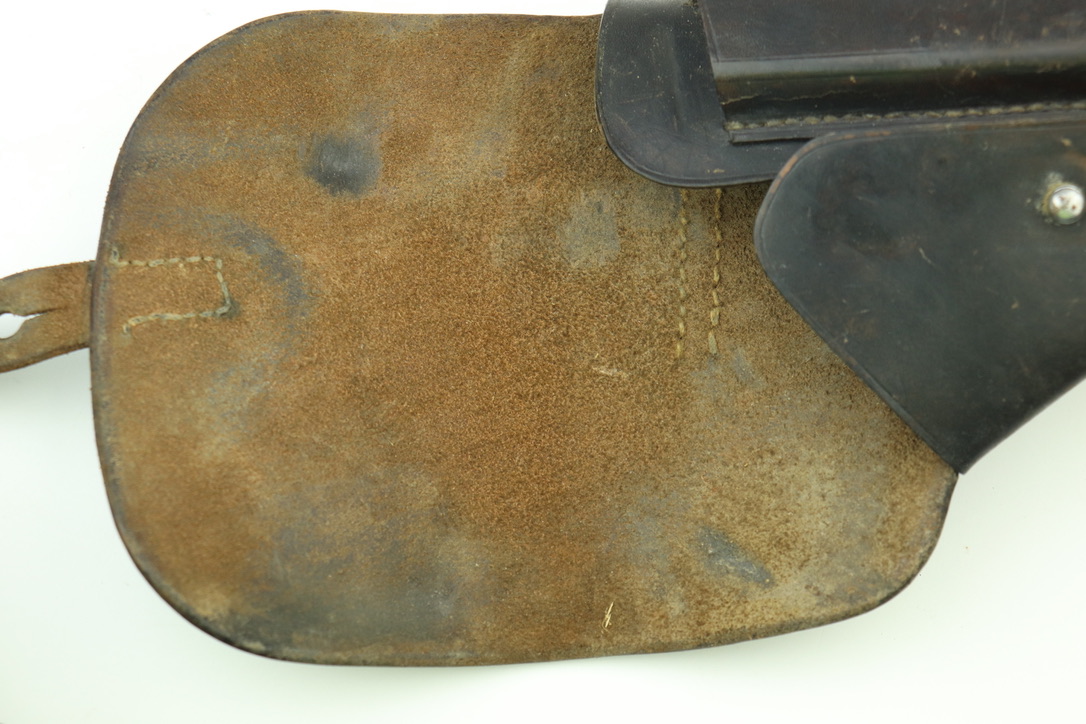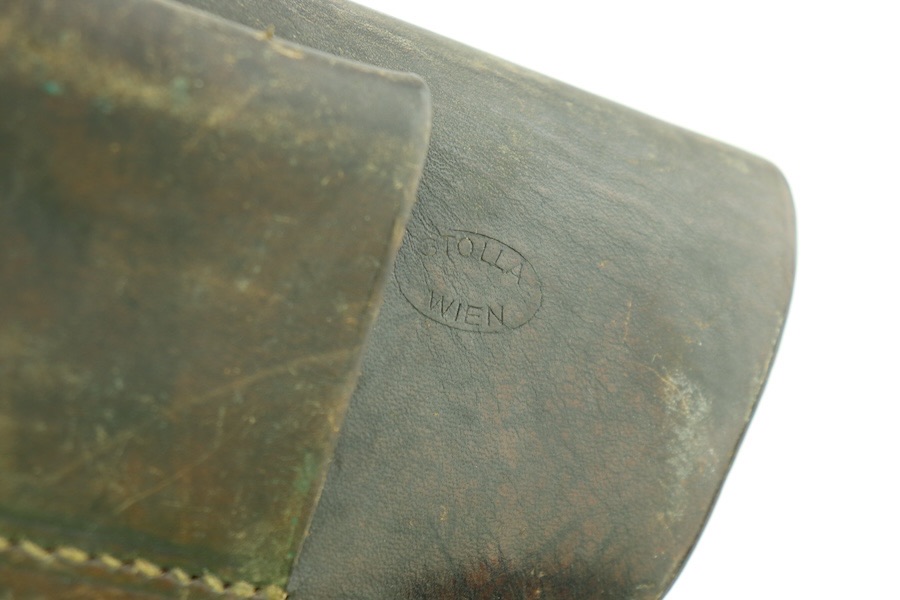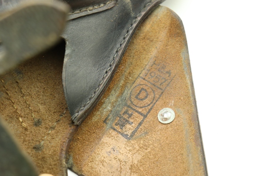 11/29/23 – This is a great and original condition. It is a post-war Walther P.38 holster. The front leather shows some light surface scratches and a few deeper scratches on the front closure hood. The stitching is very tight and all original except a few stitches under the belt loop. There is an ink stamp on the interior with a date of 1957, and on the back leather is a maker’s mark that reads Stolla Wien.