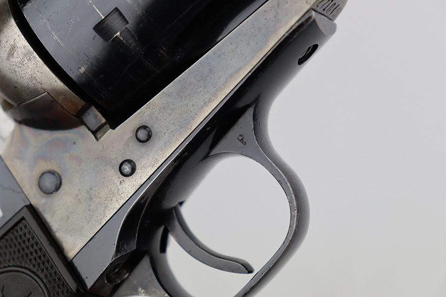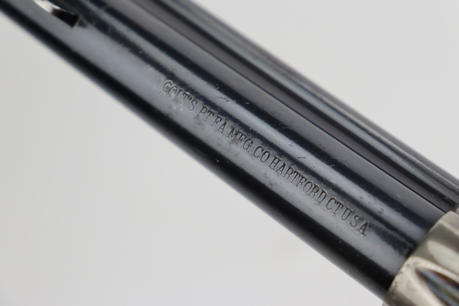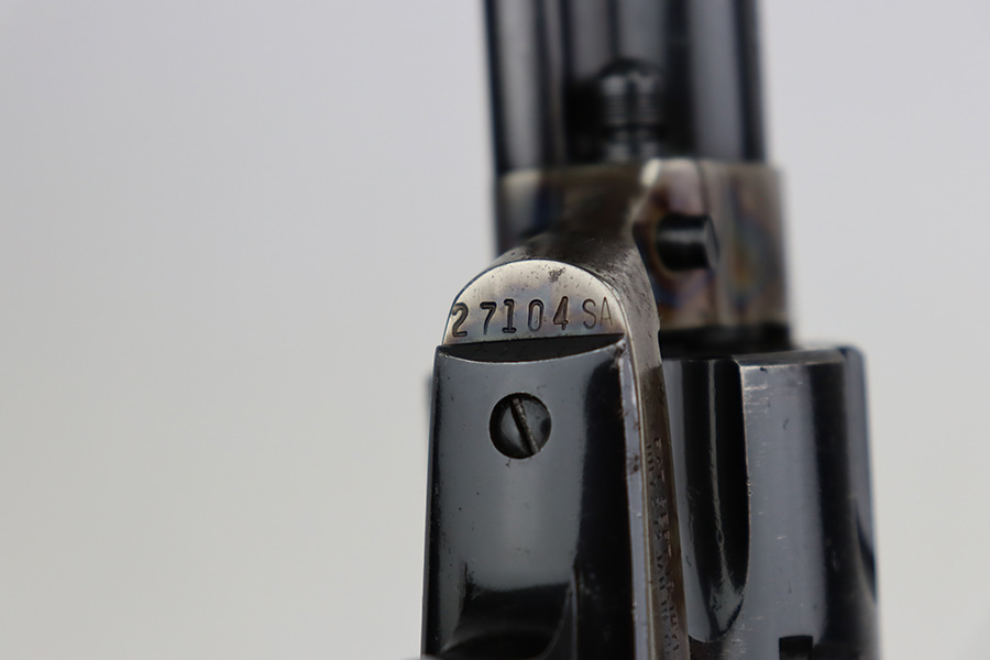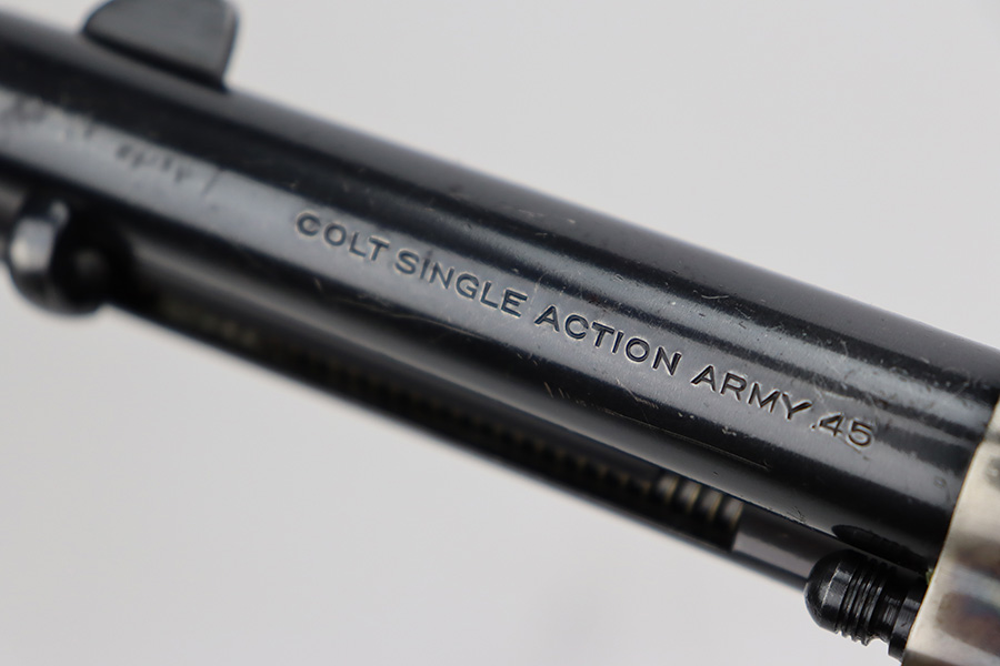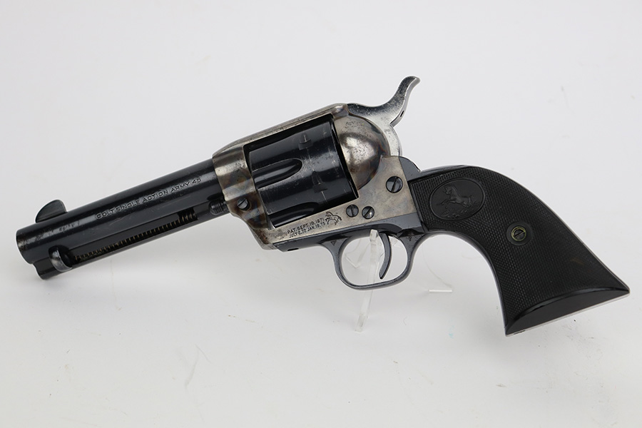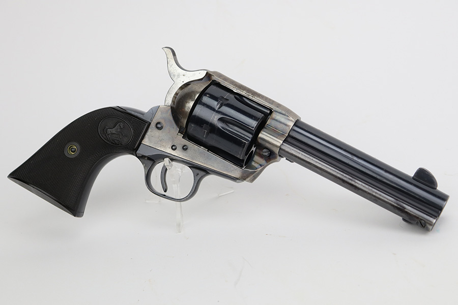 7/10/23 – This is an early 2nd generation Colt Single Action Army revolver, manufactured in 1959 and chambered in .45 Caliber. These are sometimes referred to as “black box” models, because they would’ve come in the earlier black cardboard box. This one also has a scarce 4 5/8″ barrel. It is matching and has retained roughly 85% of its original finish. There is scratchy wear on both grip straps with an area of minor pitting on the back strap. Light scratchy wear along the barrel and some thinning on the ejector tube. Some areas of minor thinning and freckling on both sides of the case-hardened receiver. Fitted with excellent black plastic grips. Mint bore.