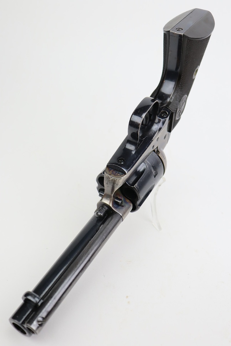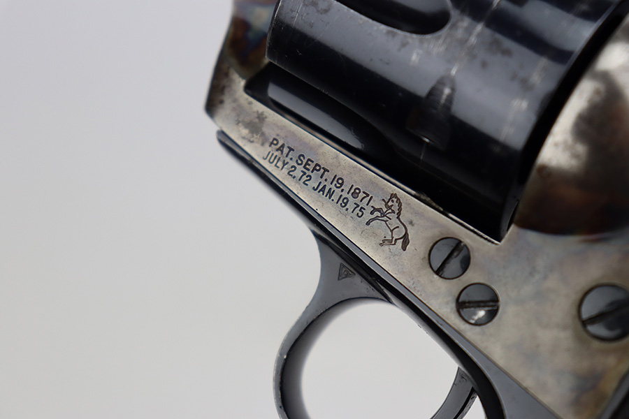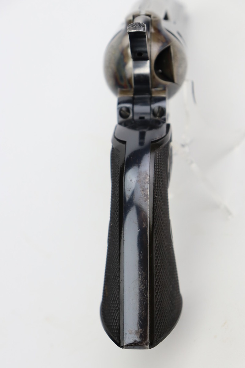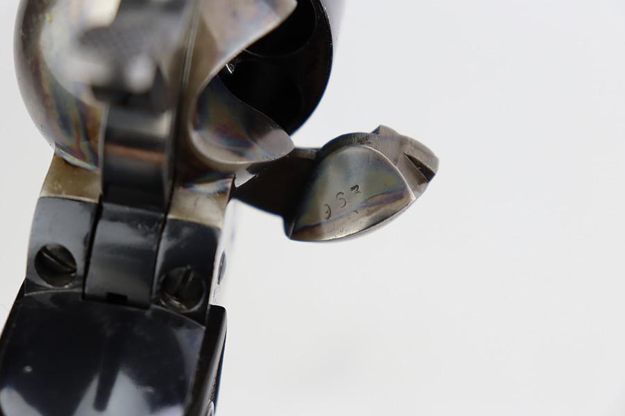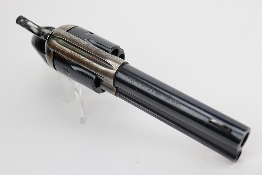7/10/23 – This is an early 2nd generation Colt Single Action Army revolver, manufactured in 1959 and chambered in .45 Caliber. These are sometimes referred to as “black box” models, because they would’ve come in the earlier black cardboard box. This one also has a scarce 4 5/8″ barrel. It is matching and has retained roughly 85% of its original finish. There is scratchy wear on both grip straps with an area of minor pitting on the back strap. Light scratchy wear along the barrel and some thinning on the ejector tube. Some areas of minor thinning and freckling on both sides of the case-hardened receiver. Fitted with excellent black plastic grips. Mint bore.