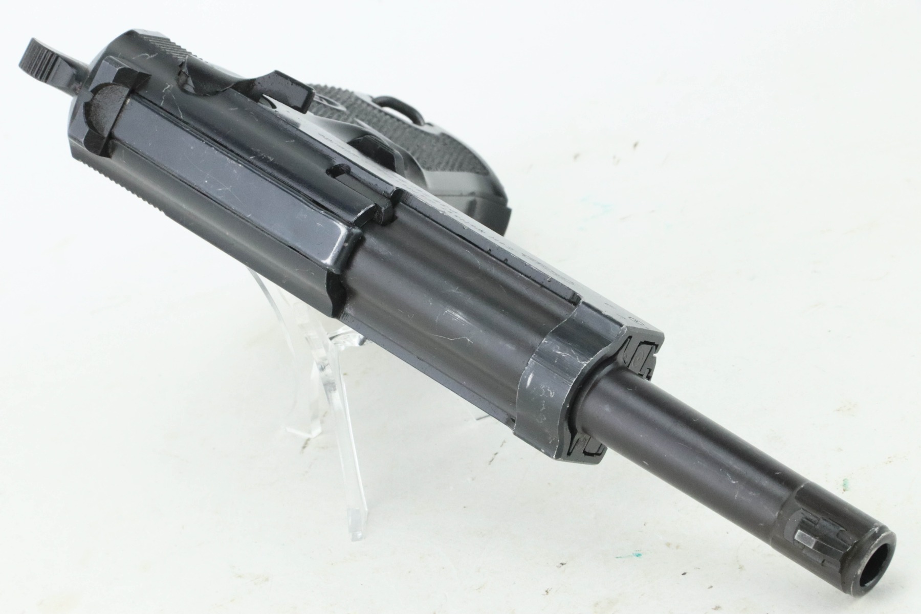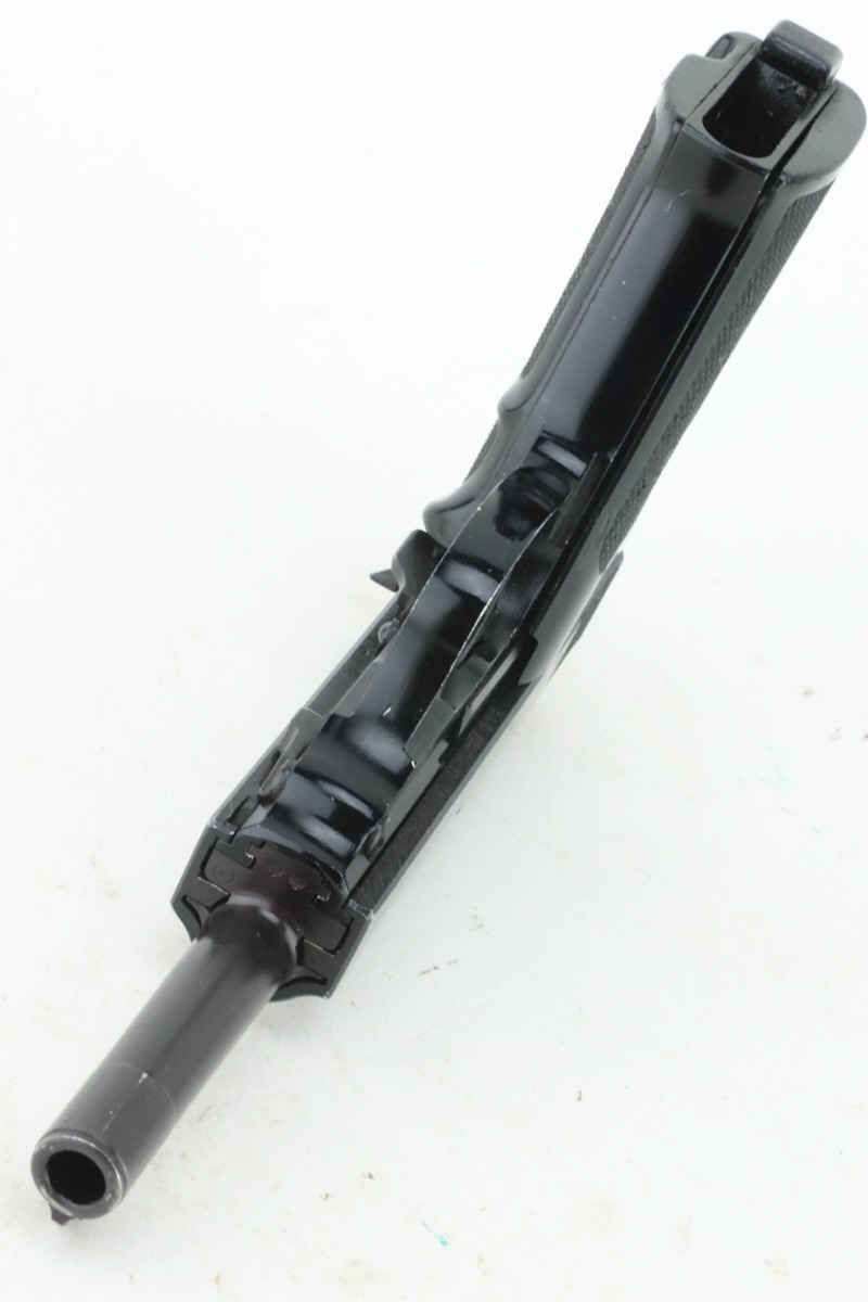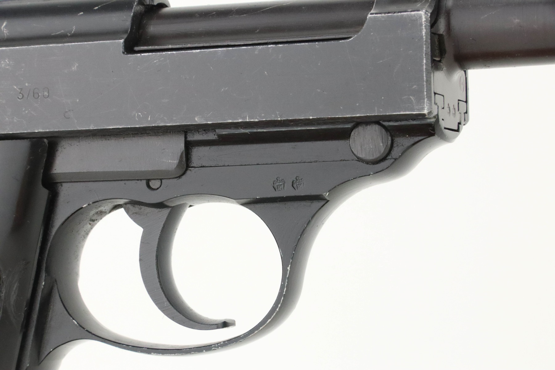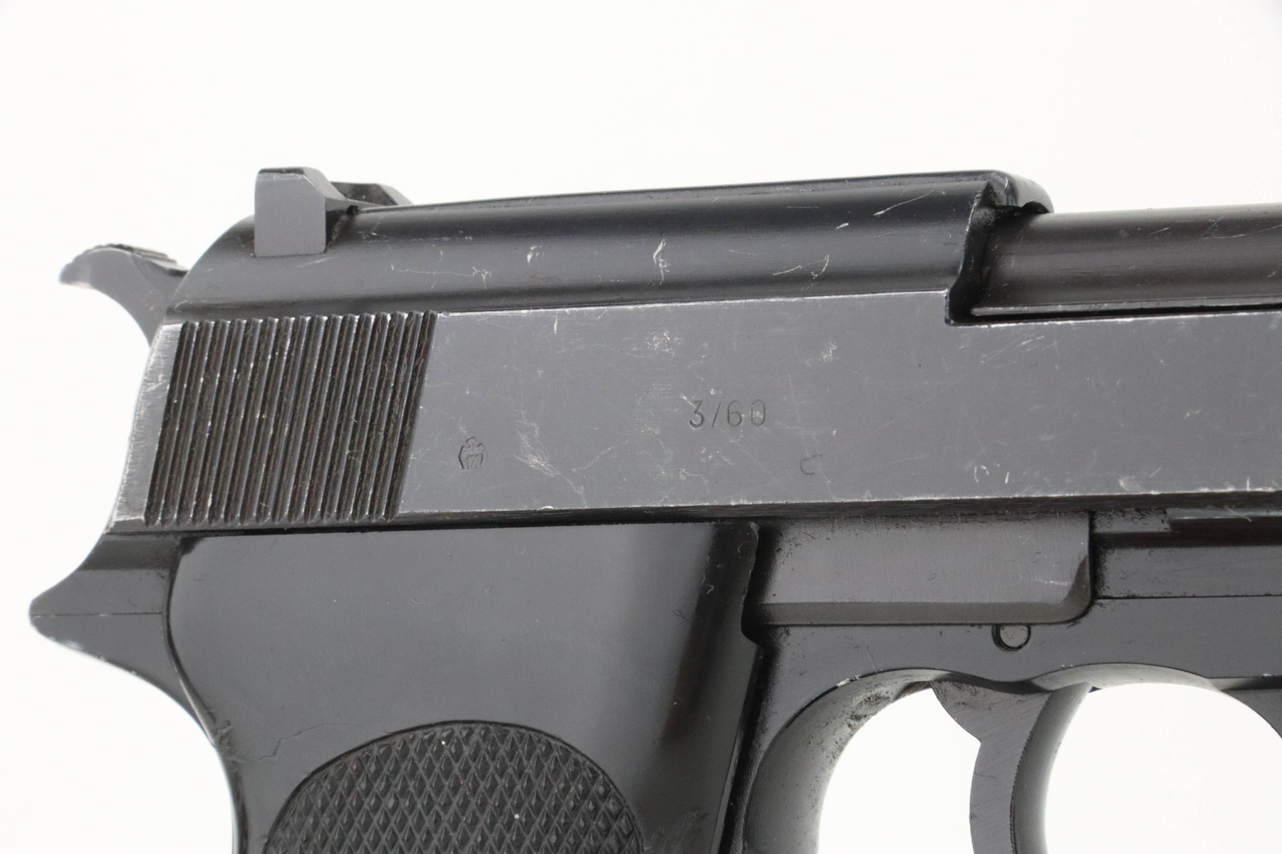 9/5/24 – This is an excellent example of a Walther P.38 from 1960. It is matching, but there is an import mark on the underside of the slide. There is very little actual finish loss, but there are light surface scratches and scuffs throughout. Fitted with black plastic grips and comes with one magazine. Mint bore. De-cocker is functional.