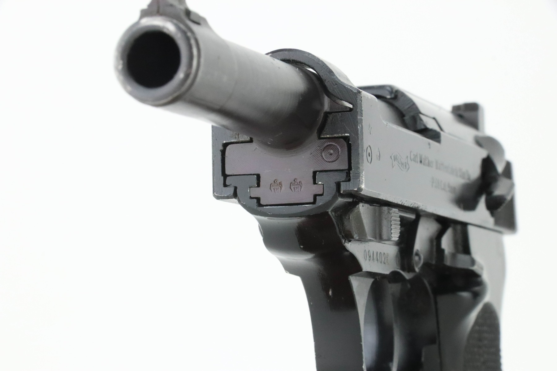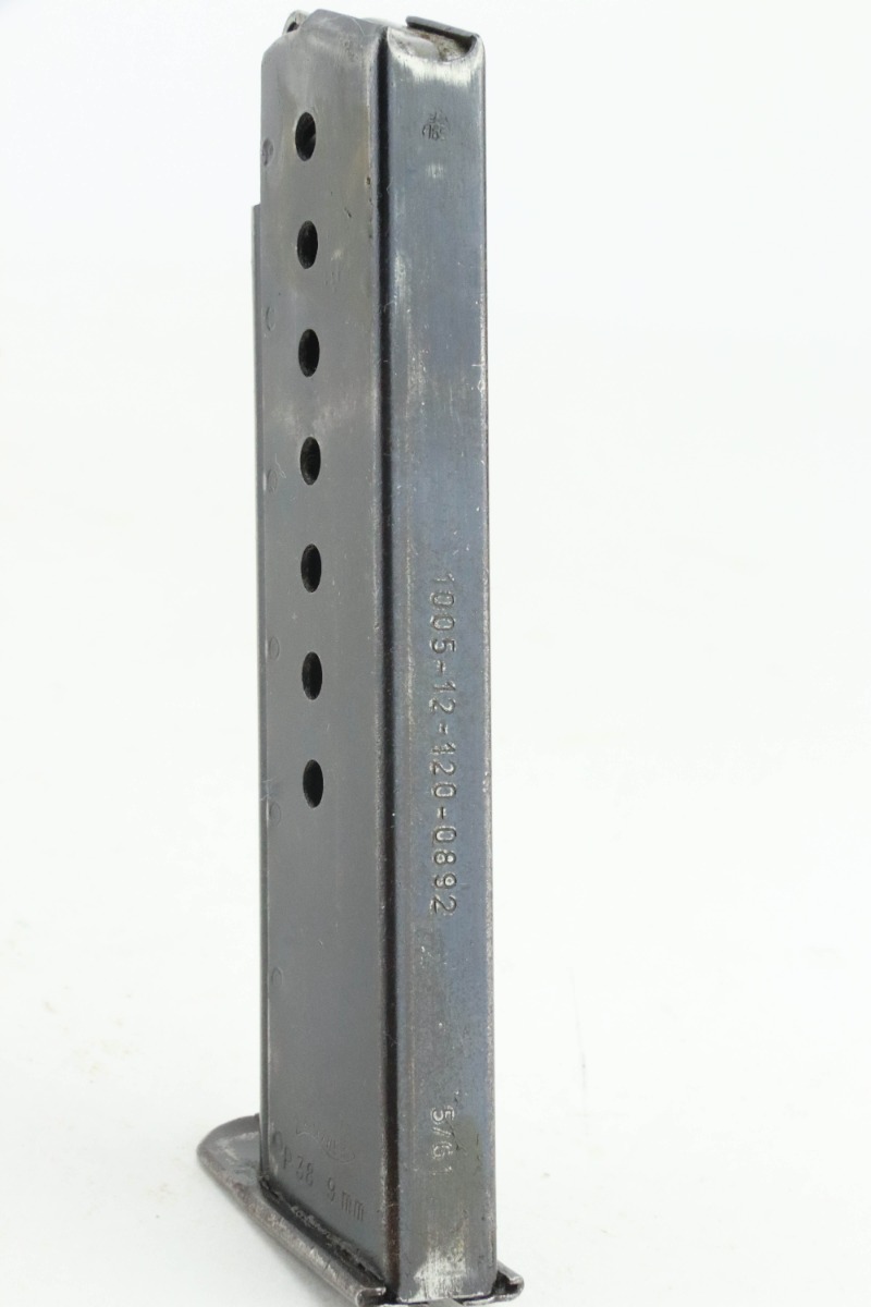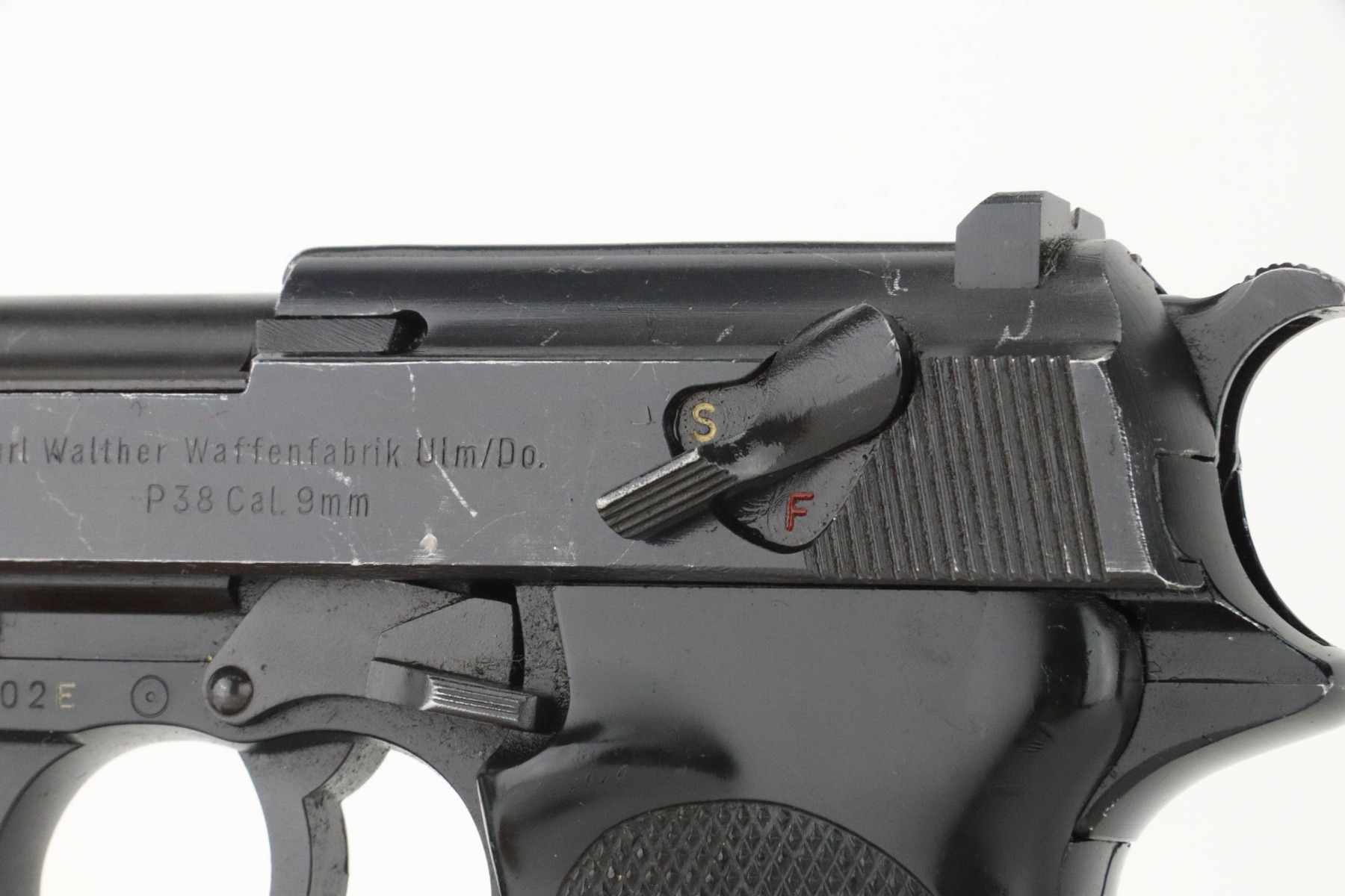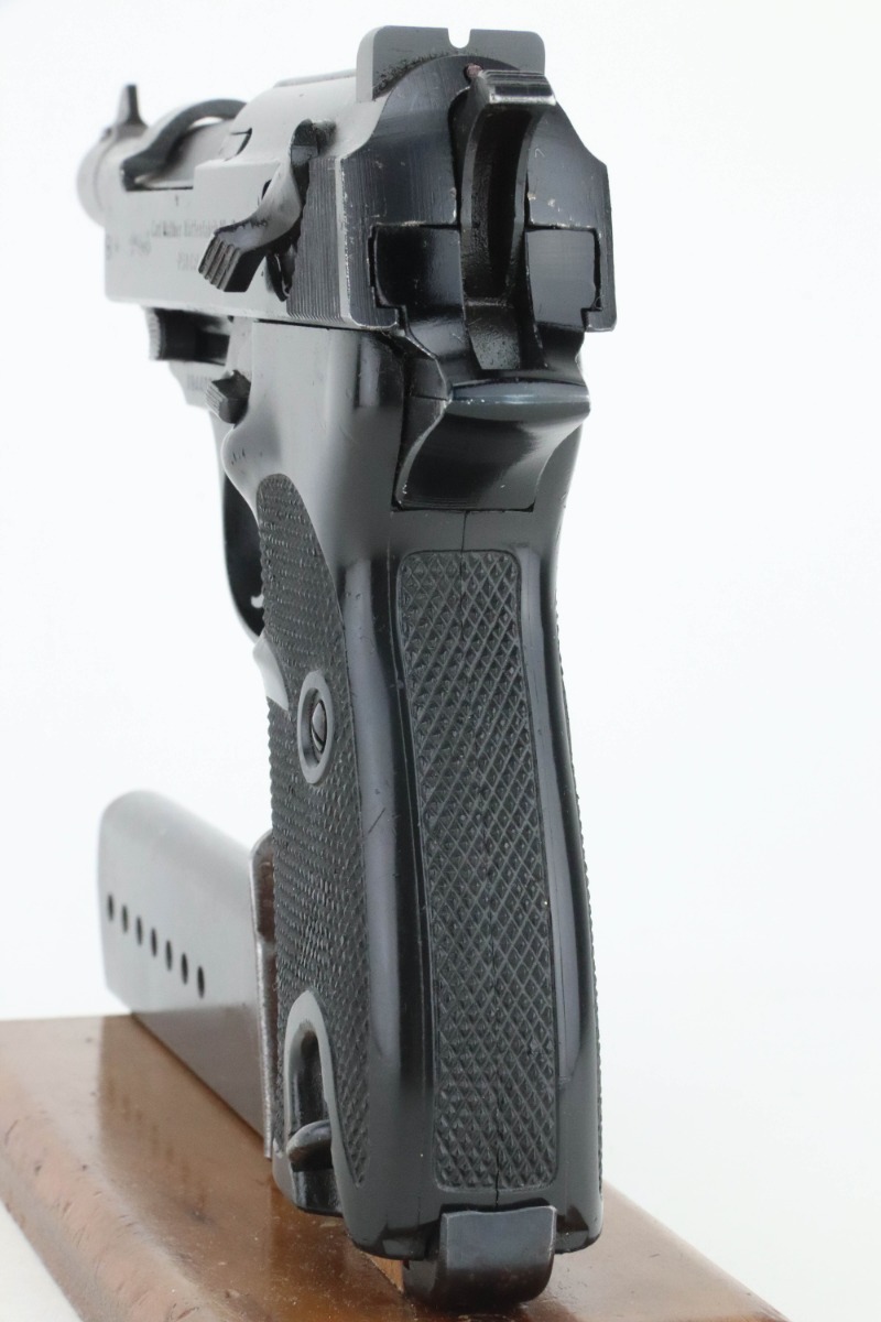 9/5/24 – This is an excellent example of a Walther P.38 from 1960. It is matching, but there is an import mark on the underside of the slide. There is very little actual finish loss, but there are light surface scratches and scuffs throughout. Fitted with black plastic grips and comes with one magazine. Mint bore. De-cocker is functional.