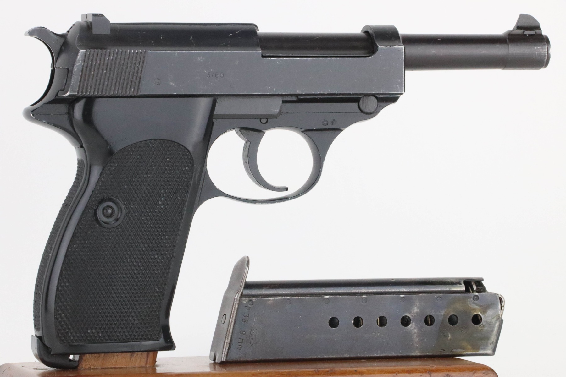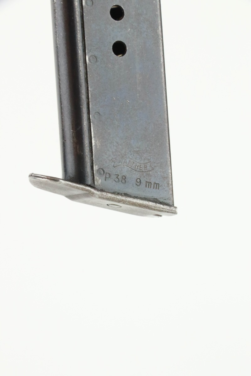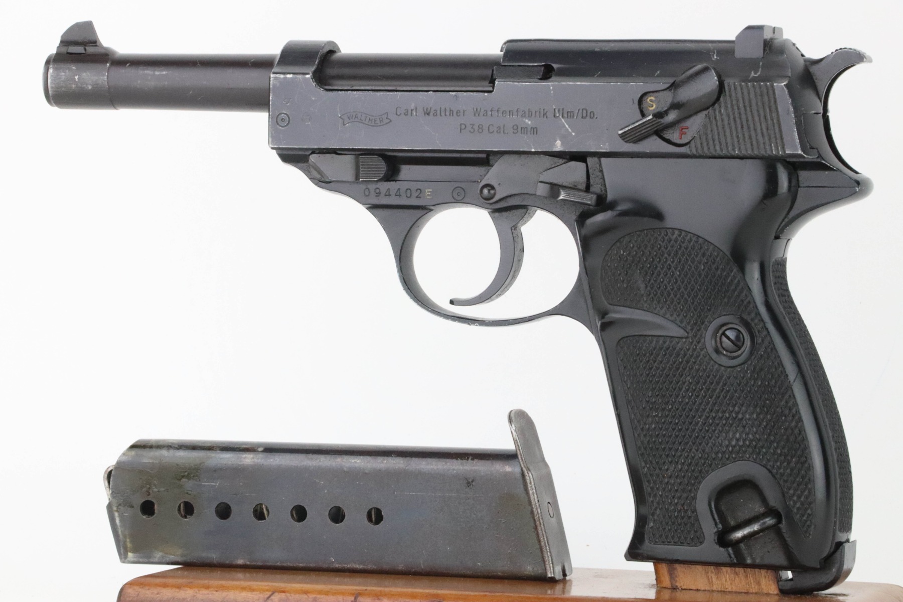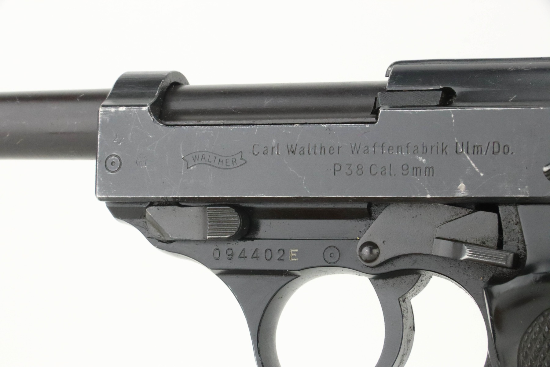 9/5/24 – This is an excellent example of a Walther P.38 from 1960. It is matching, but there is an import mark on the underside of the slide. There is very little actual finish loss, but there are light surface scratches and scuffs throughout. Fitted with black plastic grips and comes with one magazine. Mint bore. De-cocker is functional.