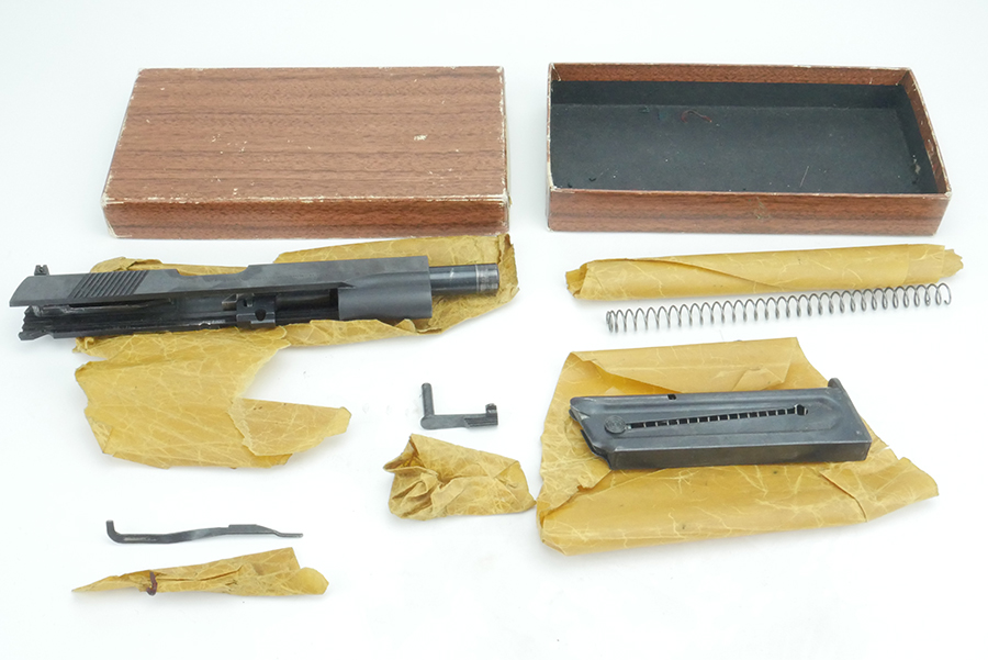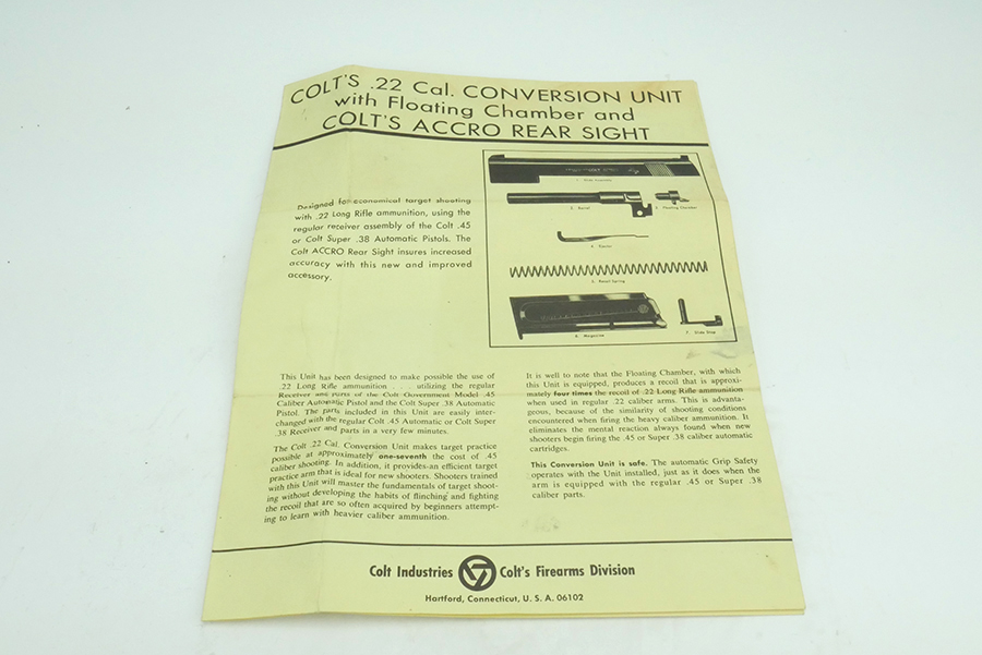 5/30/24 – This is a .22 Caliber Conversion Unit for a Colt Government Model, circa 1960’s. It comes with its original box, owners manual, original wax paper, slide, barrel, ejector, slide stop, recoil spring, and magazine. Mint condition with a mint bore.