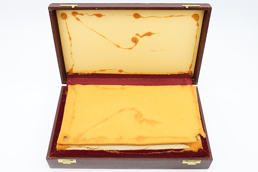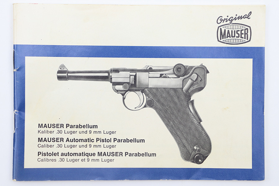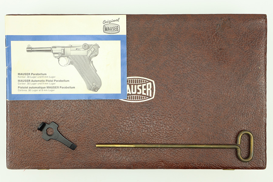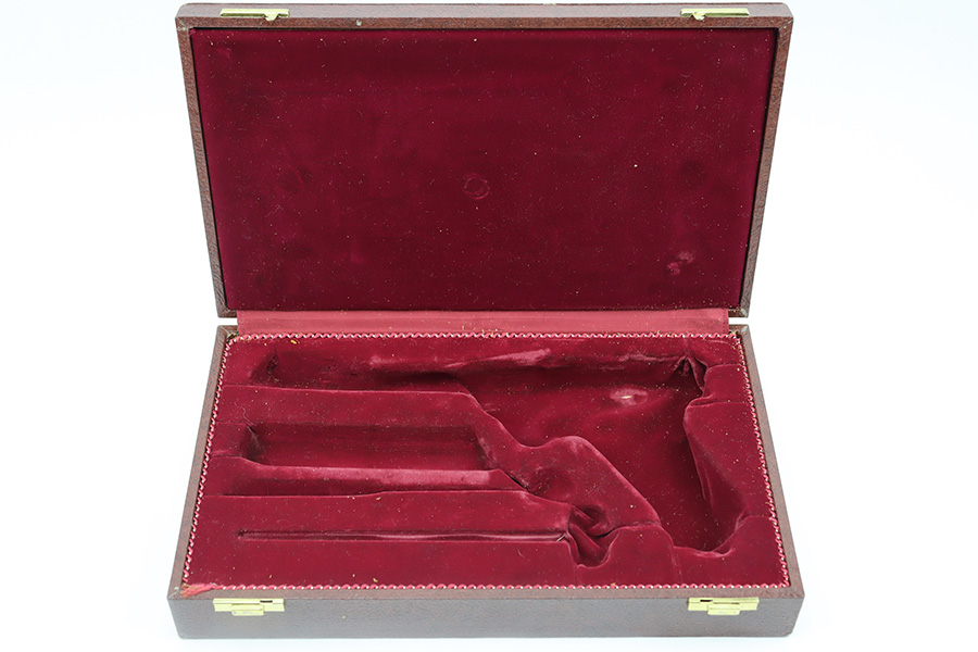 11/20/23 – This is a post WW2 production commercial Mauser Luger pistol presentation case. The case comes with an original Mauser factory, post WW2 pistol manual, cleaning rod, and luger takedown tool. The pieces are all in excellent condition as shown. The case has an excellent exterior, but the interior has some light wear from use. The interior lid portion of the padding has come apart due to the glue weakening with age. The red velvet liner is still excellent and intact, but the foam underneath is starting to shed slightly, which is common. The photos show this separation with the glue residue visible on the case shell. Still a very nice display piece and fairly uncommon find.