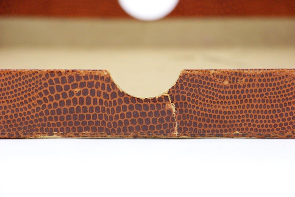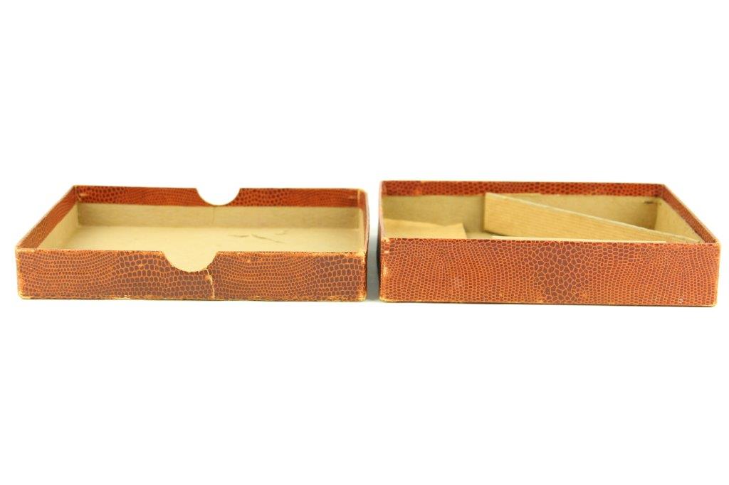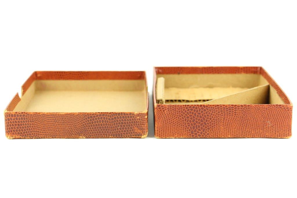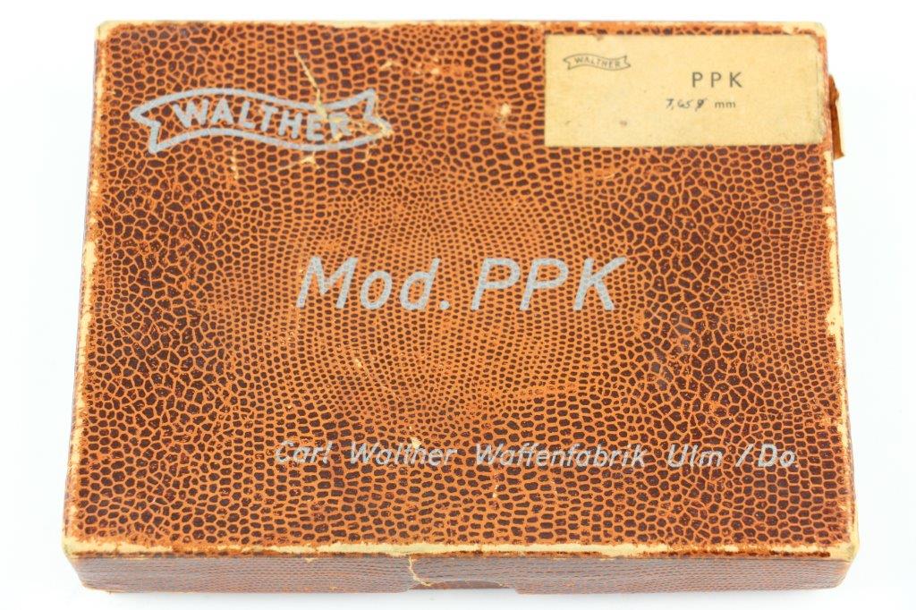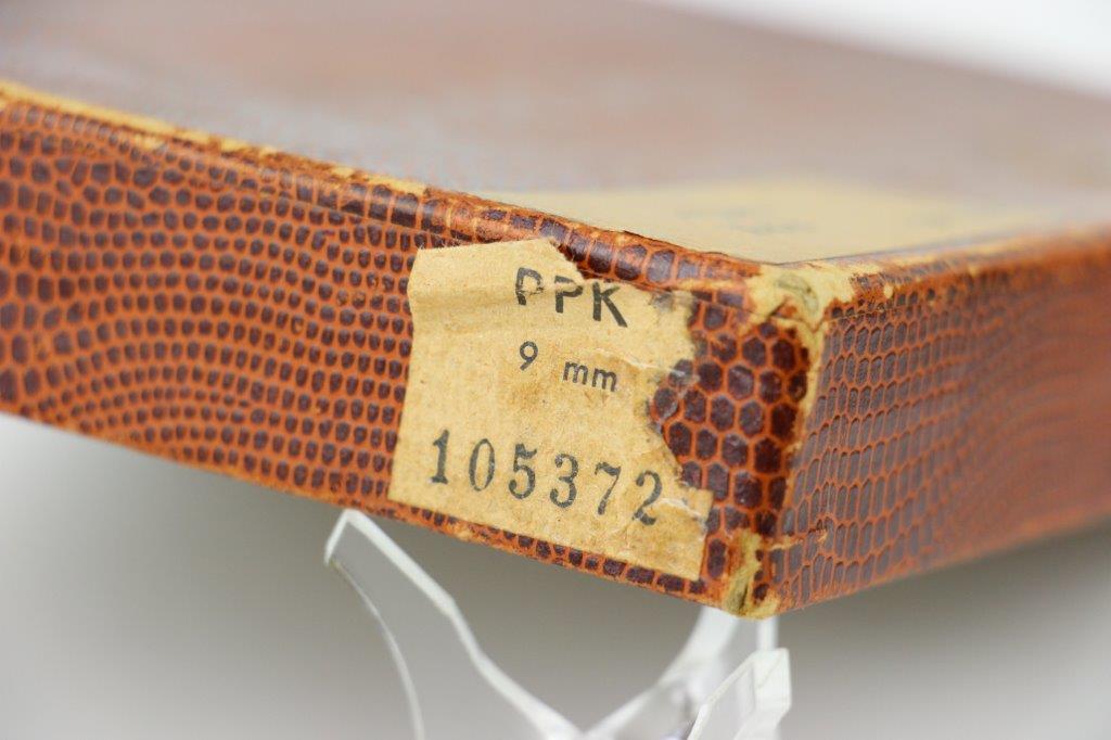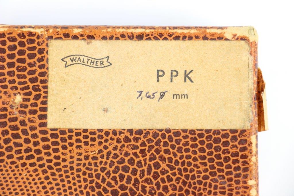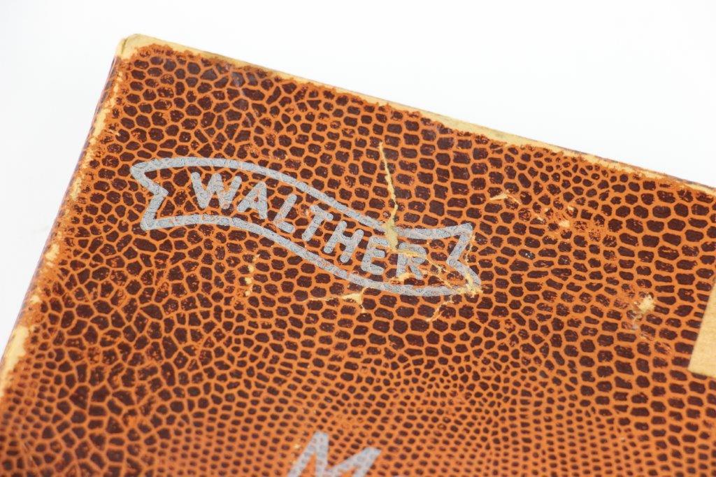 8/6/24 – This is an original 1960’s production Walther PPK pistol box. The box has a faux alligator skin exterior that’s in very good condition. Some light scuffing along the edges which is typical. The cardboard is cracking near the “R” in the Walther banner on the front upper left corner. The upper right corner has the original label intact, although the caliber has been crossed out in pen as shown. The side label is somewhat tattered but the markings and serial number is clearly visible. Excellent interior with original divider intact.