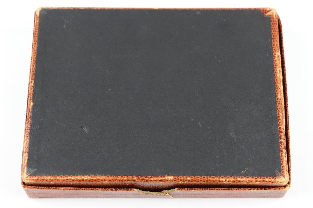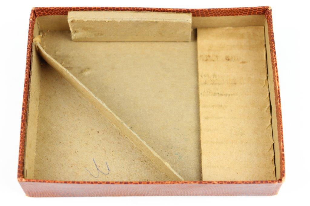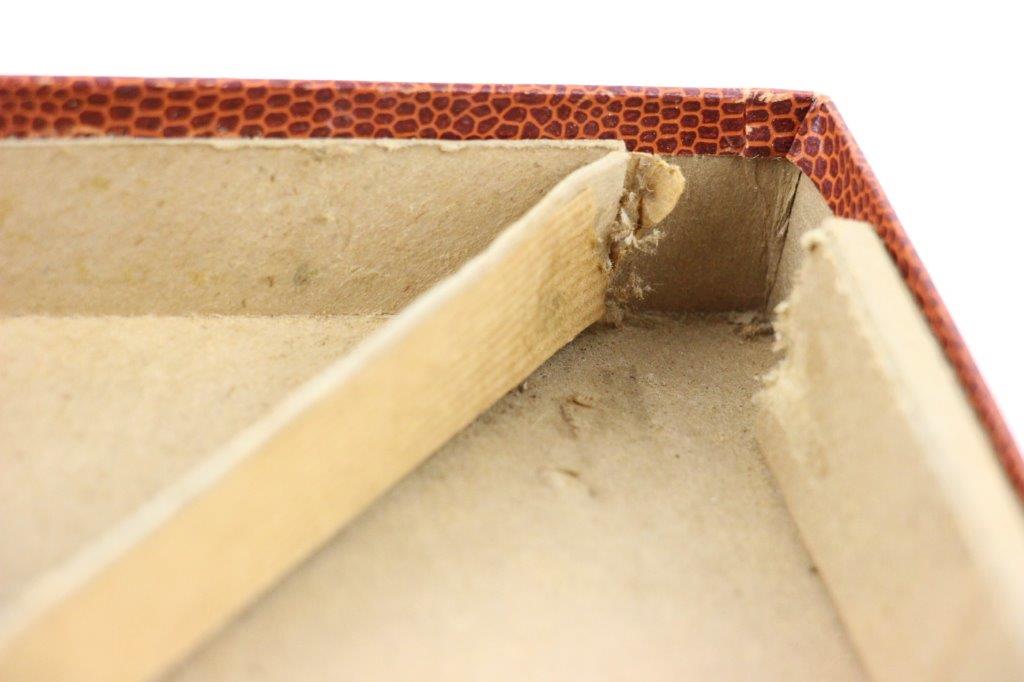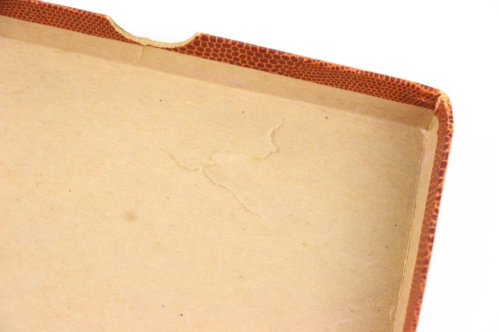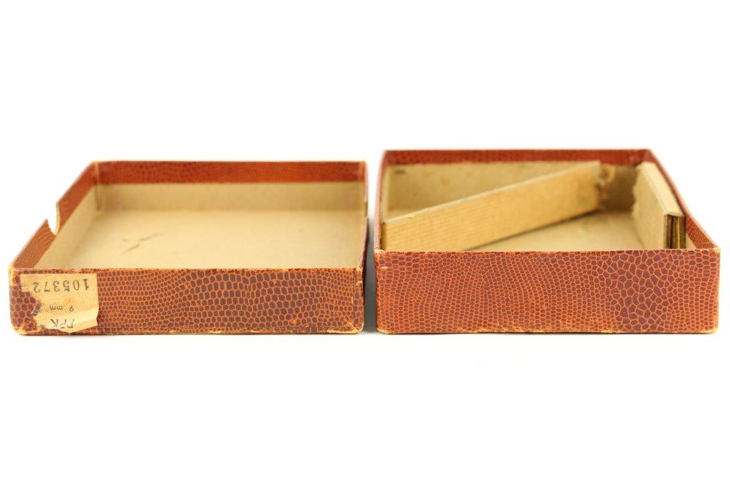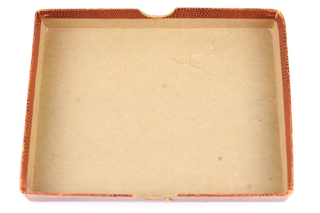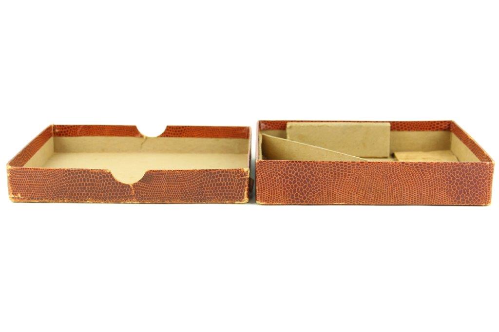 8/6/24 – This is an original 1960’s production Walther PPK pistol box. The box has a faux alligator skin exterior that’s in very good condition. Some light scuffing along the edges which is typical. The cardboard is cracking near the “R” in the Walther banner on the front upper left corner. The upper right corner has the original label intact, although the caliber has been crossed out in pen as shown. The side label is somewhat tattered but the markings and serial number is clearly visible. Excellent interior with original divider intact.